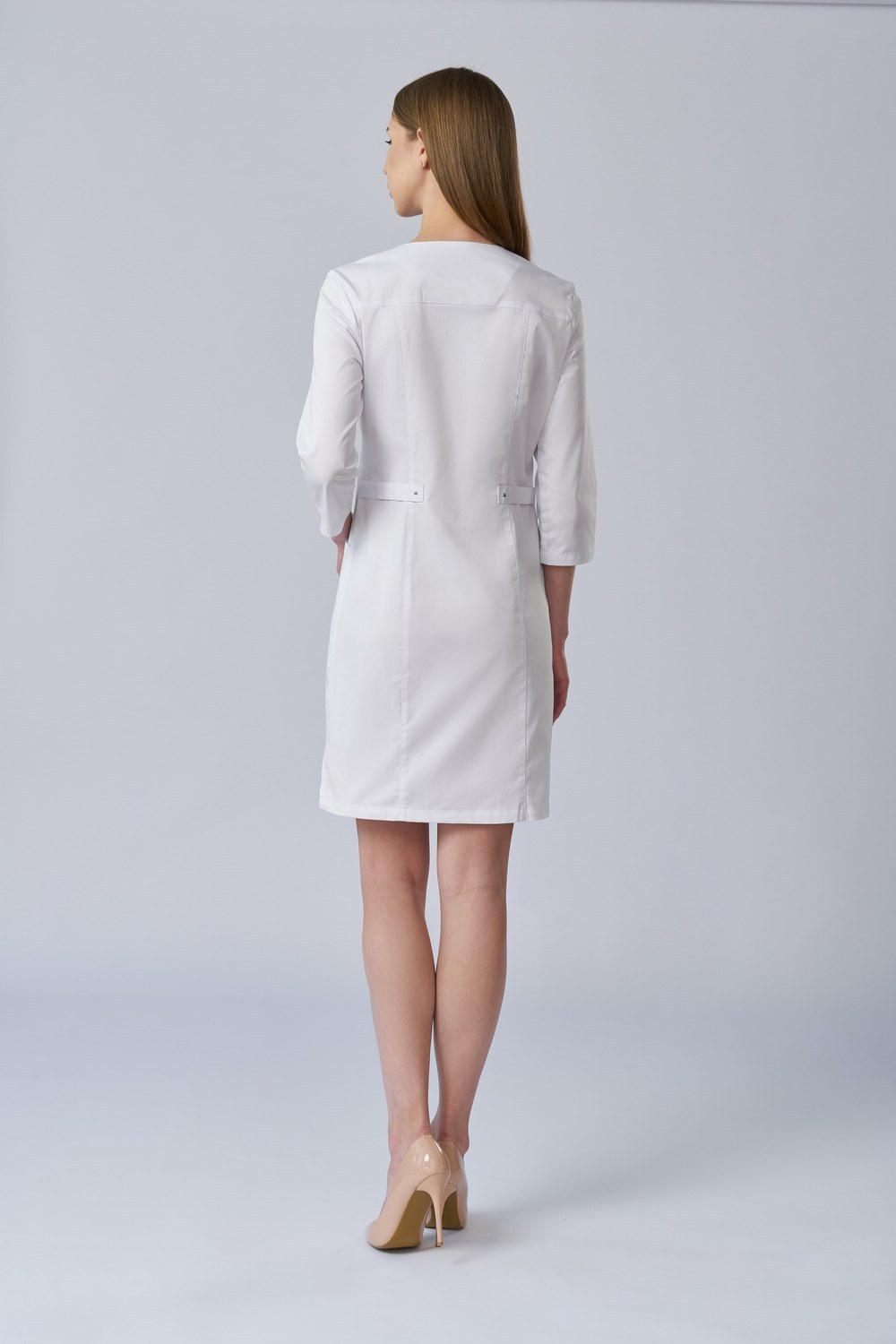 Полочка с отрезной кокеткой, рельефами от кокетки до низа и отрезной планкой от кокетки, не доходящей до низа изделия. Застежка на планке на 7 закрытых внопок. В нижнем срезе кокетки имеются декоративные планки с хольнитеном на конце. Имеются боковые карманы. По верхнему срезу бок кармана вставлена пата с хольнитеном.