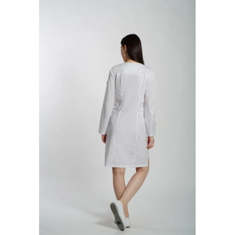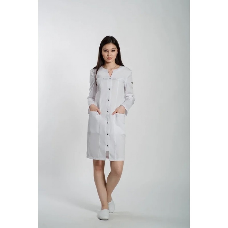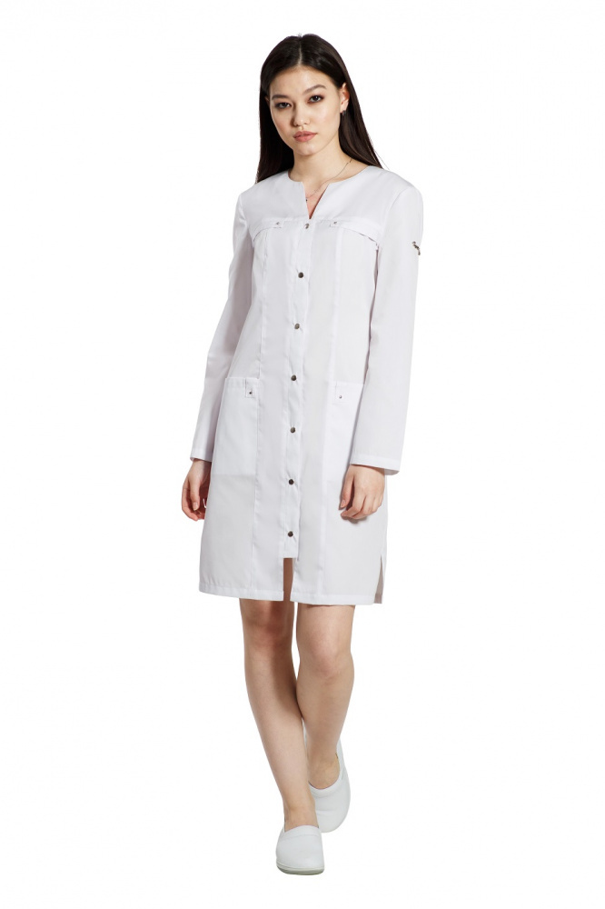 Полочка с отрезной кокеткой, рельефами от кокетки до низа и отрезной планкой от кокетки, не доходящей до низа изделия. Застежка на планке на 7 закрытых внопок. В нижнем срезе кокетки имеются декоративные планки с хольнитеном на конце. Имеются боковые карманы. По верхнему срезу бок кармана вставлена пата с хольнитеном.
