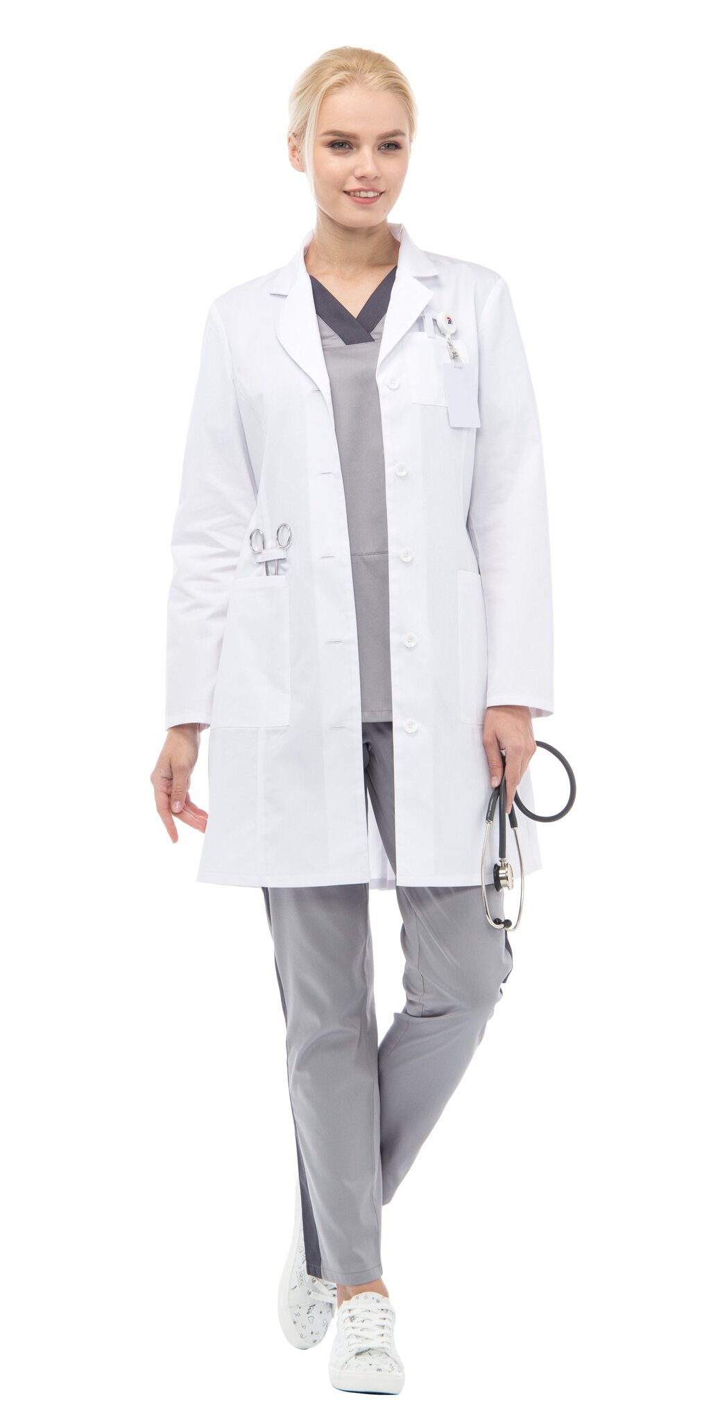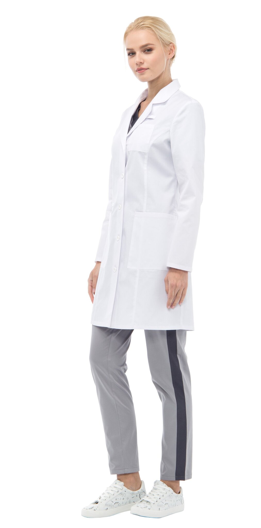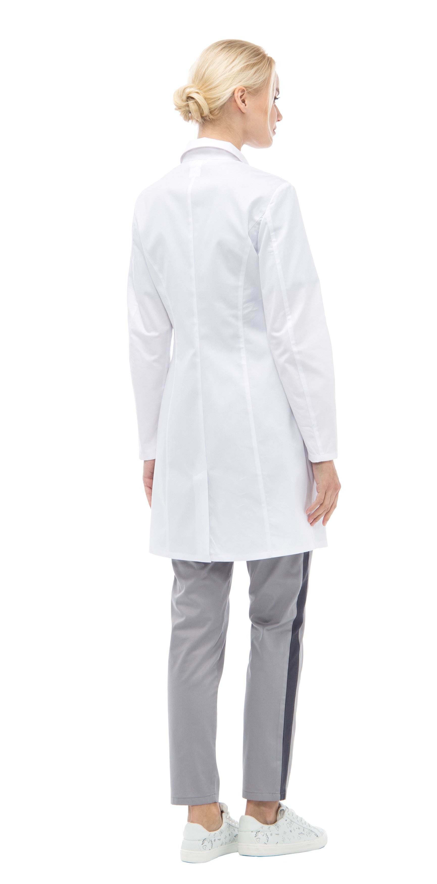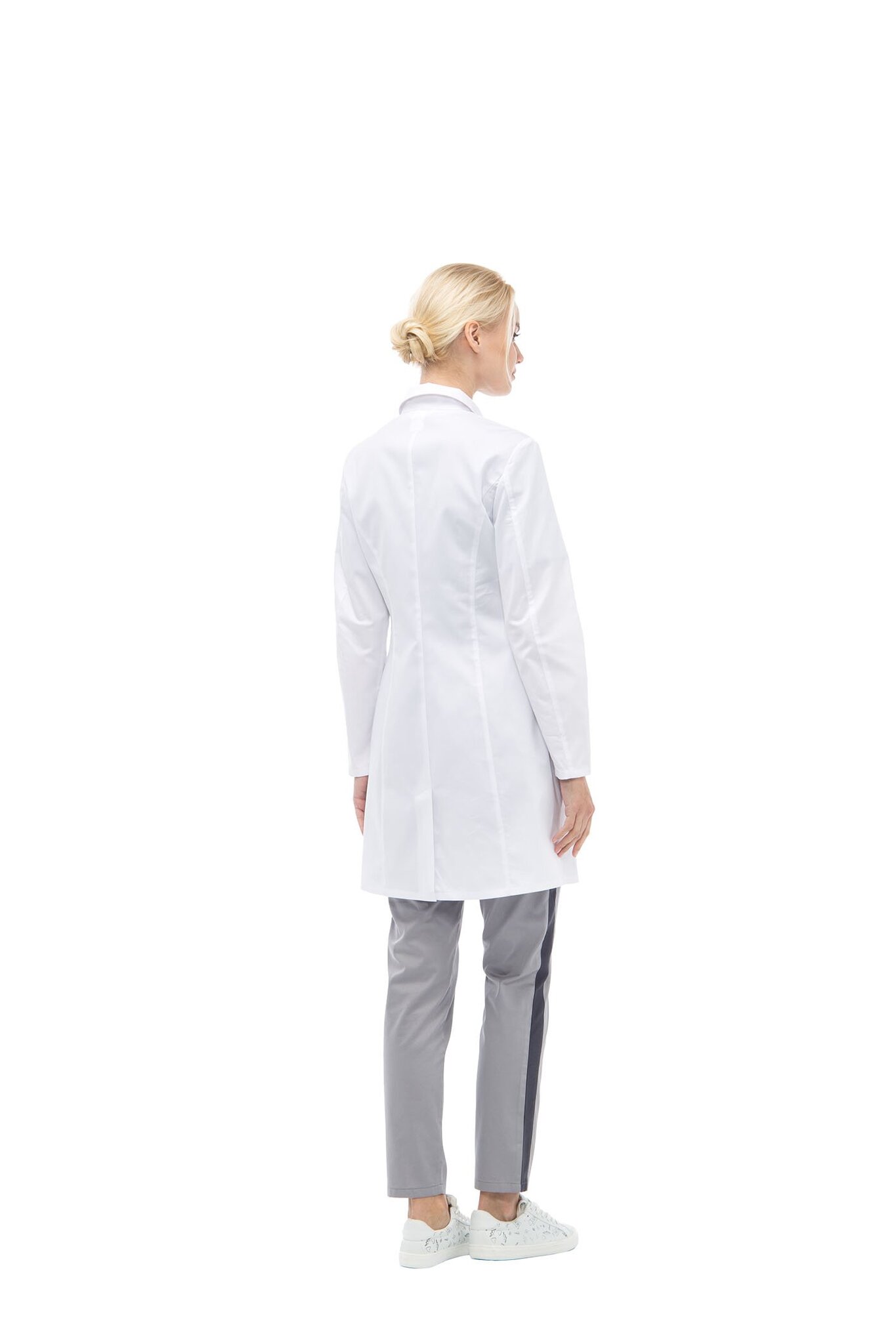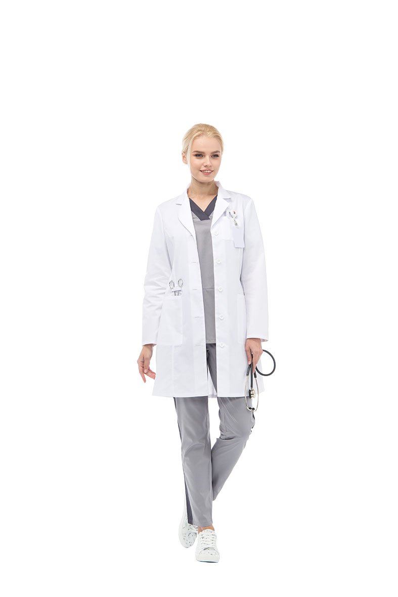 Халат полуприлегающего силуэта типа «Lab coat», с центральной застежкой на пуговицы, длиной ниже середины бедра. Воротник отложной с лацканами. По переду и спинке вертикальные рельефы от проймы. Нагрудный маленький карман для крепления бейджа со шлевкой. В нижней части переда накладные карманы, с отделением для медицинских инструментов. По низу среднего шва спинки - шлица. Рукава втачные длинные двухшовные.