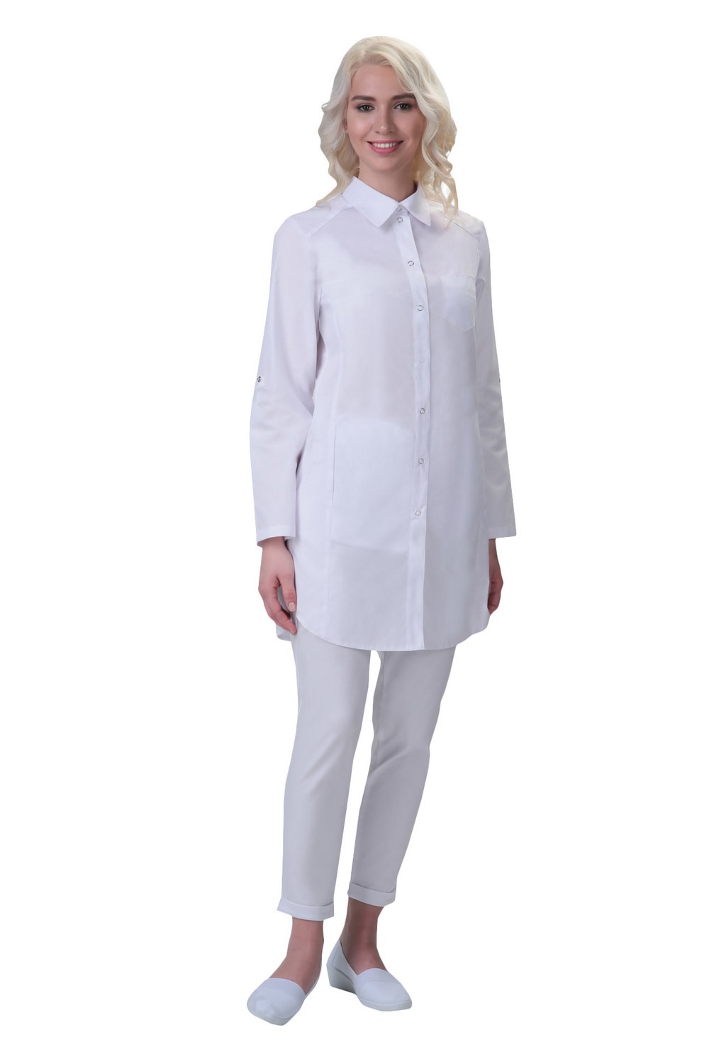 Медицинский халат-рубашка с рукавом-трансформером отлично подойдет студентам медицинских учреждений. Халат можно носить как отдельно, так и комбинировать с брюками.