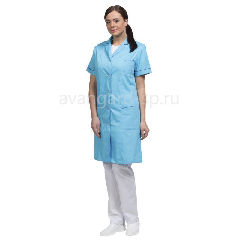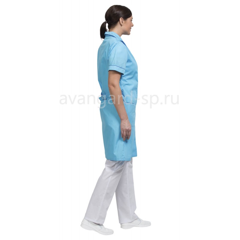 Отложной воротник с закругленными концами, рукава короткие, накладные карманы с фигурным входом и манжеты подчеркнуты васильковым кантом.