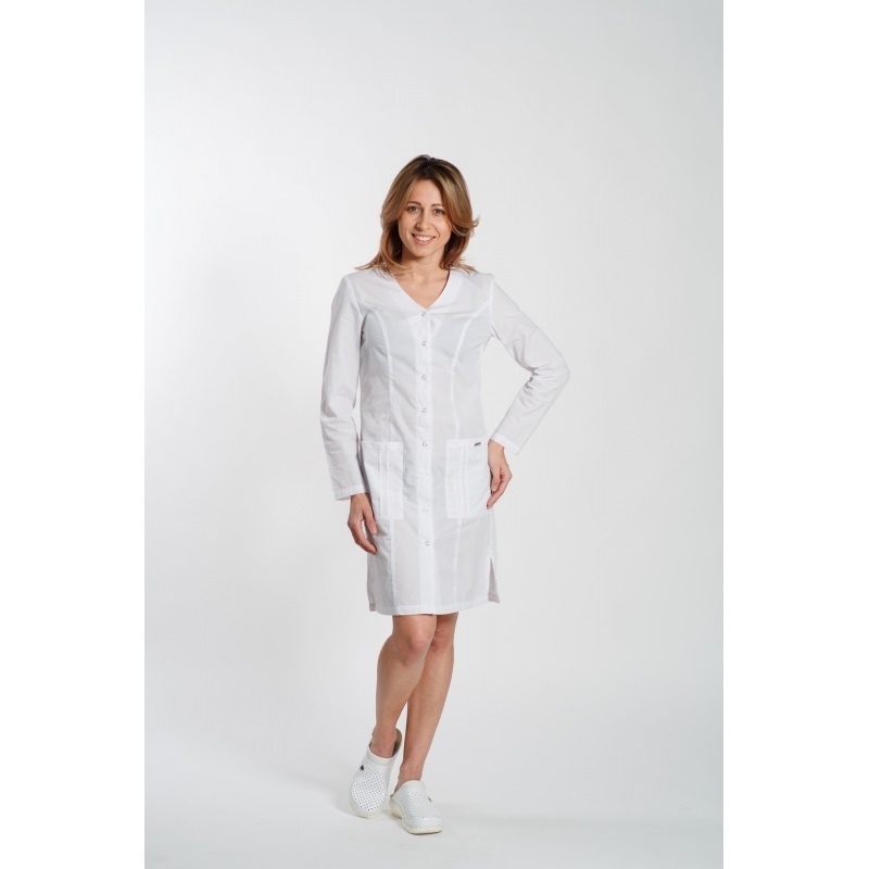 Халат женский, полуприлегающего силуэта, с застежкой по борту на восемь открытых кнопок, с разрезами в боковых швах.