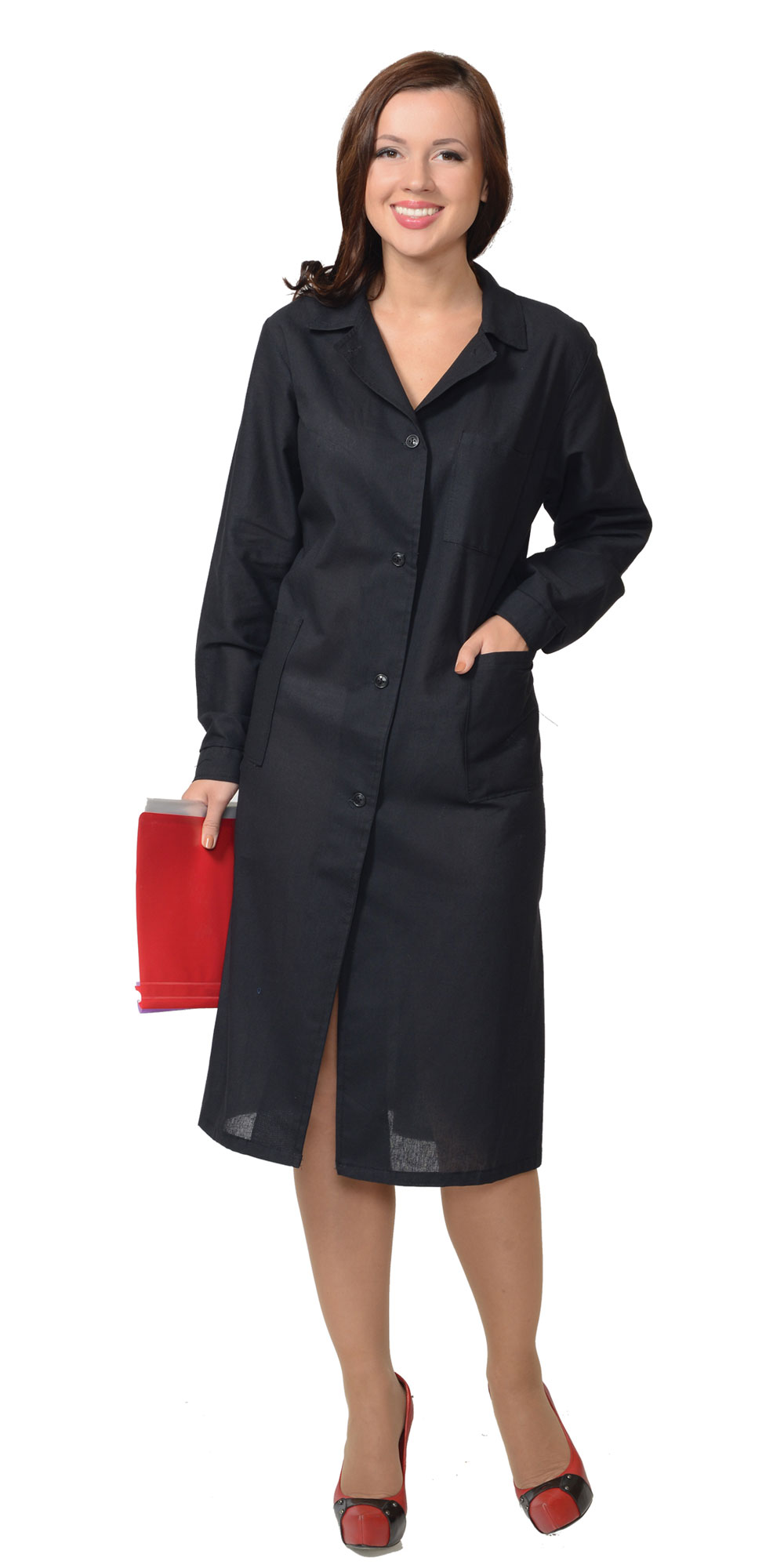 Халат женский. Отложной воротник, застёжка на пуговицы, два кармана. Манжеты рукавов на пуговице. По талии спинки - хлястик.