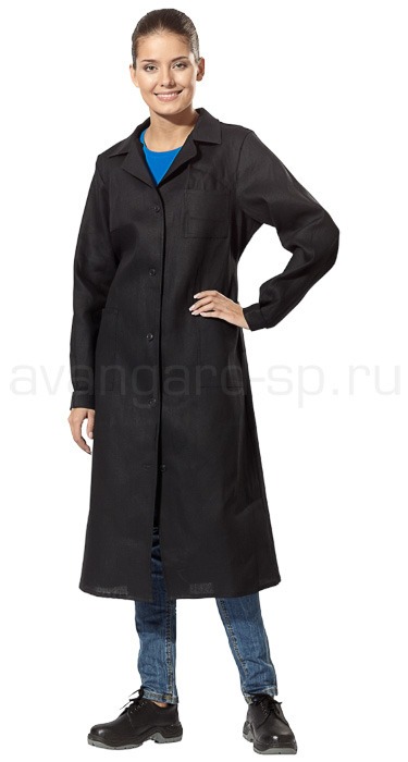 Модель классическая, для работников технического персонала, пищевой и перерабатывающей промышленности. Халат с центральной бортовой застежкой на пуговицы, отложным воротником, накладными карманами. Рукав длинный на манжете.