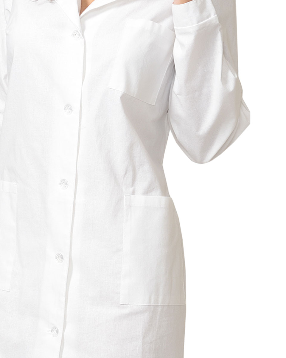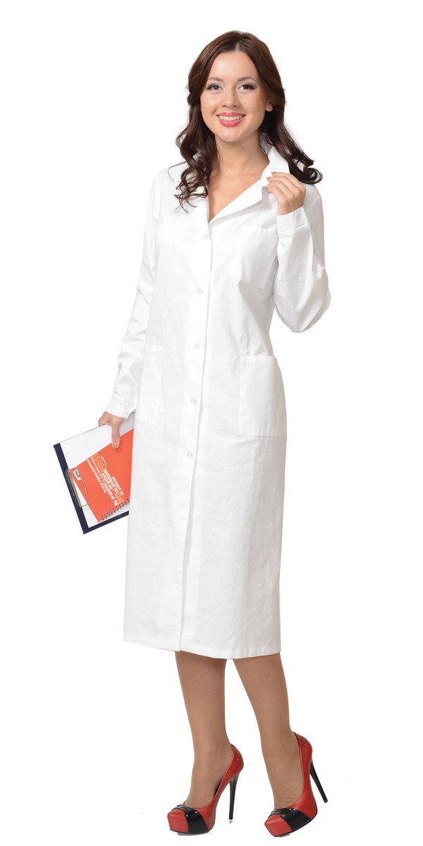 Халат женский. Отложной воротник, застёжка на пуговицы, два кармана. Манжеты рукавов на пуговице. На спинке - хлястик.
