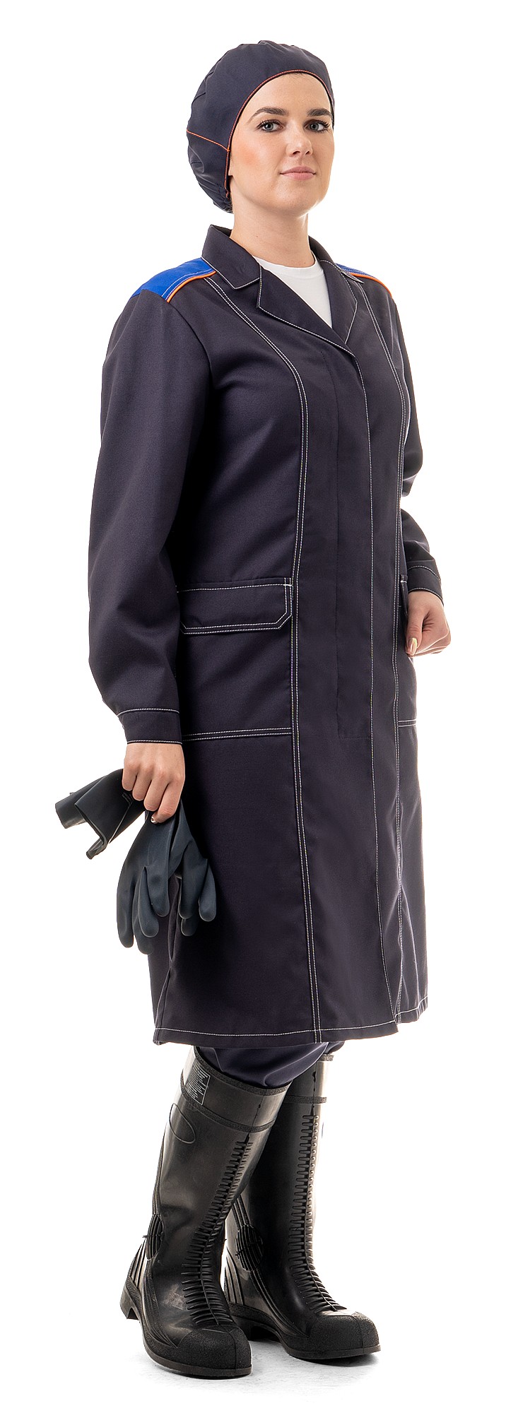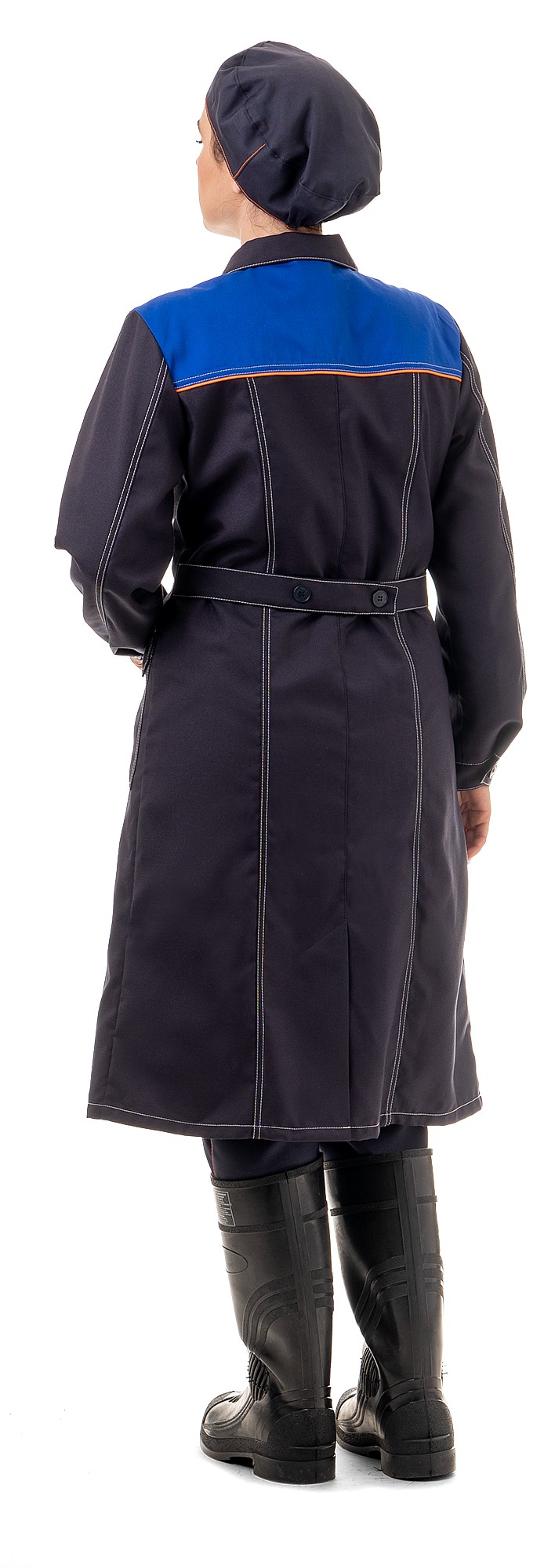 Халат полуприлегающего силуэта с рельефами, с центральной потайной застежкой на пуговицы, со шлицей на спинке и хлястиком с пуговицами для регулирования объема. Рукава с манжетами на пуговицах предотвращают попадание ткани в механизмы. Накладные боковые карманы с клапанами на пуговицу.