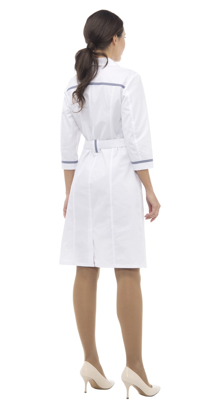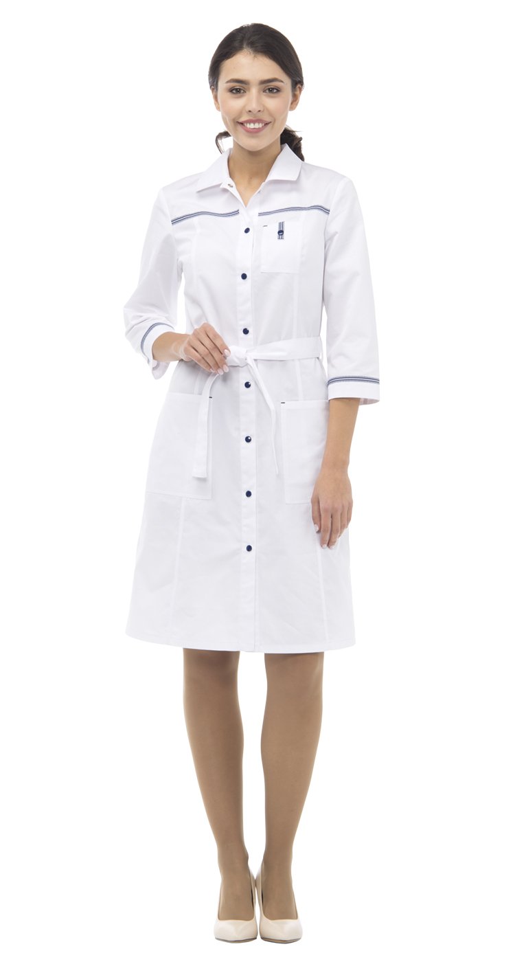 Халат полуприлегающего силуэта, с центральной застежкой на кнопки, длиной до середины колена. Воротник стояче-отложной. По верху переда и спинки горизонтальные кокетки с декоративной тесьмой и вертикальные рельефы. Нагрудный маленький карман для крепления бейджа. В нижней части переда накладные карманы. По талии - пояс со шлевками для регулировки объема. По низу среднего шва спинки - шлица. Рукава втачные, длиной ¾ с манжетами и декоративной тесьмой.