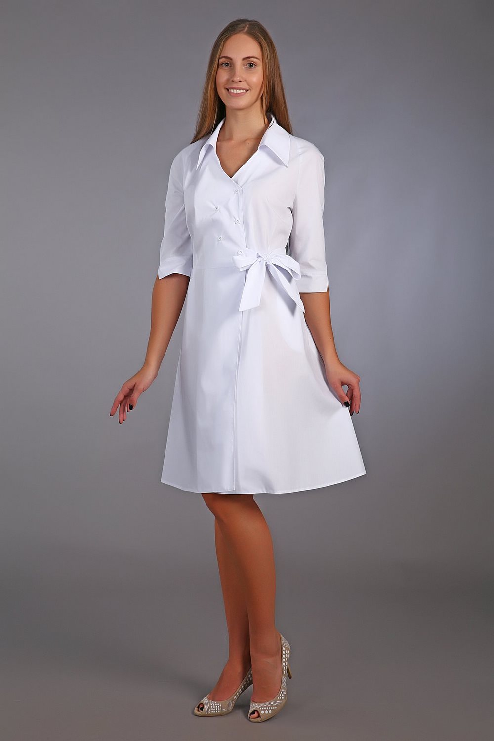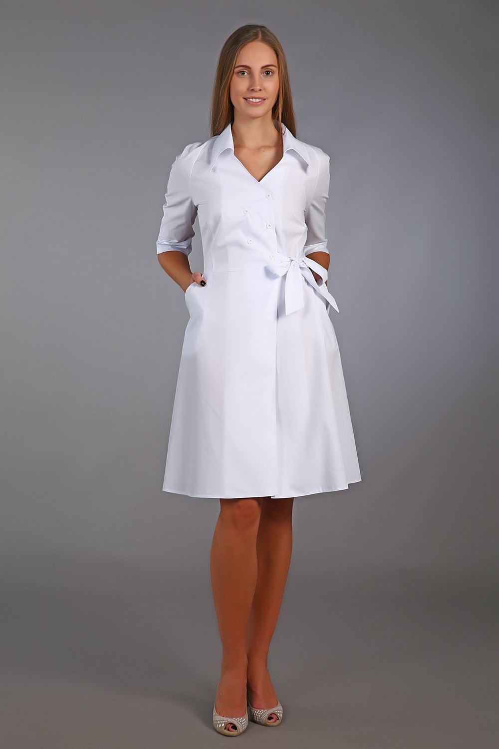 Халат медицинский женский приталенного силуэта, отрезной по линии талии с расклешенной юбкой. Застежка запашная фиксируется кнопками и завязывающимся поясом. Воротник отложной. Имеются два боковых кармана. Рукав реглан, длинна 3/4.