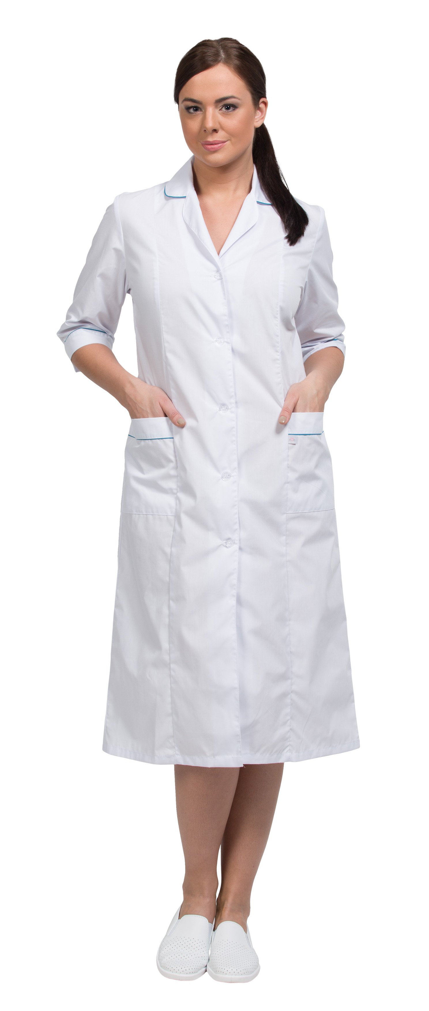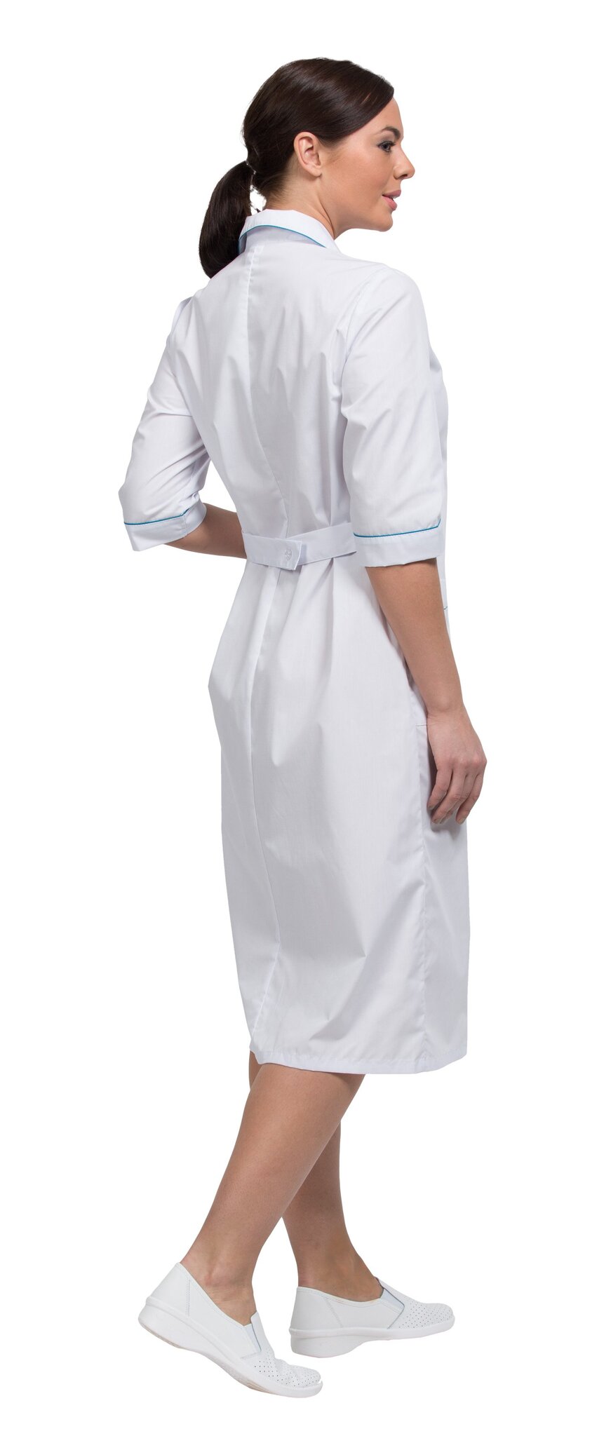 Халат с вертикальными рельефами, центральной бортовой застежкой на пуговицы, отложным воротником, накладными карманами и рукавом.