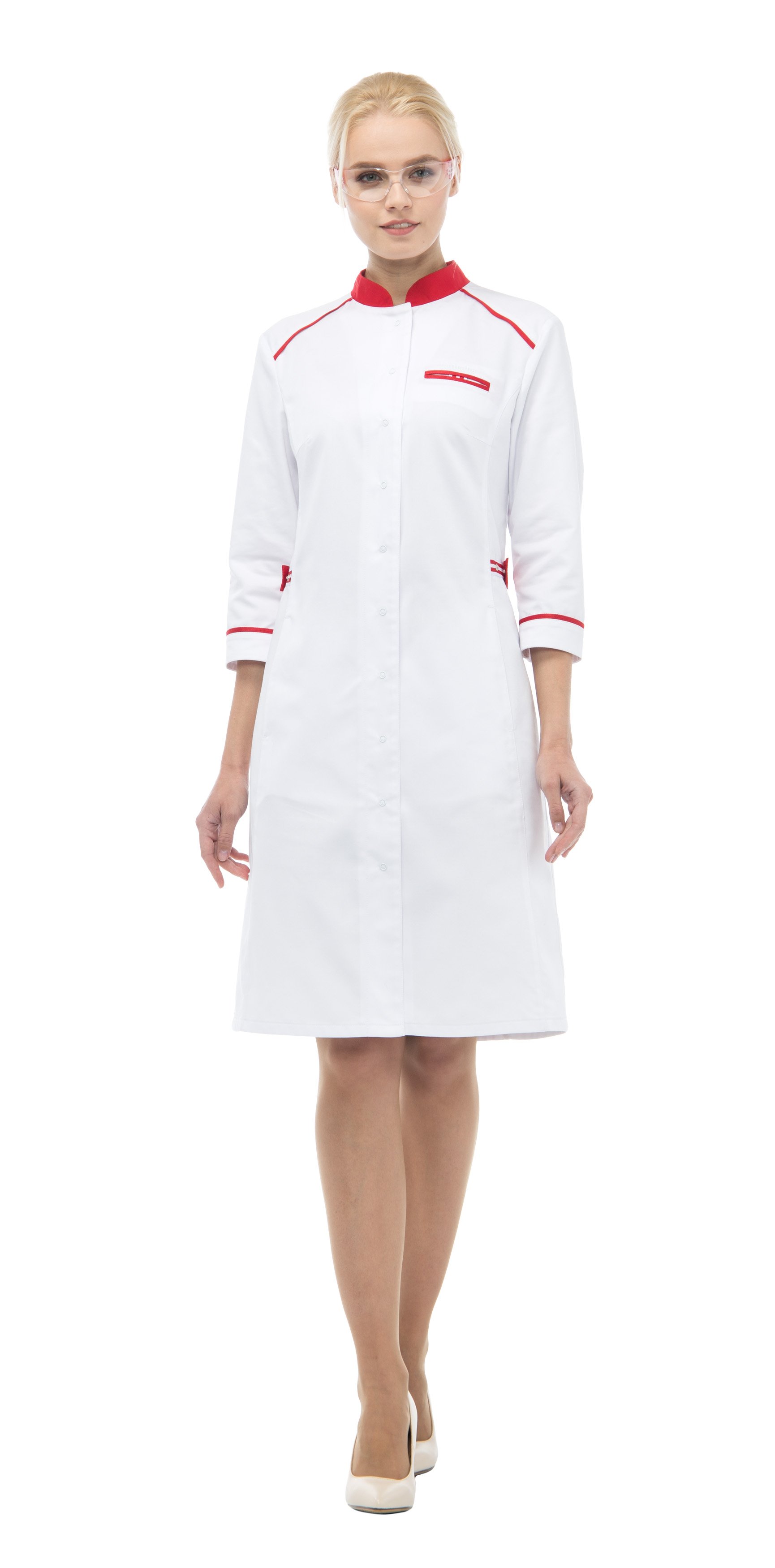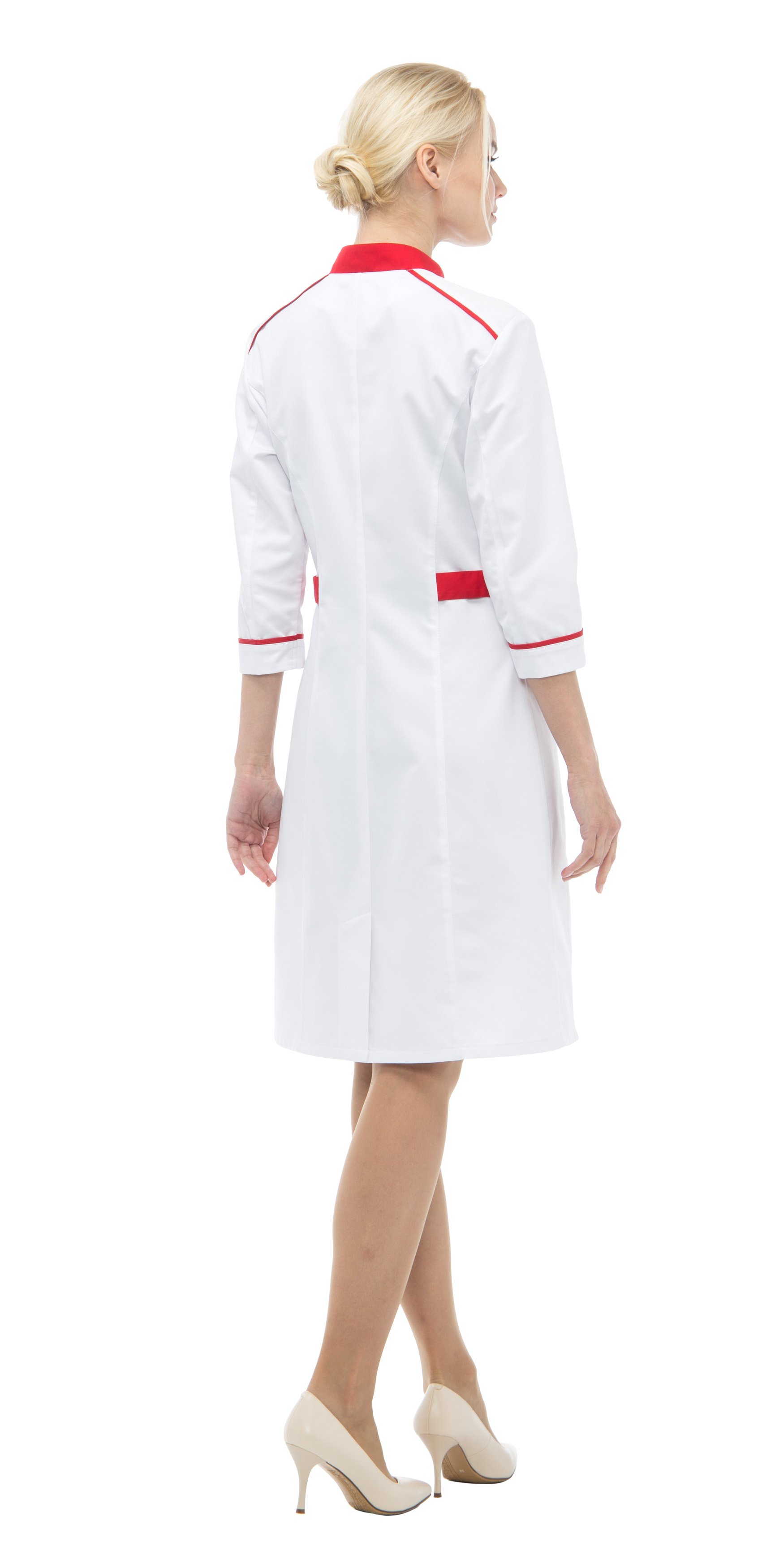 Халат прилегающего силуэта, с центральной застежкой на кнопки, длиной до середины колена. Воротник – стойка из отделочной ткани. На плечах кокетки с отделочным кантом. По переду и спинке вертикальные рельефы от проймы. Нагрудный маленький карман для крепления бейджа. В нижней части переда карманы в швах. По талии хлястики с кнопками для регулировки объема и декоративная тесьма. По низу среднего шва спинки - шлица. Рукава втачные, длиной ¾ с манжетами и отделочным кантом по низу.
