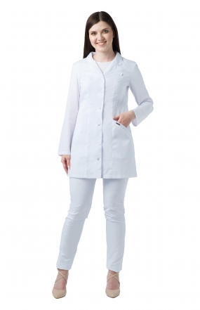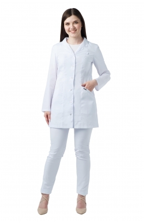 Халат женский медицинский укороченный полуприлегающего силуэта с центральной бортовой застежкой на 6 кнопок.