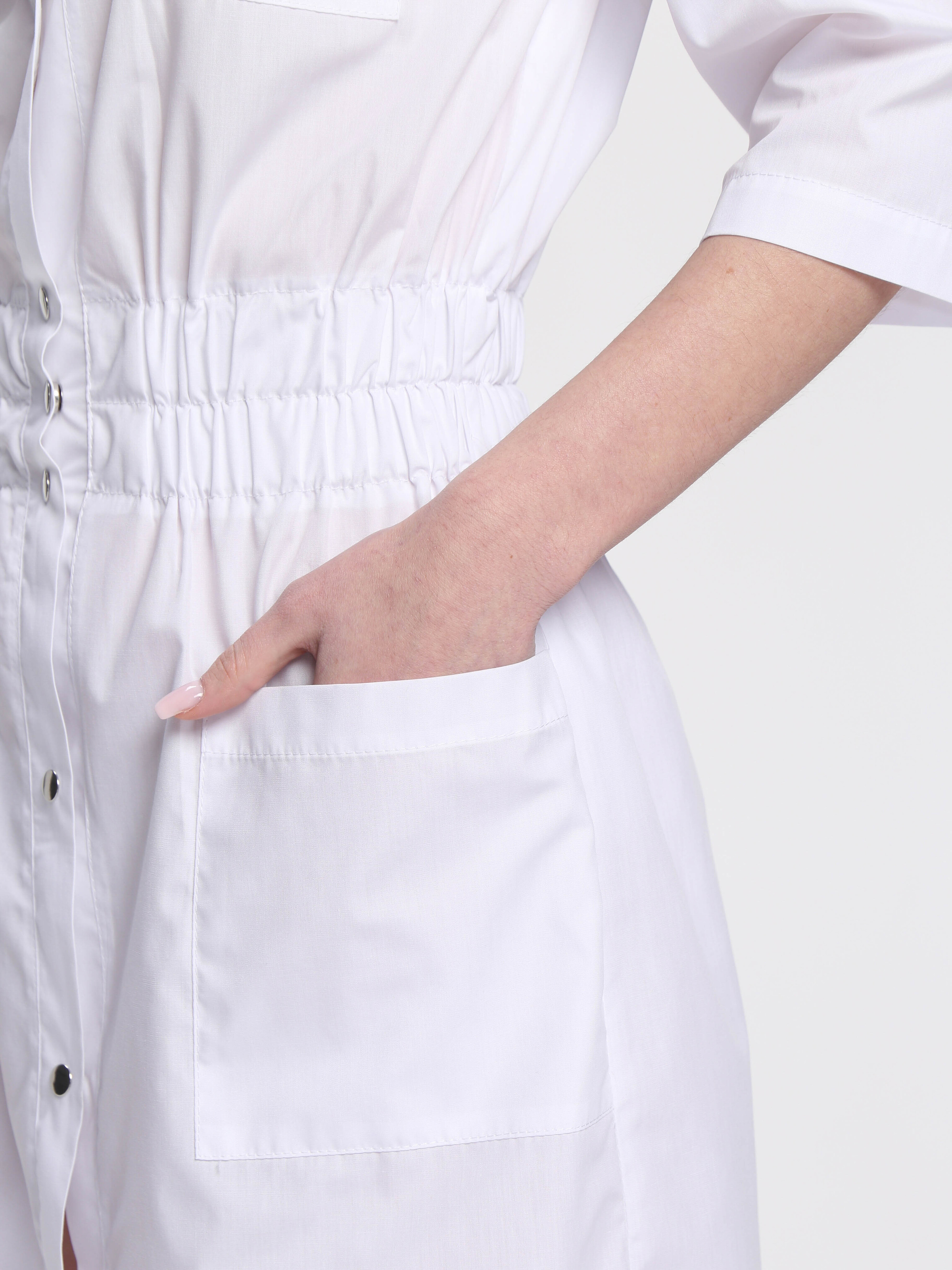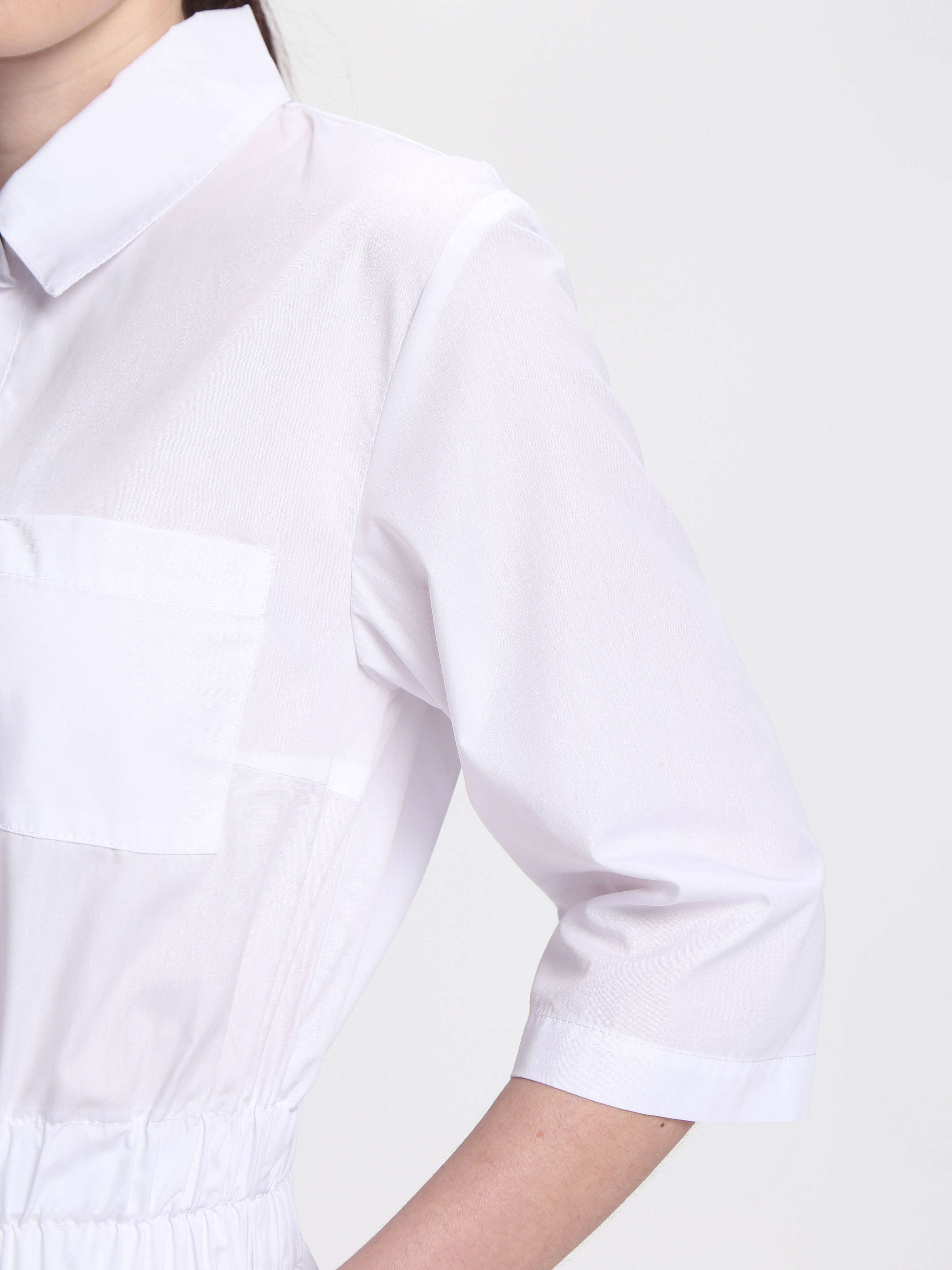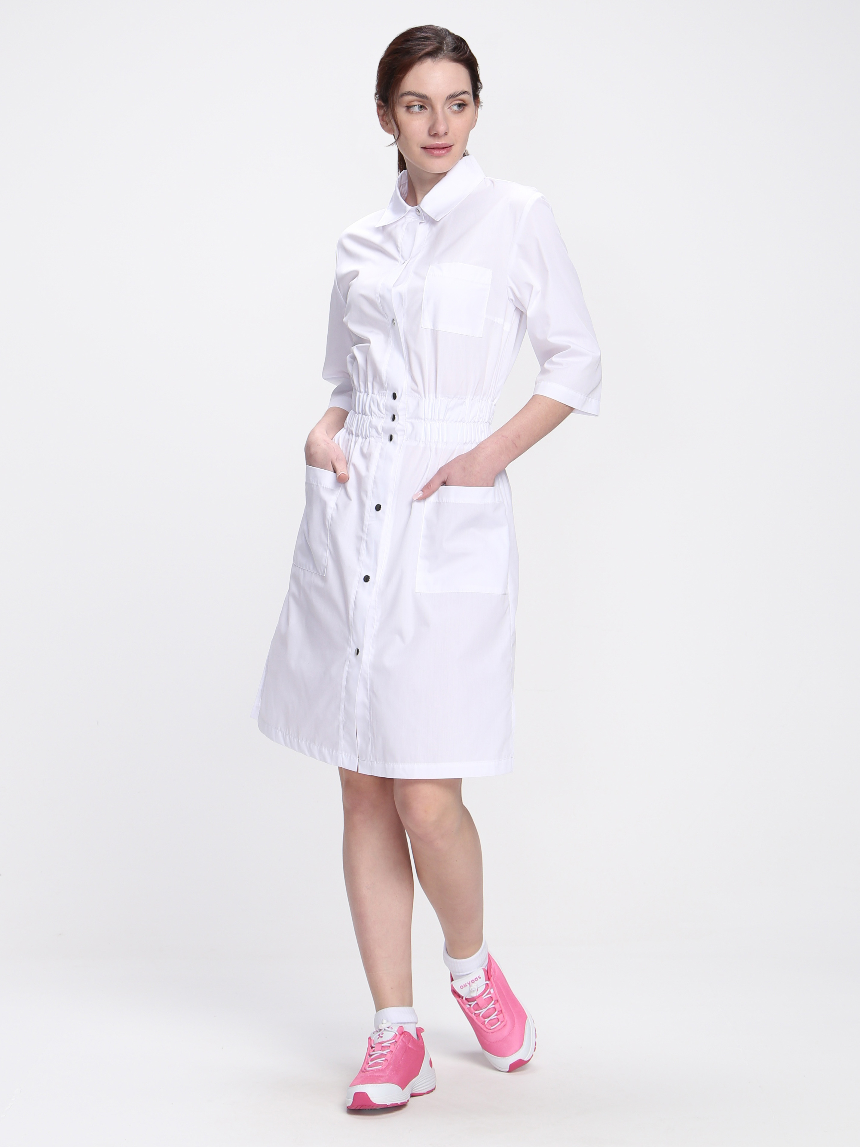 Полочка цельнокроеная, на левой детали переда и нижних частях бочков расположены накладные карманы, вход в карманы обработаны в подгибку с закрытым срезом, баковые карманы одним срезом входят в боковой шов.