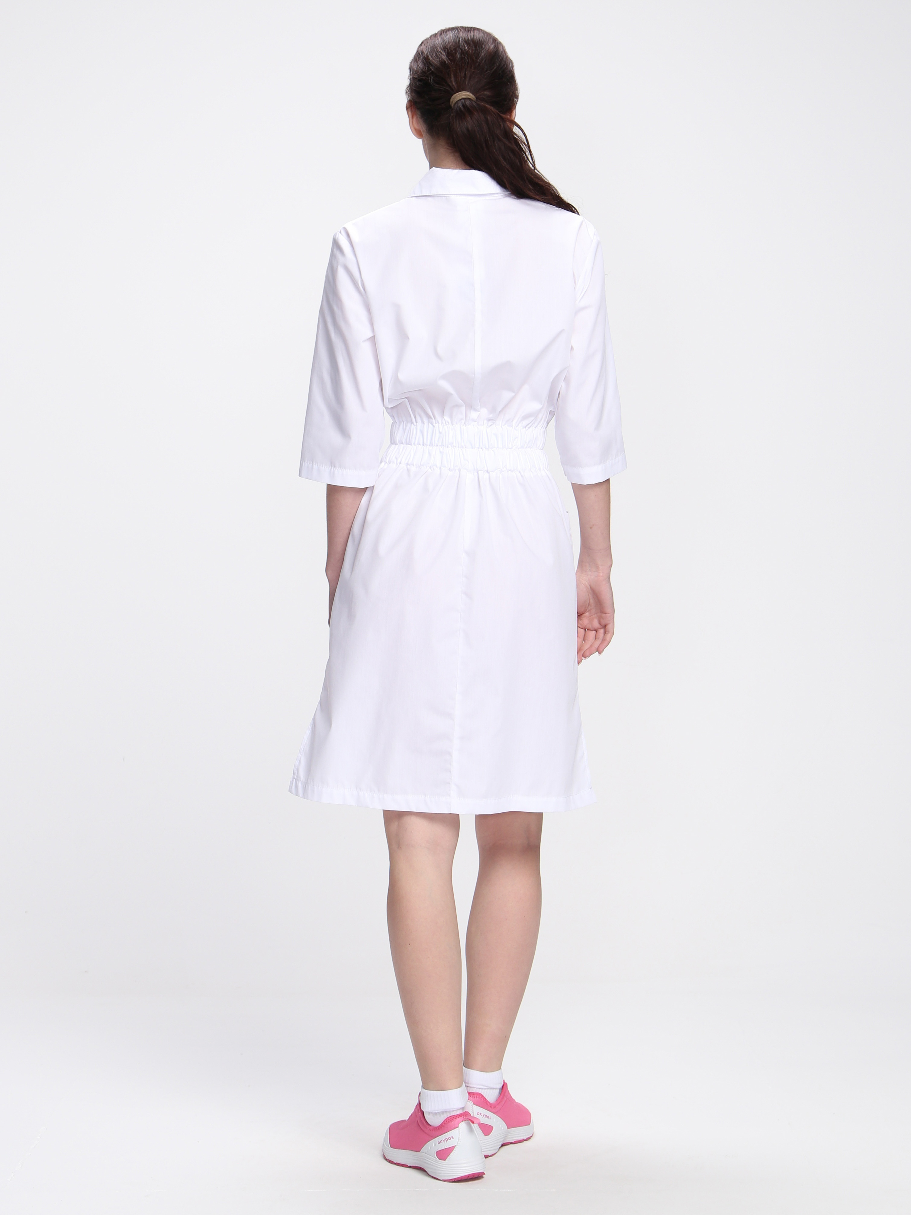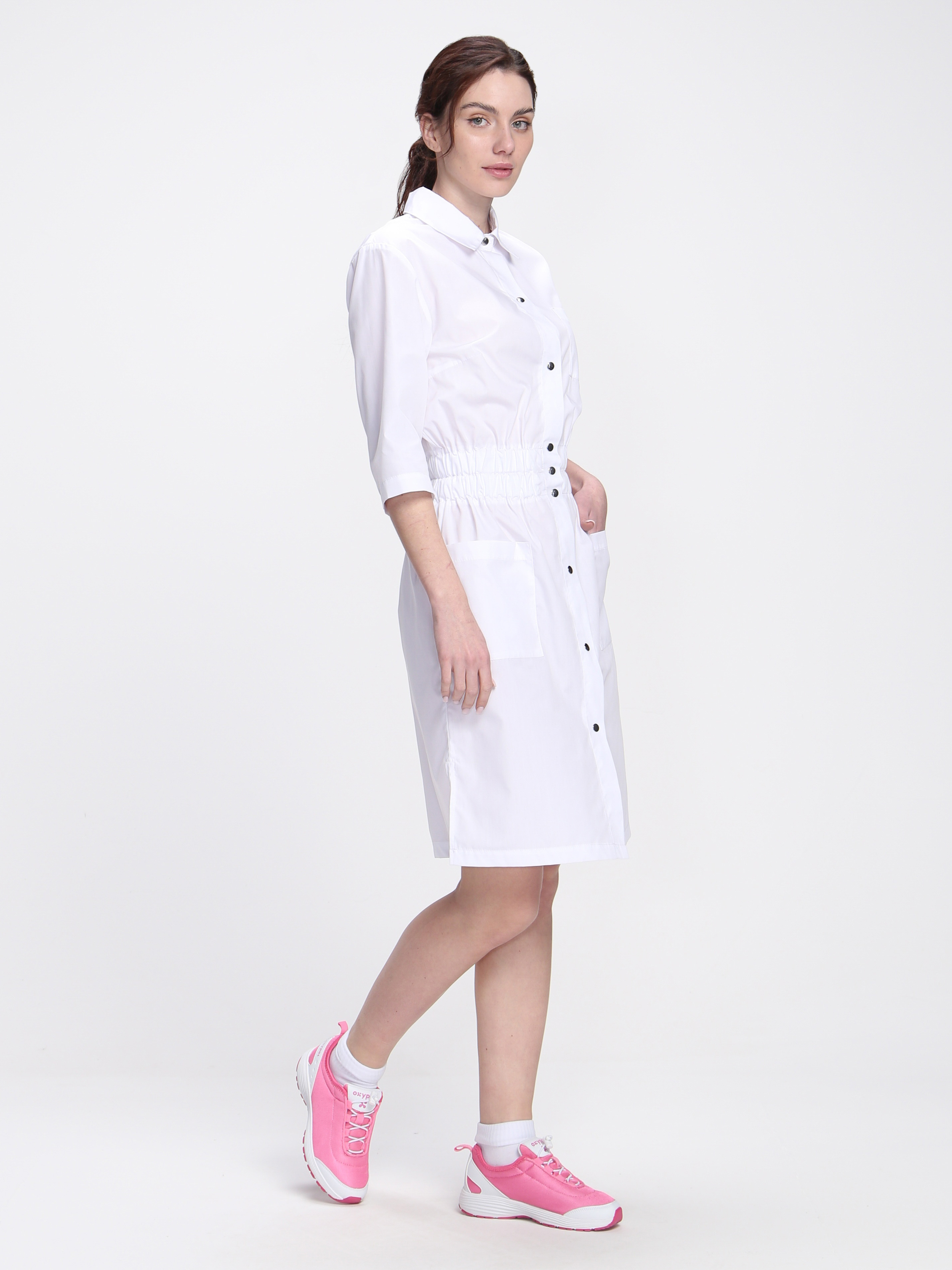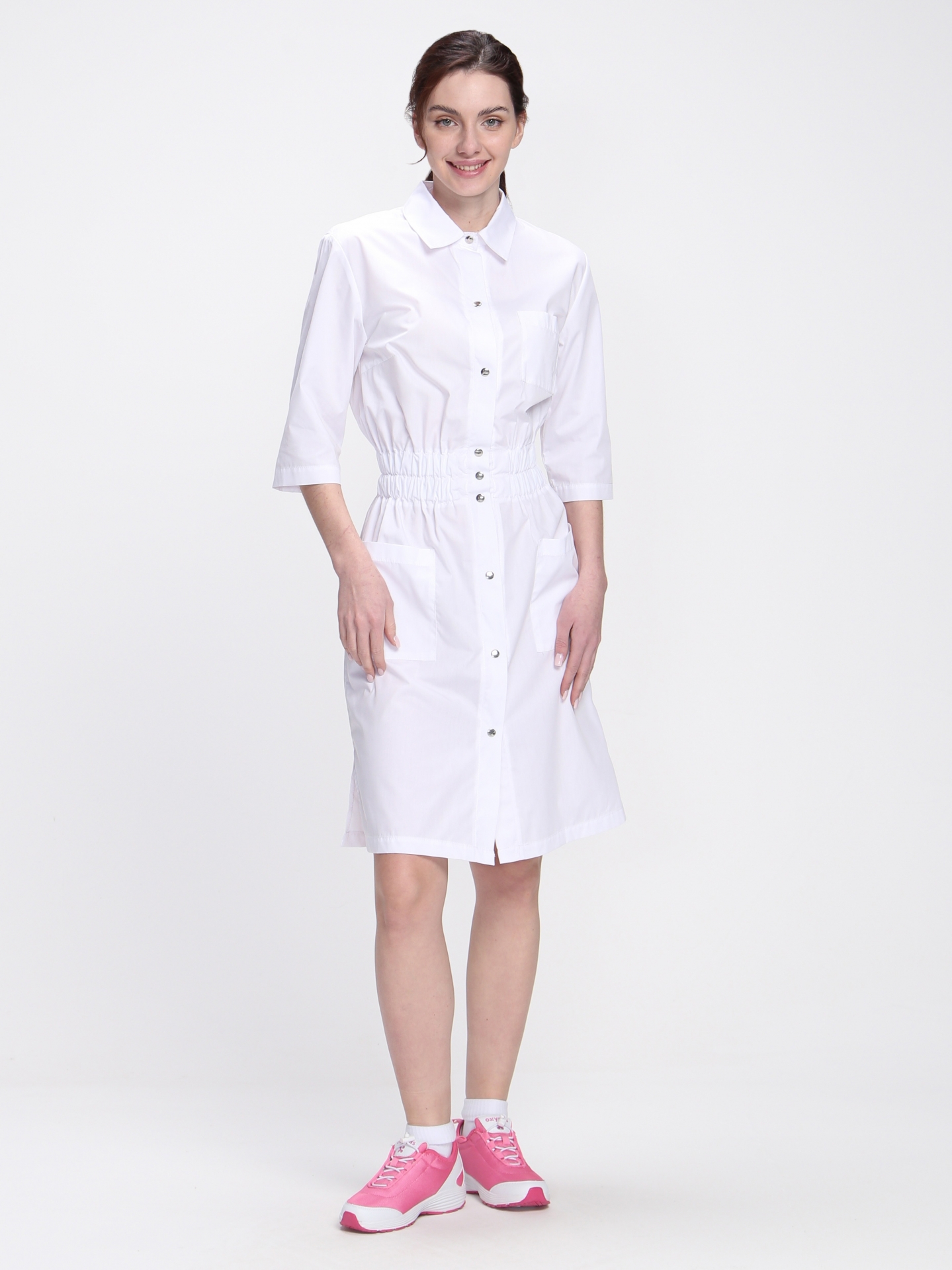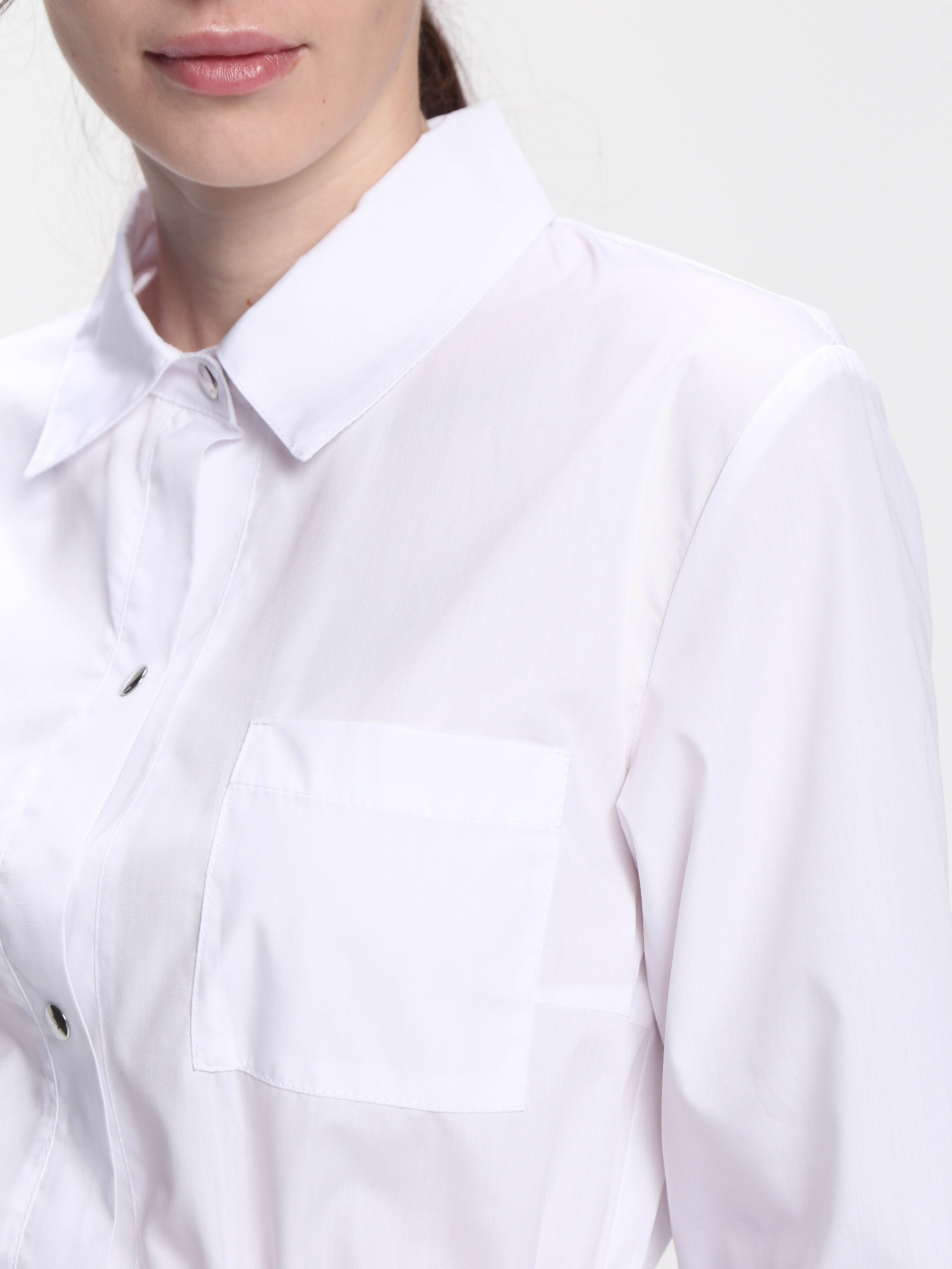 Полочка цельнокроеная, на левой детали переда и нижних частях бочков расположены накладные карманы, вход в карманы обработаны в подгибку с закрытым срезом, баковые карманы одним срезом входят в боковой шов.