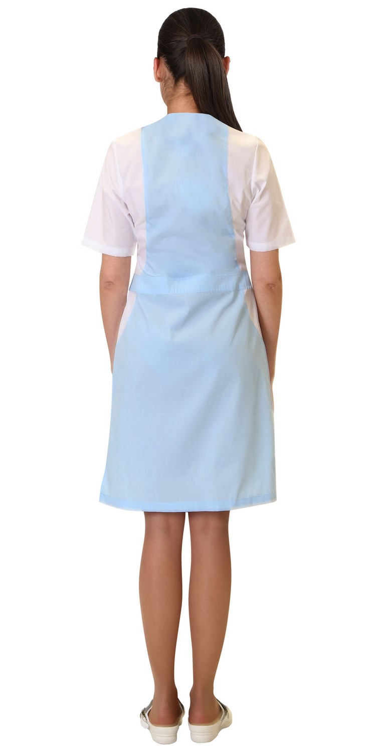 Халат женский полуприлегающего силуэта из ткани голубого цвета с белой отделкой. Центральная застежка на тесьму "молния", фигурный V-образный вырез, настроченный пояс, два нижних внутренних боковых кармана с овальным входом. Рукава втачные, короткие.