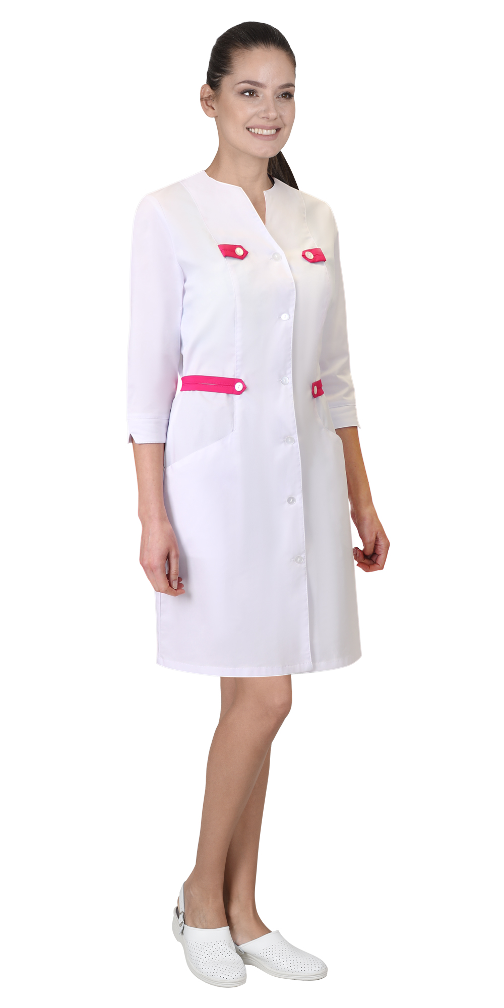 Халат полуприлегающего силуэта с центральной застёжкой на пуговицы. Без воротника с фигурным вырезом горловины. Два кармана в рельефных швах. Рукава втачные длиной 3/4.