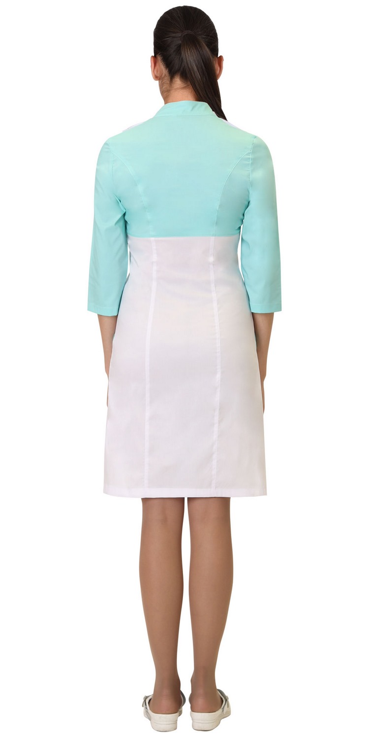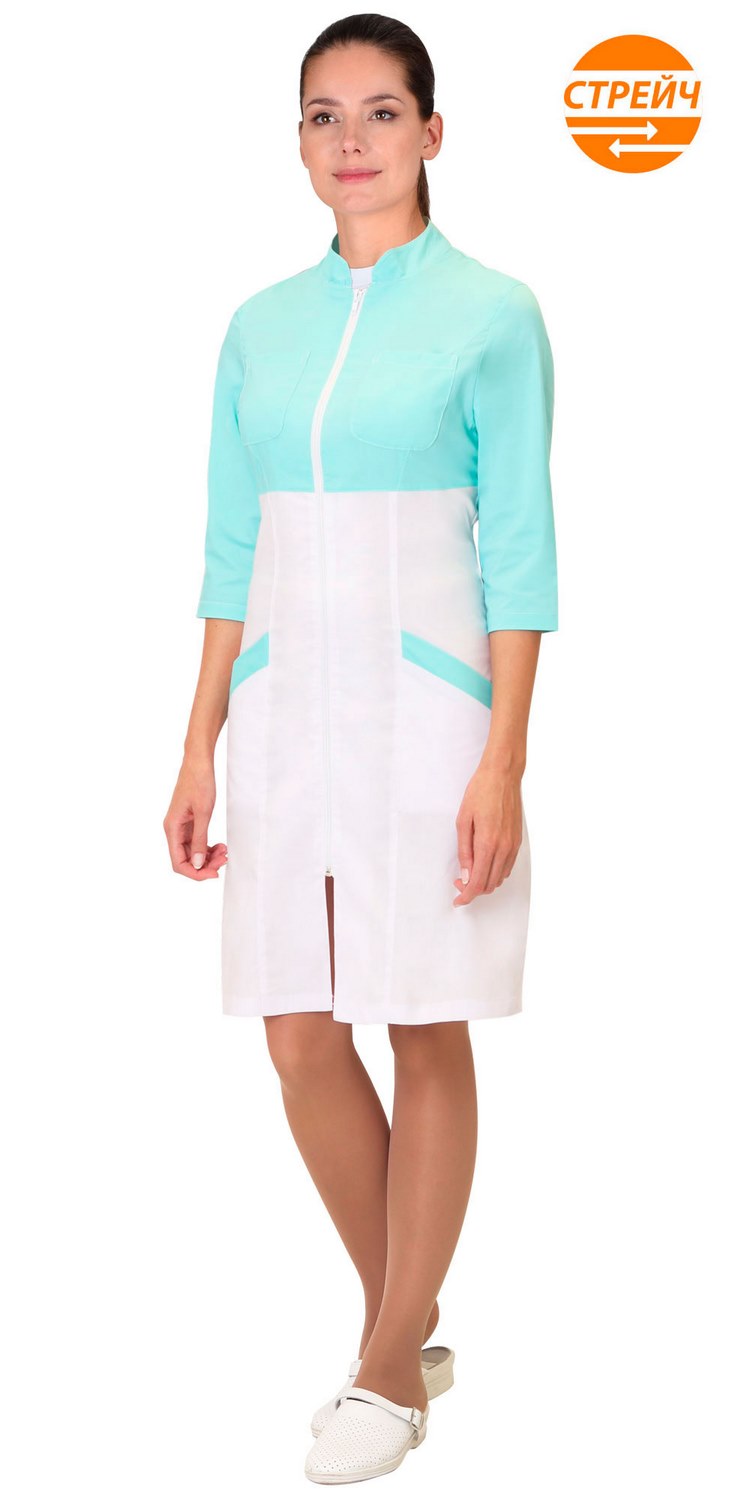 Халат прилегающего силуэта с центральной застёжкой на молнию. Воротник стойка. Два накладных нагрудных и два внутренних боковых кармана. Рукава втачные, длиной 3/4.