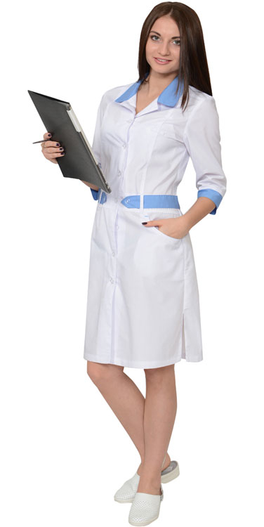 Халат женский полуприлегающего силуэта, с центральной бортовой застежкой на пуговицы, отрезной по линии талии с втачным поясом, с отложным воротником из отделочной ткани, с лацканами, с нижними внутренними карманами. Рукава втачные, короткие, с притачной манжетой из ткани отделка. На втачном поясе 5 шлевок (2 спереди и 3 сзади), в шлевки продет пояс, выполненный из ткани отделка,закрепленный спереди пуговицами. По боковым швам халата разрезы.