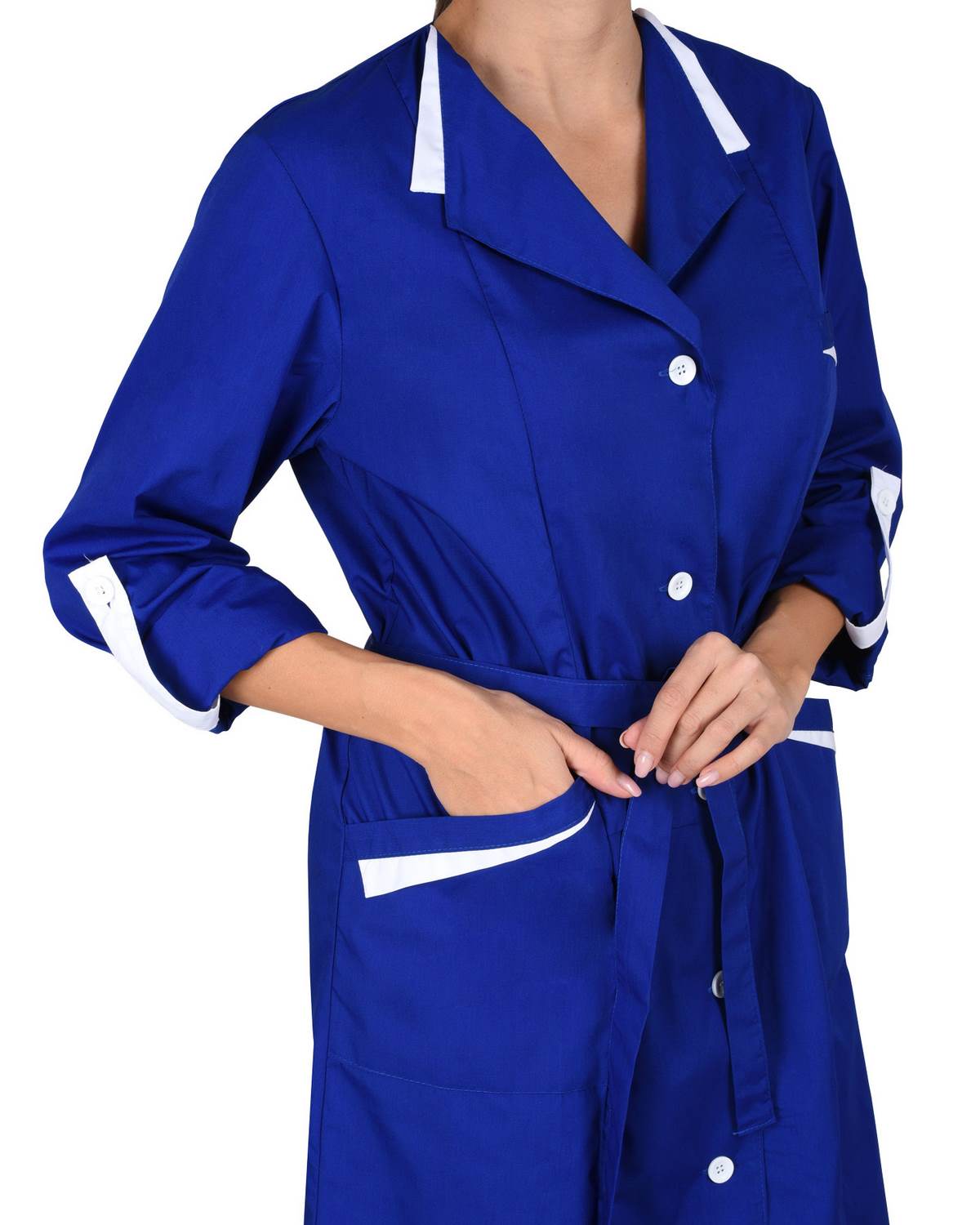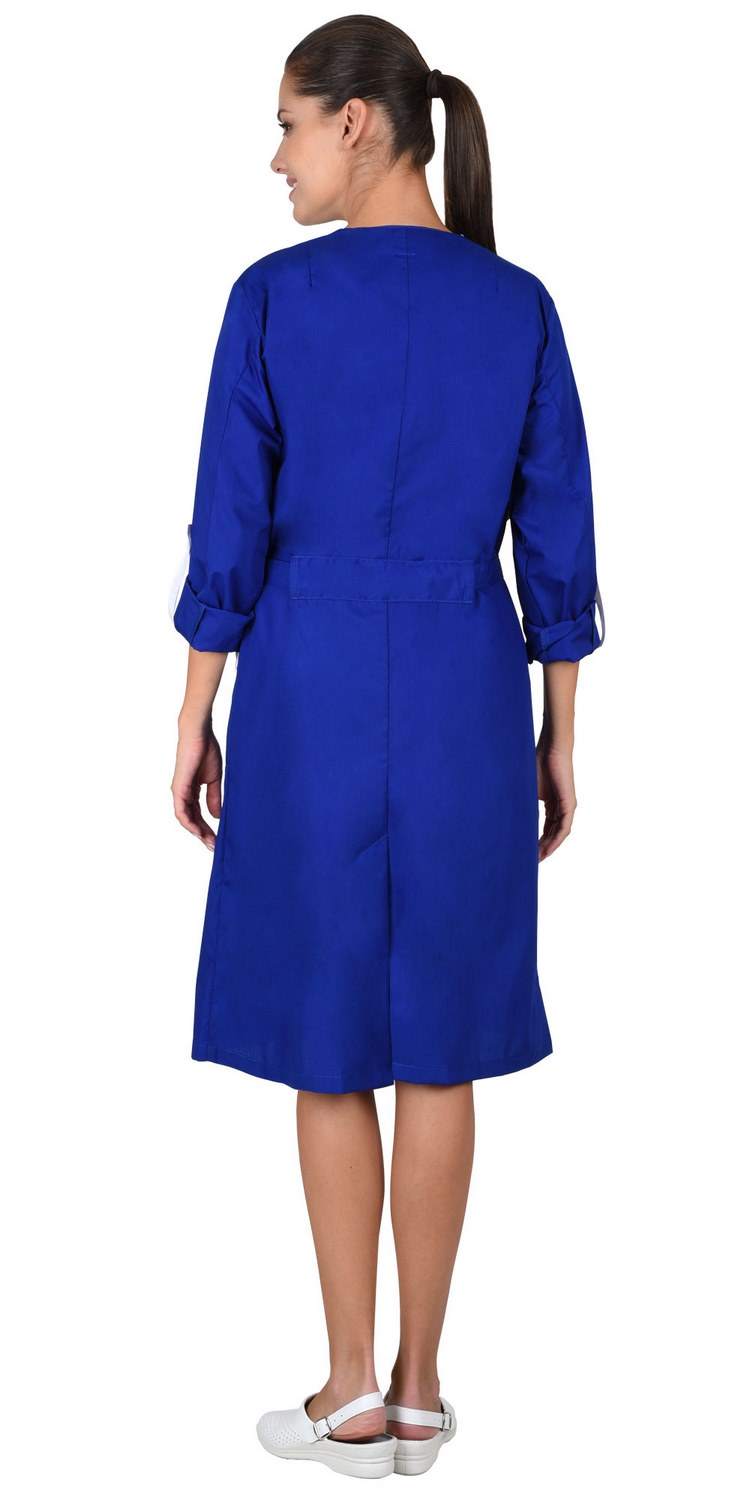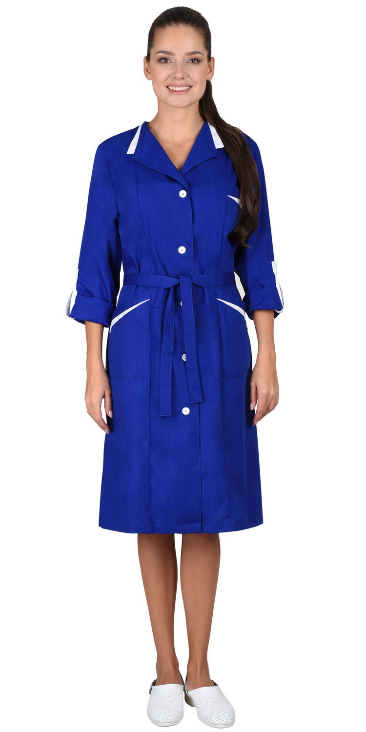 Халат женский полуприлегающего силуэта с центральной бортовой застежкой на пуговицы, без воротника с лацканами с отделочной деталью, с нагрудным и нижними накладными карманами. Рукава длинные, регулируемые по длине при помощи хлястика из отделочной ткани и пуговицы. Халат с завязывающимся спереди поясом.