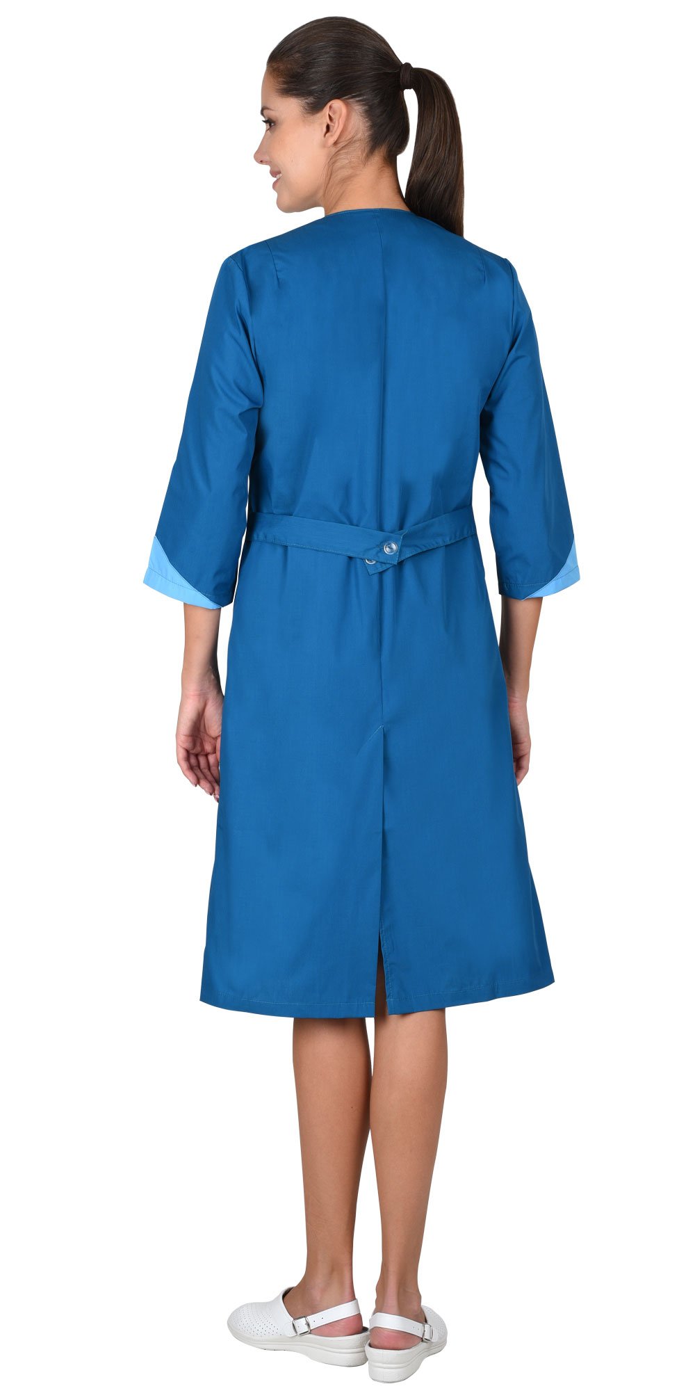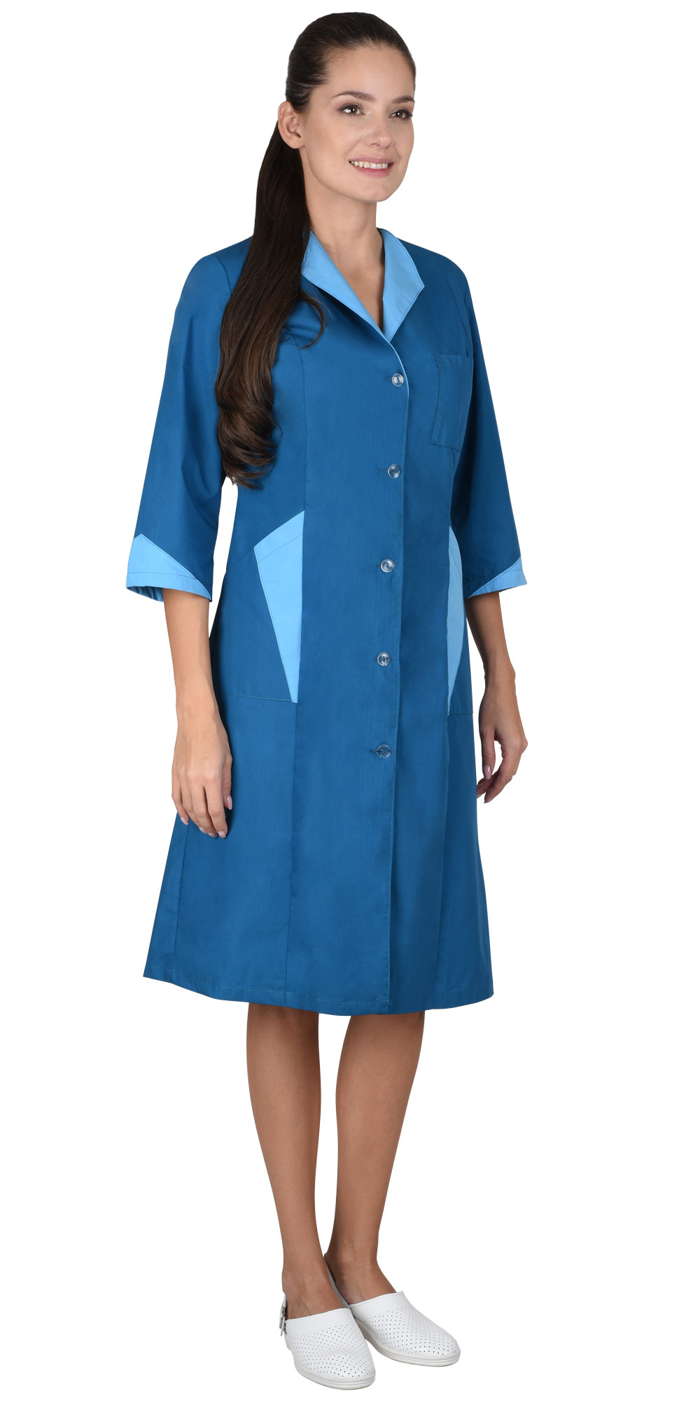 Халат полуприлегающего силуэта, слегка расширенный к низу. Застёжка на пуговицы, рельефы. Воротник, часть нижних карманов и низ рукавов 3/4 из отделочной ткани.