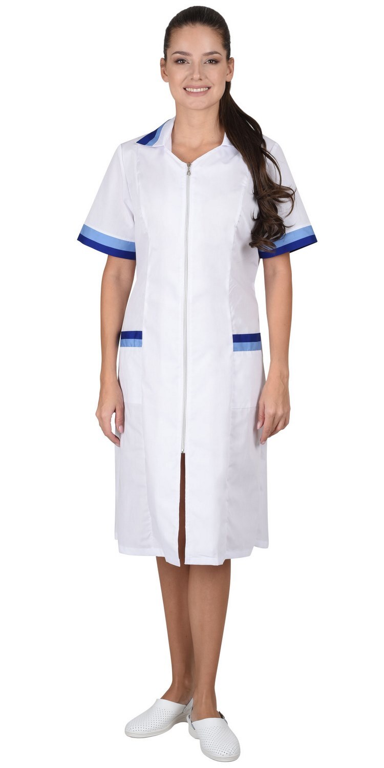 Халат с двумя нижними накладными карманами, отложным воротником и короткими рукавами. Ширина по линии талии регулируется хлястиком. Воротник, рукава и карманы с яркими отделочными элементами.