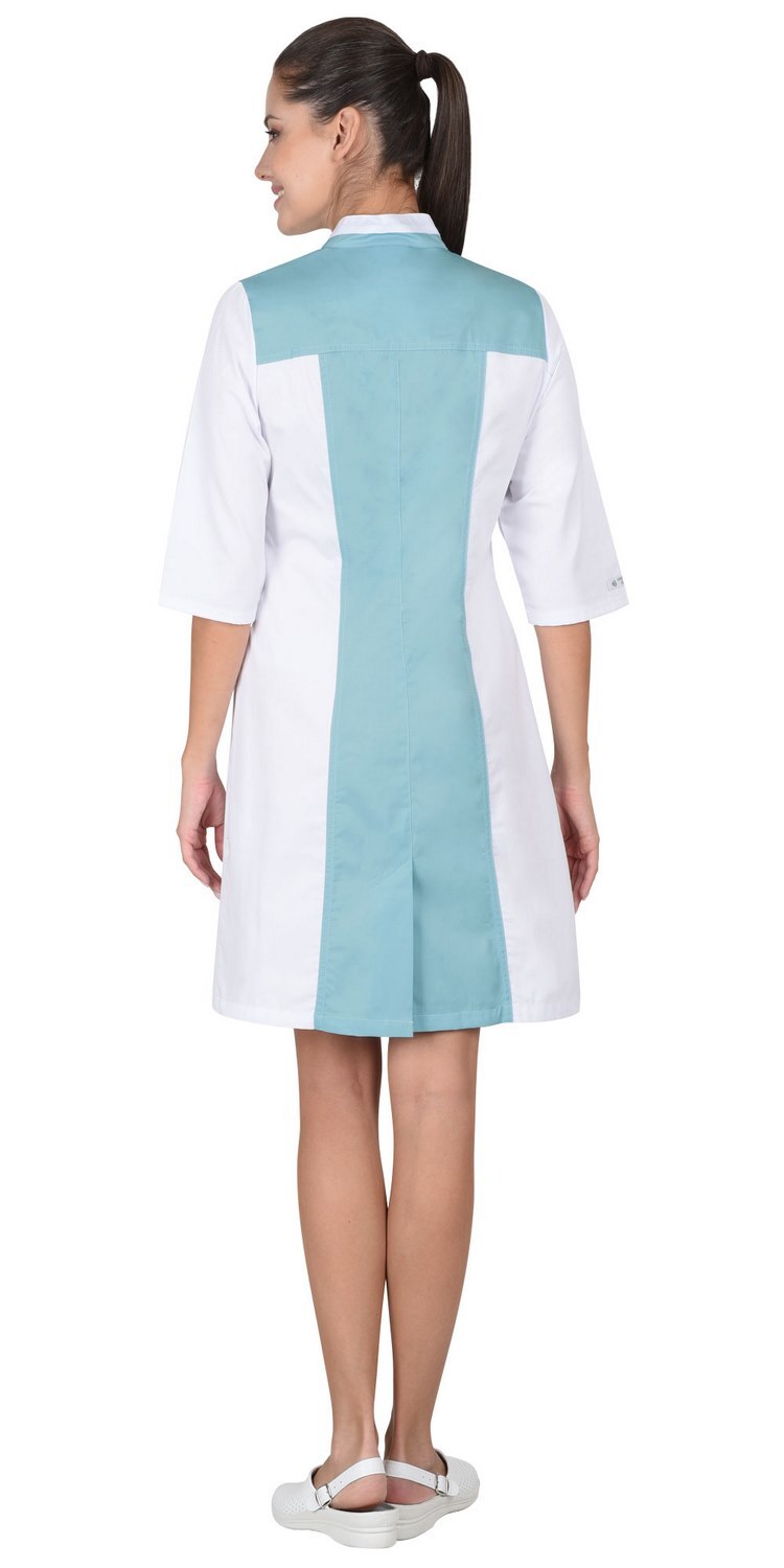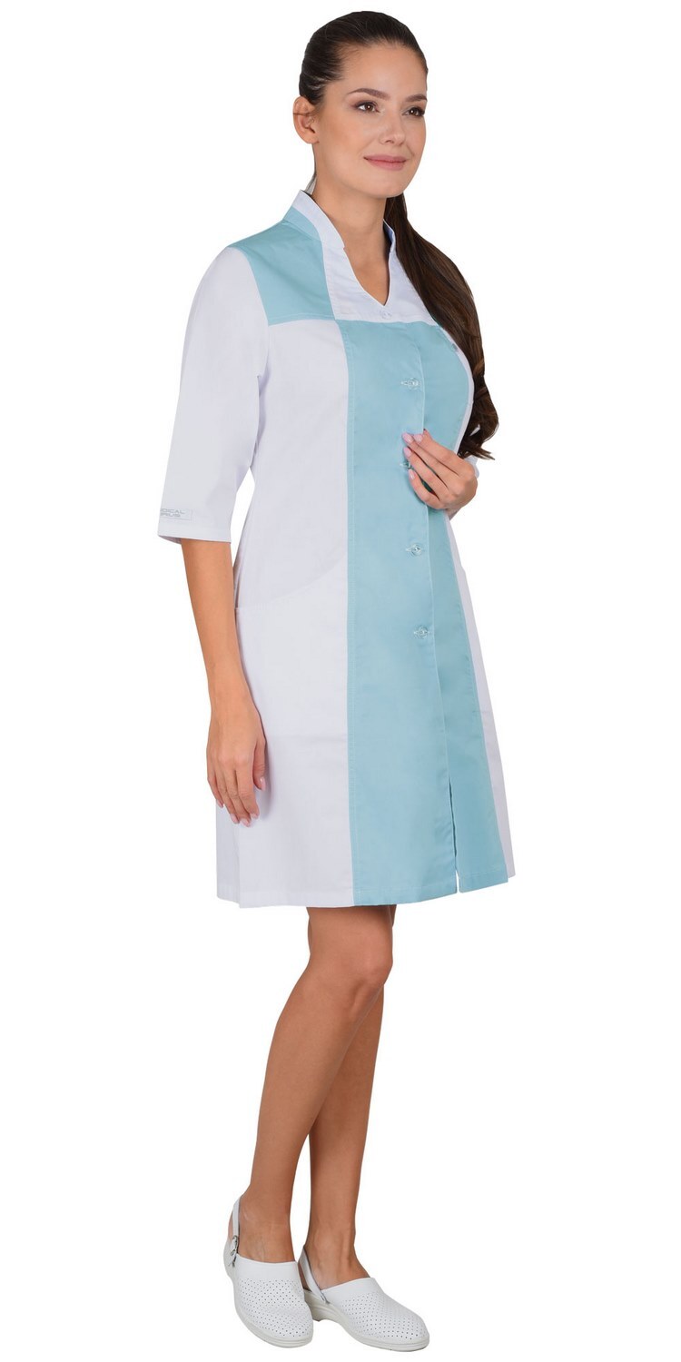 Халат женский, полуприлегающего силуэта с центральной застёжкой на пуговицы, с верхним и нижними фигурными карманами. Воротник «стойка». Рукава втачные, укороченные. Детали халата выполнены из отделочной ткани. По спинке шлица.
