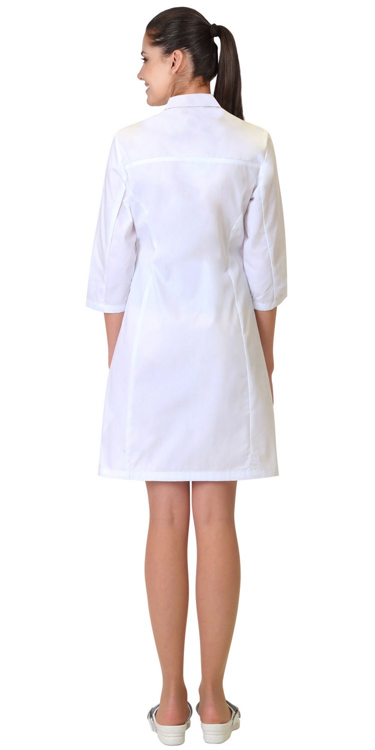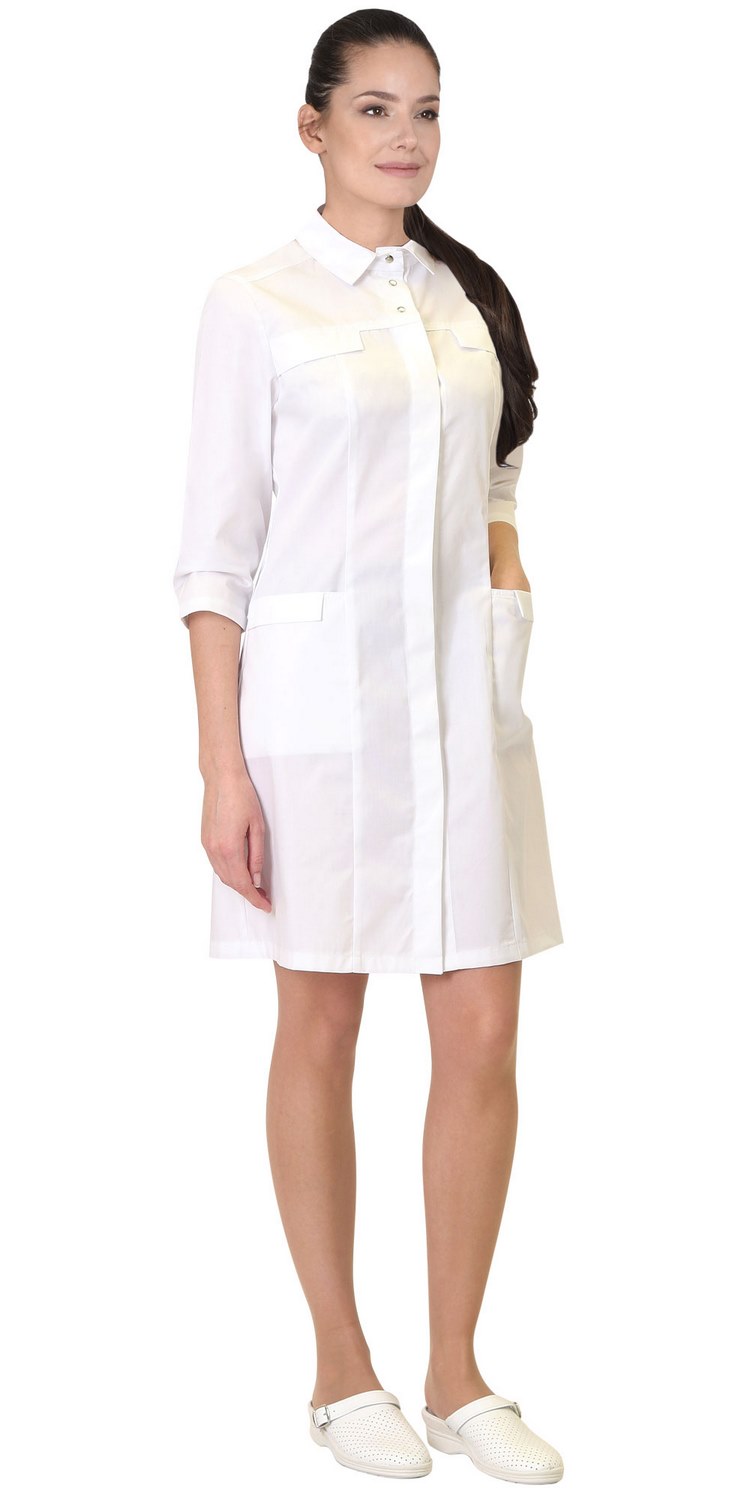 Халат женский полуприлегающего силуэта, с втачным отложным воротником с отрезной стойкой, с центральной застёжкой на 3 кнопки вверху и от кокетки с супатной застёжкой на 6 пуговиц, с внутренними боковыми карманами. Рукава втачные 3/4.