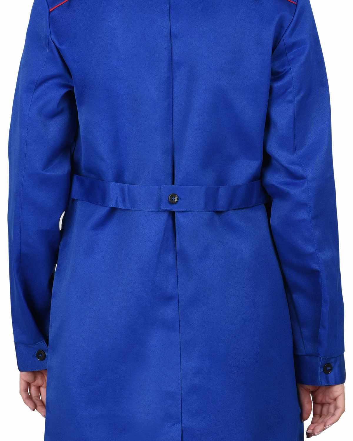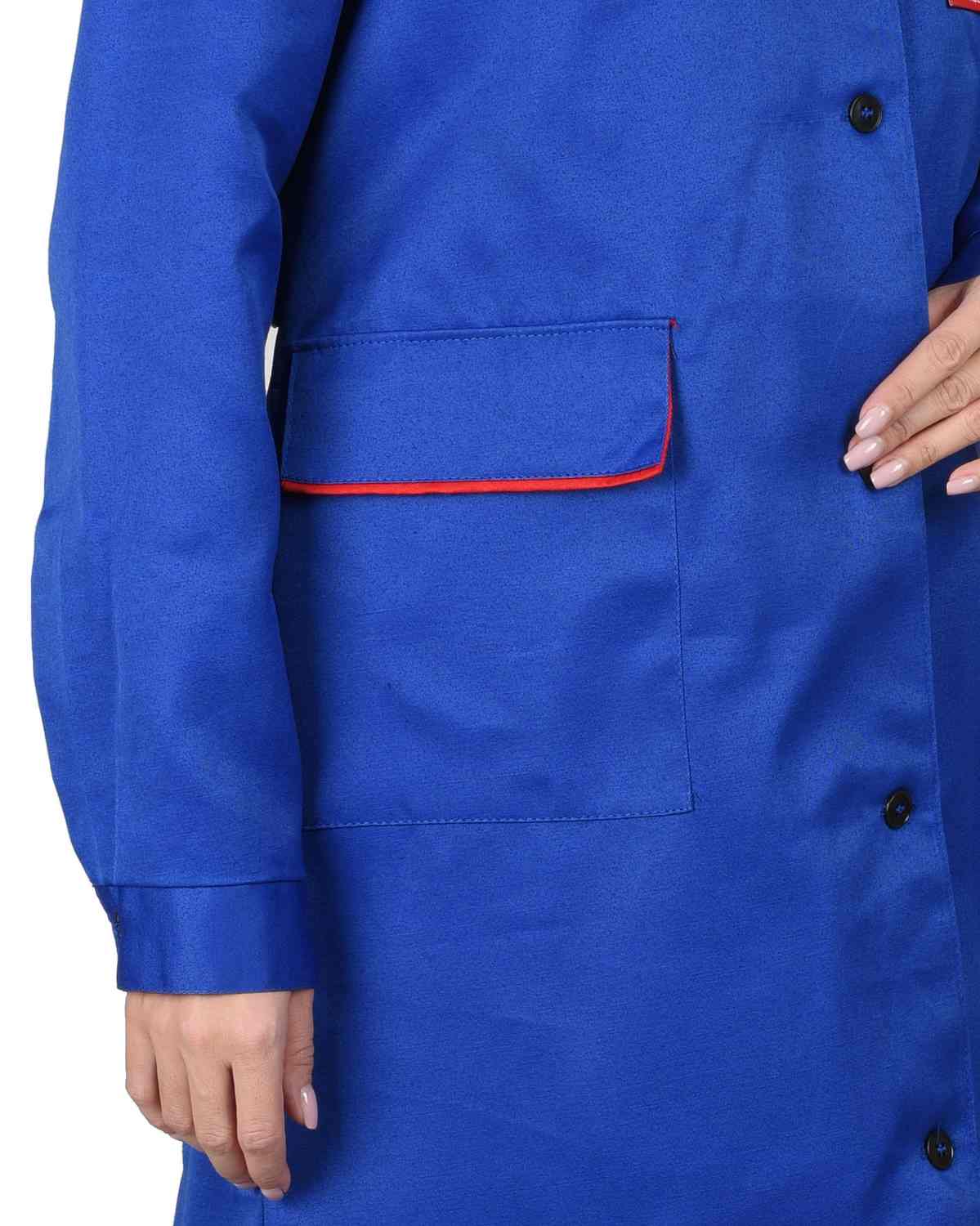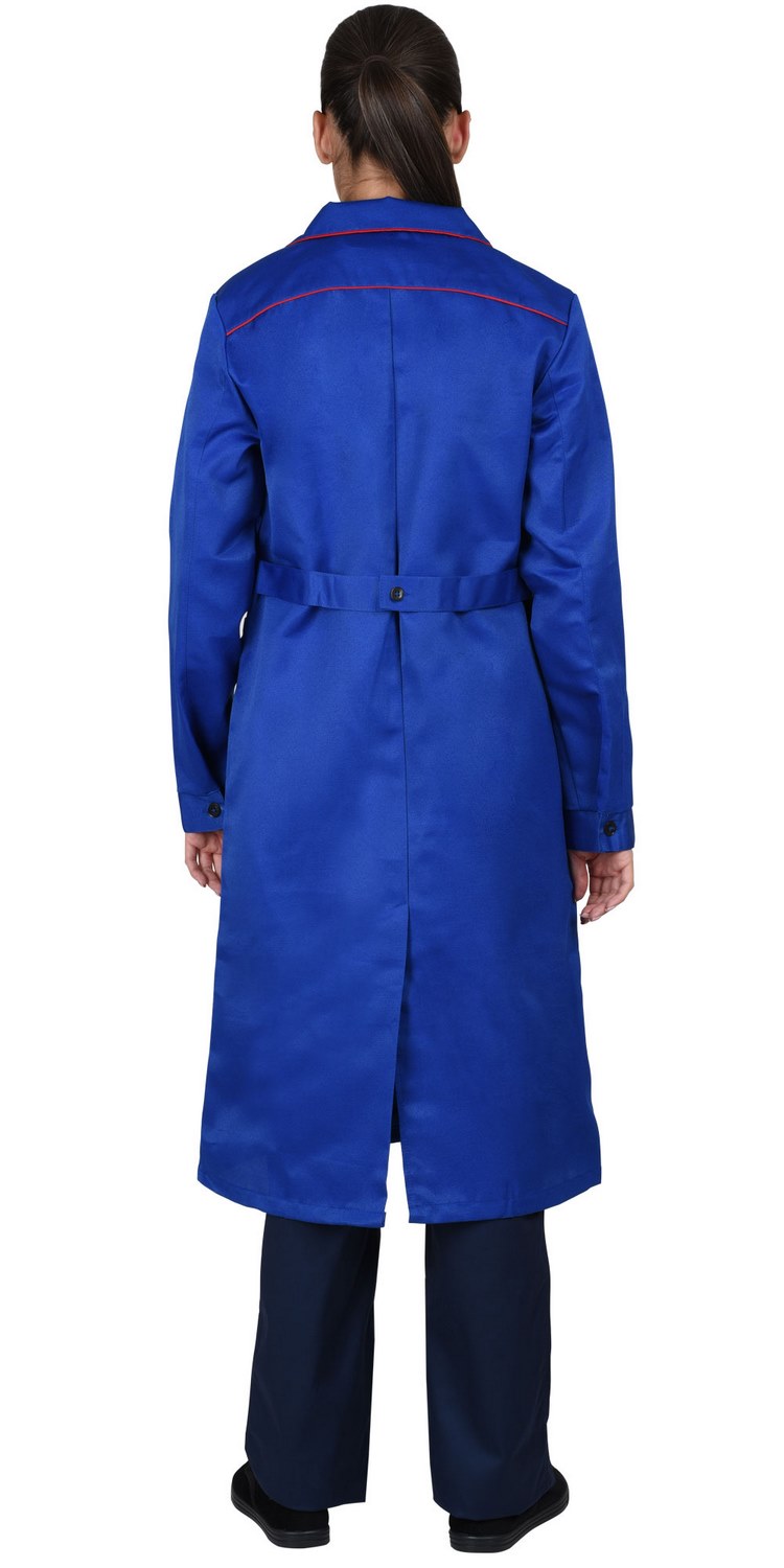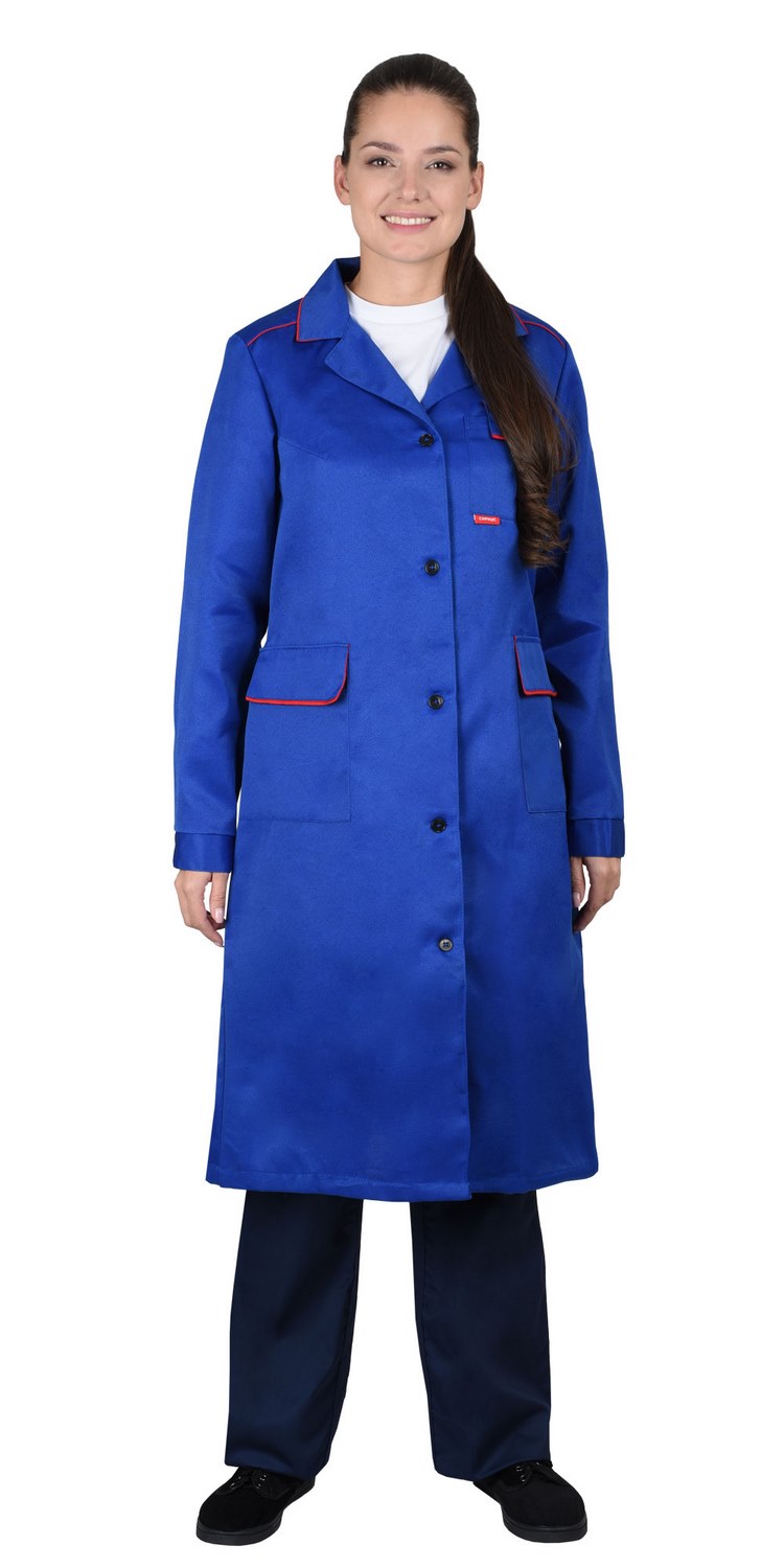 Халат женский. Застёжка на пуговицы, карманы с клапанами. Рукава с манжетами. Красный кант.