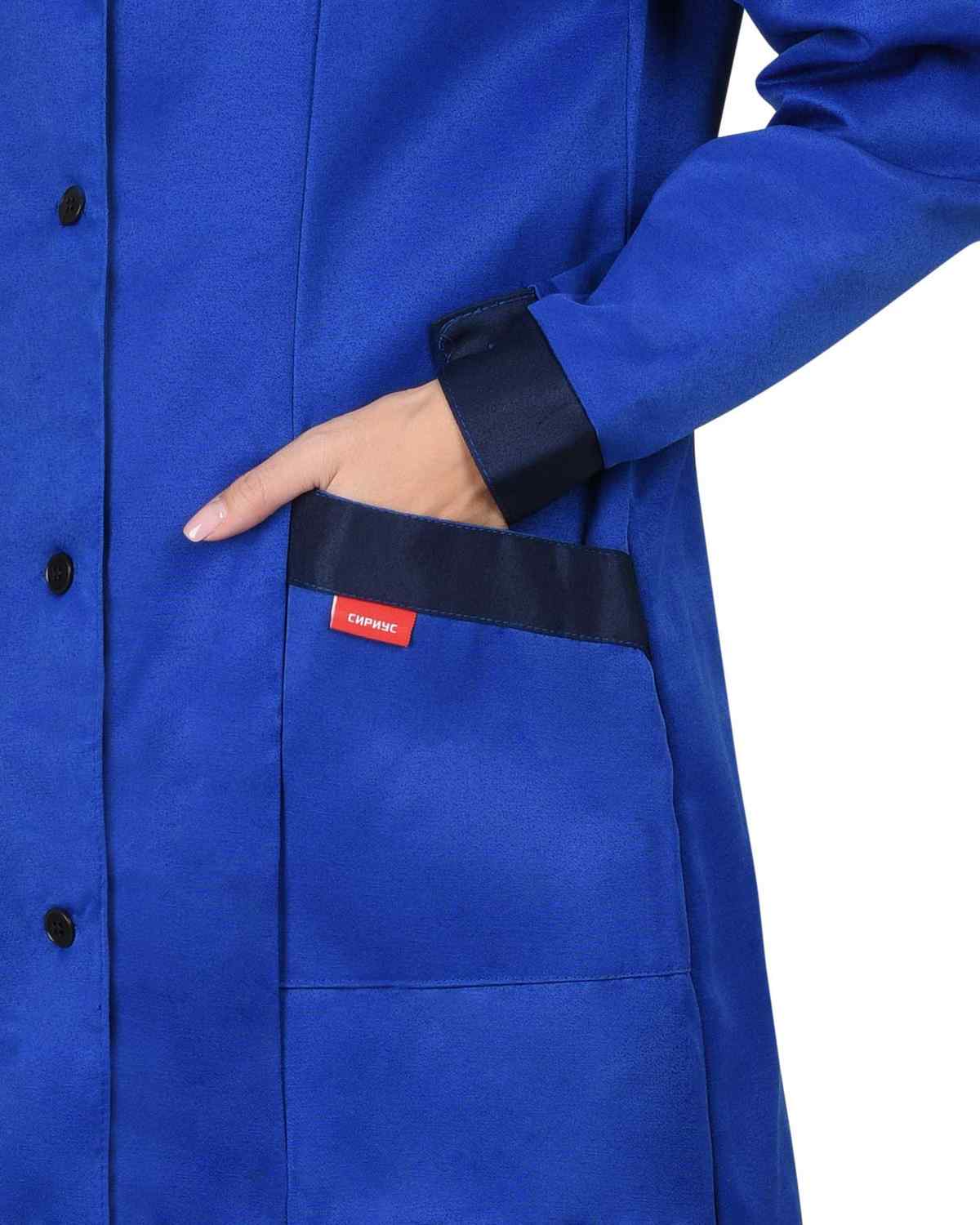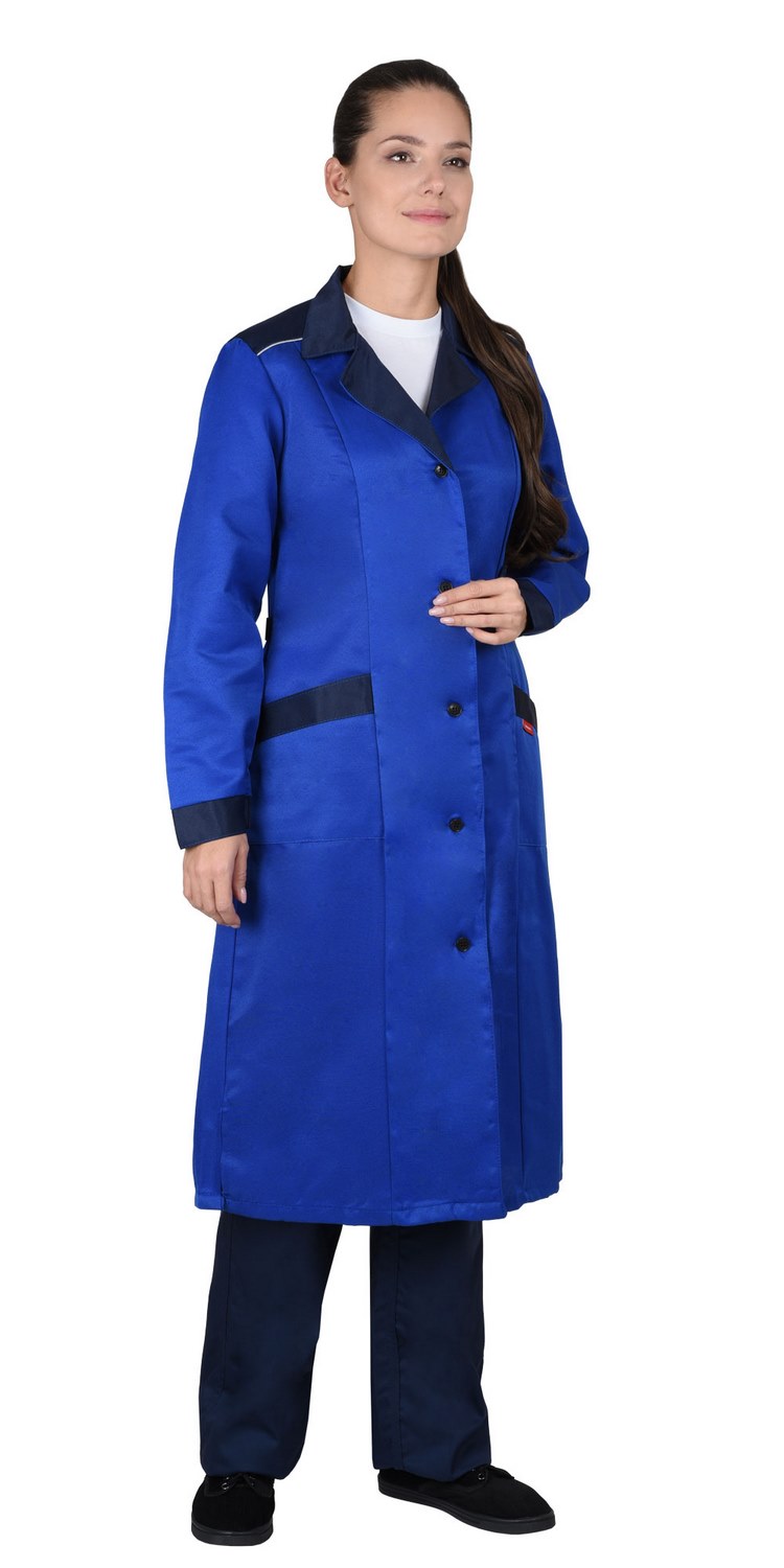 Халат женский. Воротник английский, застёжка на пуговицы, карманы. Рукава с манжетами. СО кант по кокеткам.