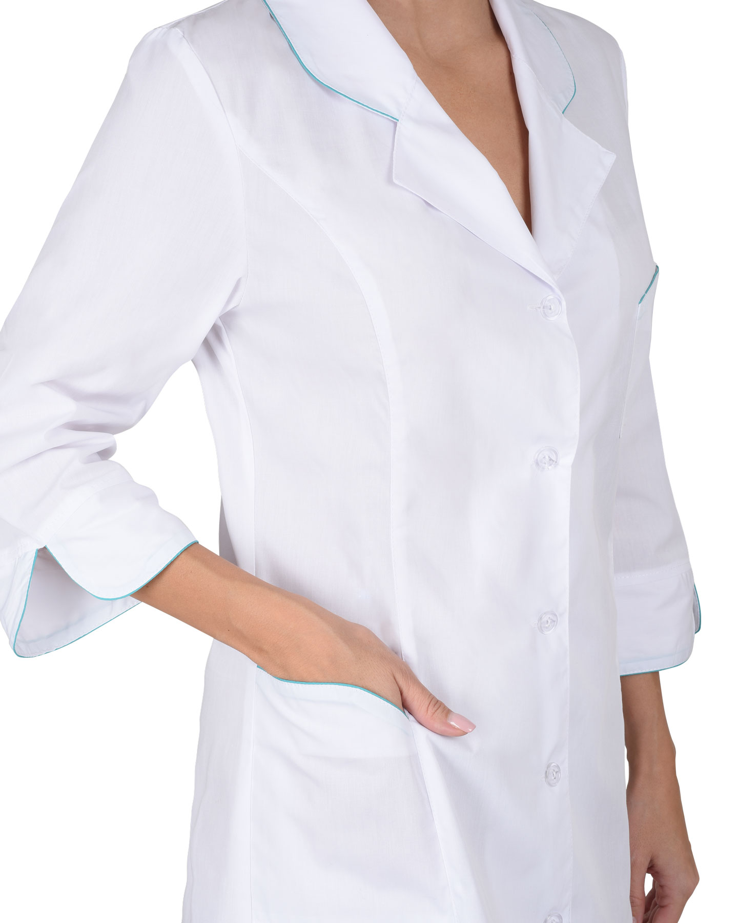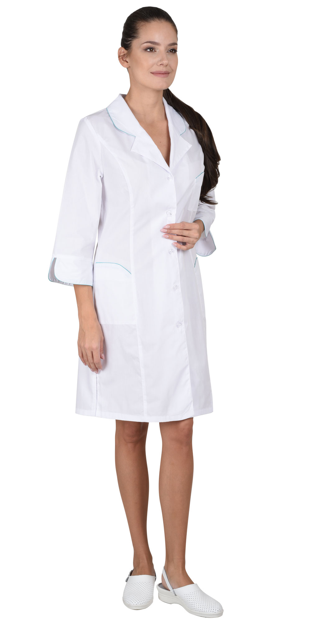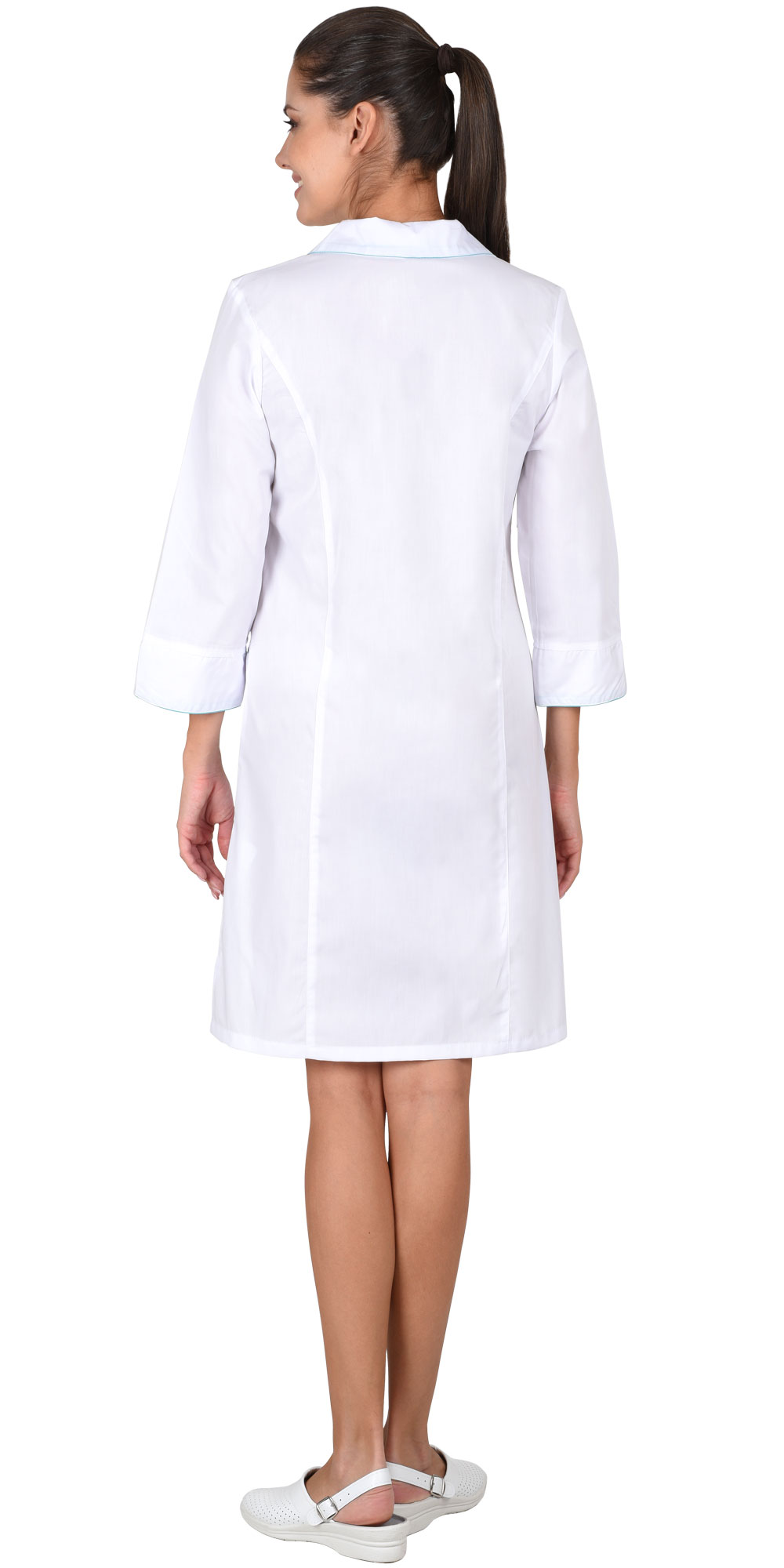 Халат с центральной застежкой на пуговицы. На полочках вертикальные рельефы. Фигурные карманы, воротник и манжеты с отделкой в виде канта контрастного цвета. Рукава 3/4.