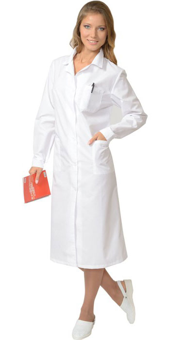 Классическая модель с отложным воротником и длинными рукавами с манжетами. Ширина халата по линии талии регулируется хлястиком.