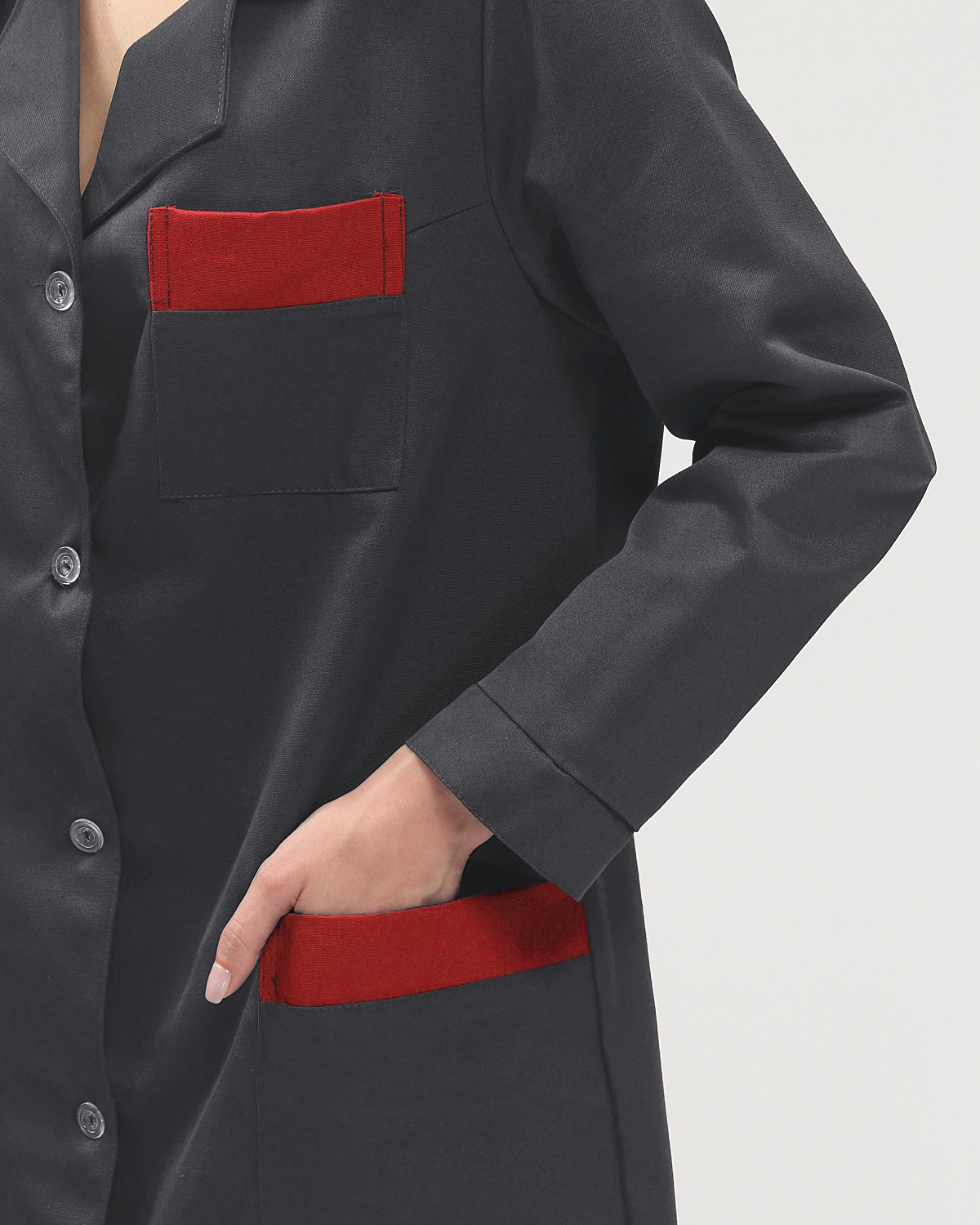 - с одним верхним накладным карманом на левой полочке и двумя нижними накладными карманами