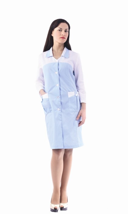 Халат полуприлегающего силуэта, с центральной застёжкой на 5 петель и пуговицы, с отложным воротником, с нижними накладными карманами с фигурными планками.