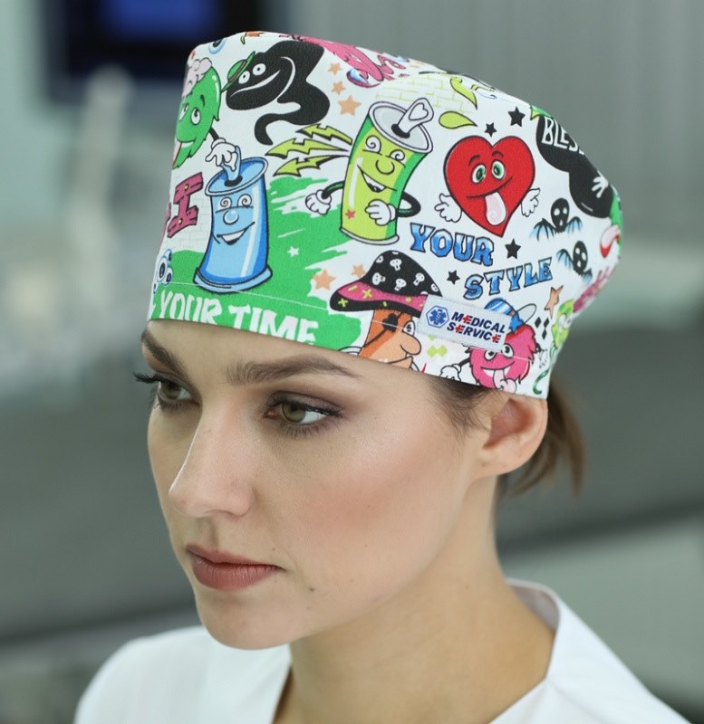 Колпак медицинский средней высоты из принтованной ткани. Для удобства фиксируется сзади резинкой.