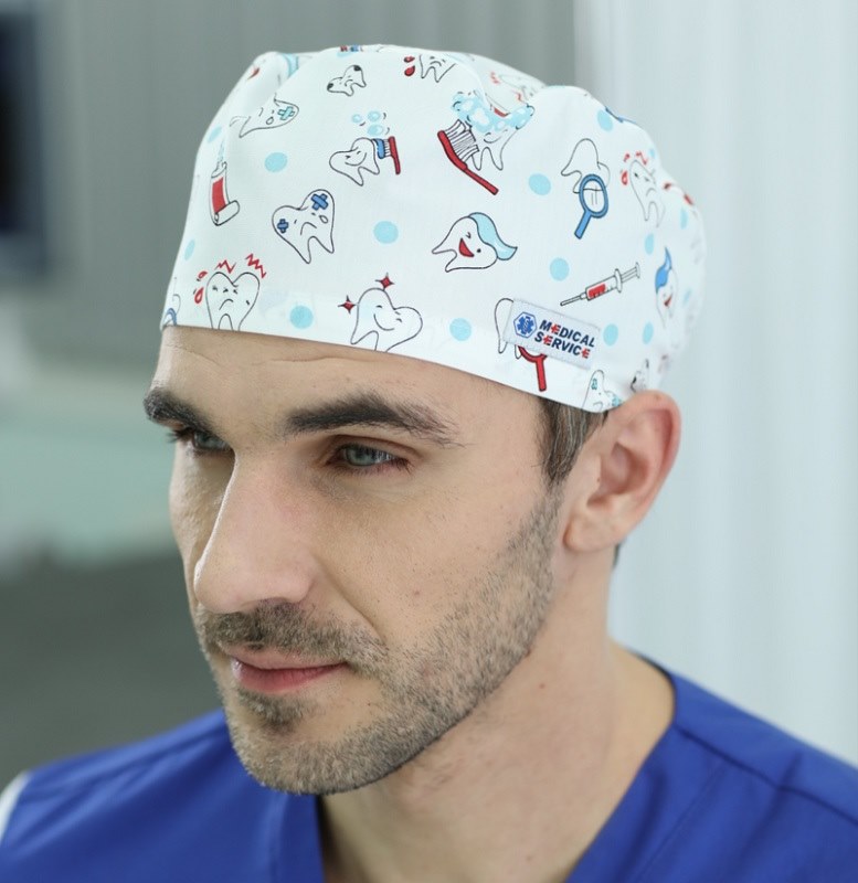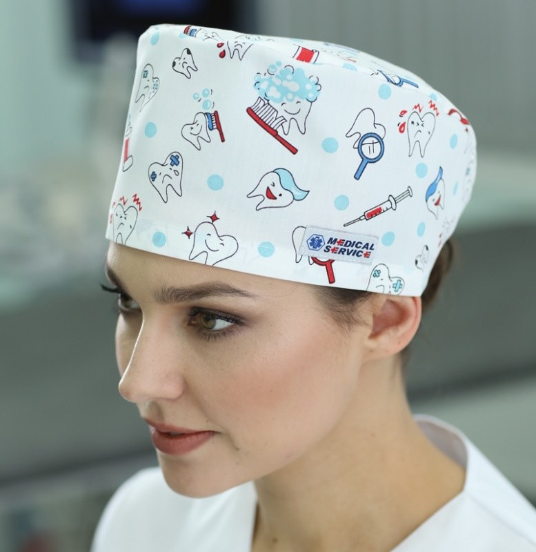 Колпак медицинский средней высоты из принтованной ткани. Для удобства фиксируется сзади резинкой.