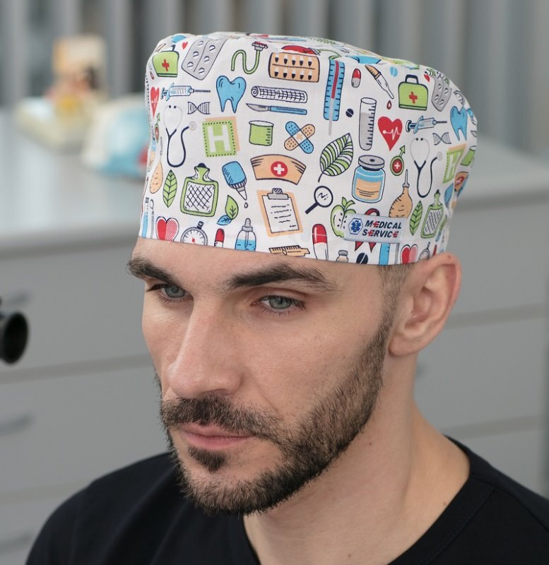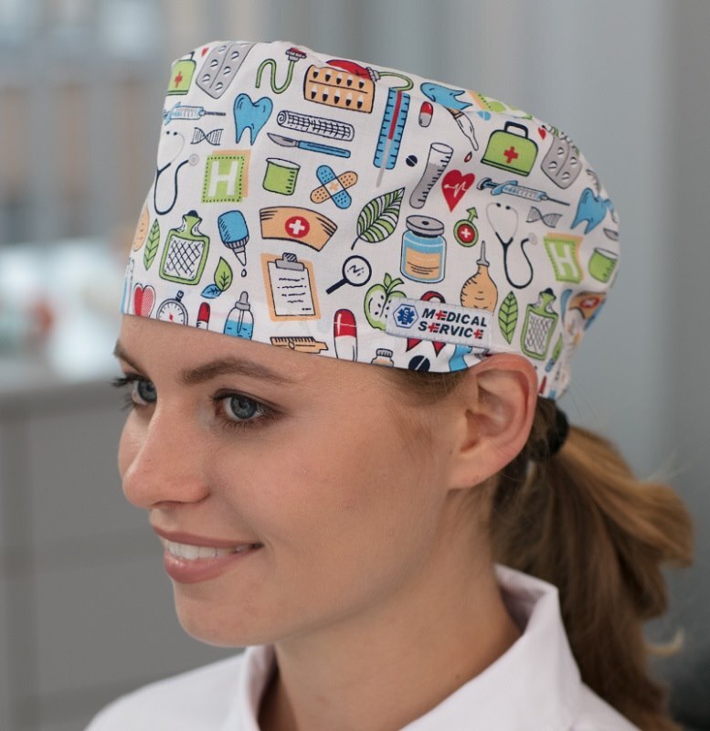Колпак медицинский средней высоты. Для удобства фиксируется сзади резинкой.