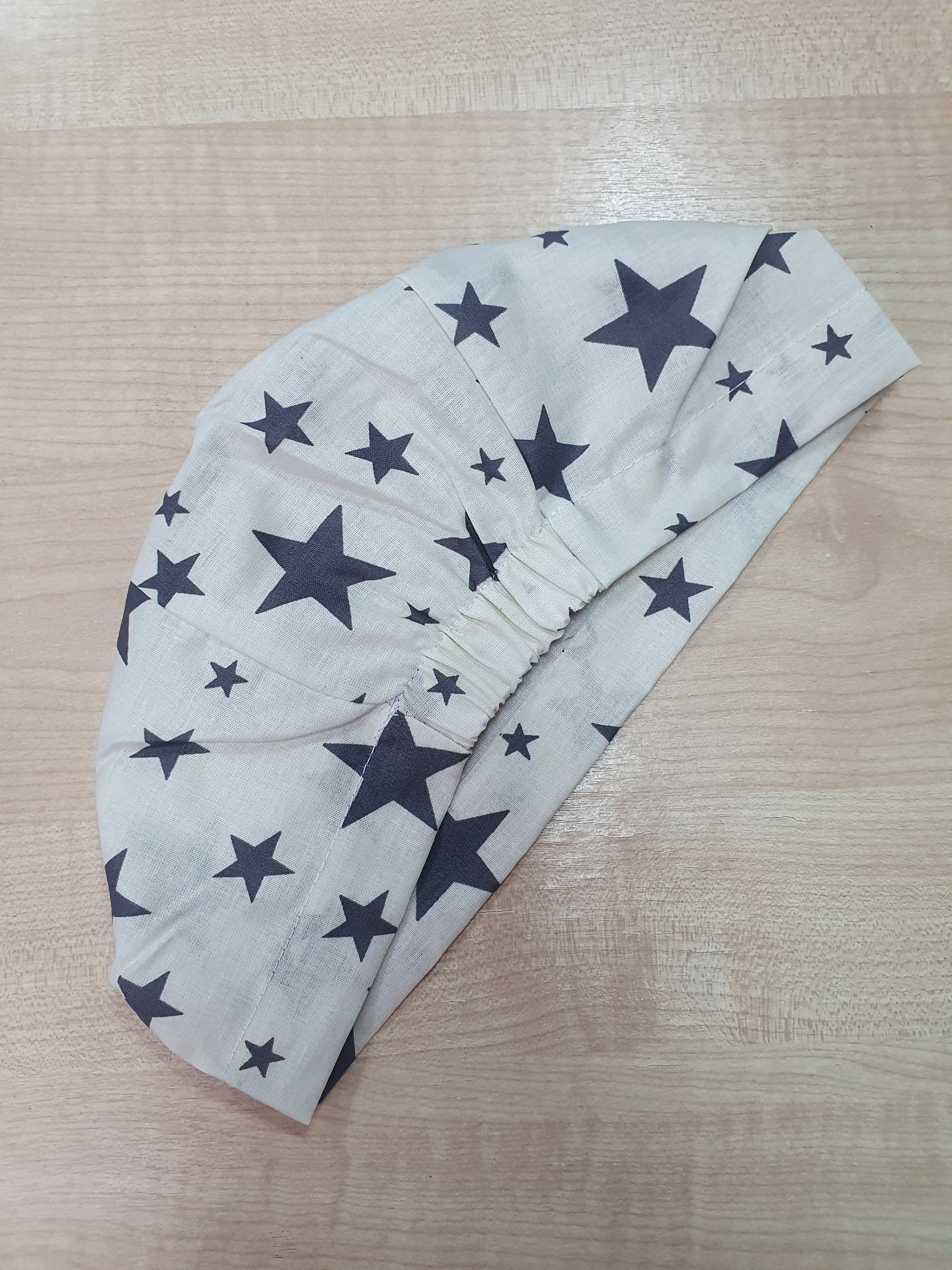 Шапочка-колпак медицинская без подворота с завязками из смесовой ткани «Поплин». Она содержит 100% хлопкового волокна. Подойдет как мужчинам, так и женщинам. Цвет - серые звезды на бежевом.