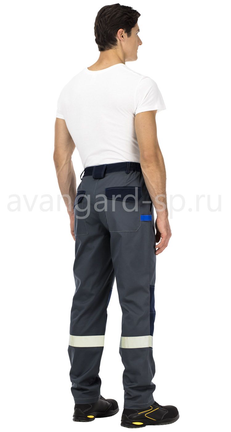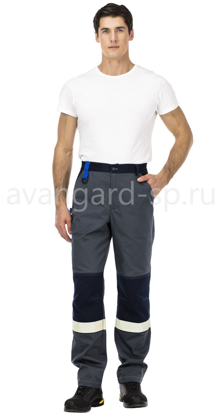 Брюки с застежкой на гульфик с молнией и пуговицей на поясе. Пояс со шлевками для ремня, одна из них из отделочного материала с пластиковым полукольцом для крепления карабина или пропуска. Регулировка объема по талии - за счет боковых вставок с эластичной тесьмой. На передних половинках верхние карманы с боковым входом. На задних половинках верхние накладные карманы с фигурными клапанами, а также петля для инструментов. В области колен - усилительные накладки.