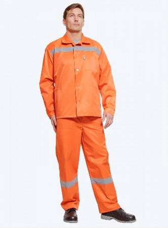 Костюм Дорожник-Эконом оранжевого цвета имеет сигнальные светоотражающие элементы (полосы шириной 50 мм). Соответствует первому классу защиты и способен обеспечить видимость человека в темное время суток и на дороге. Комплект состоит из куртки и брюк, пошитых из смесовой ткани. Водоотталкивающая пропитка защищает костюм от дождя. Для повышения износостойкости предусмотрены усиления в области локтей и коленей.