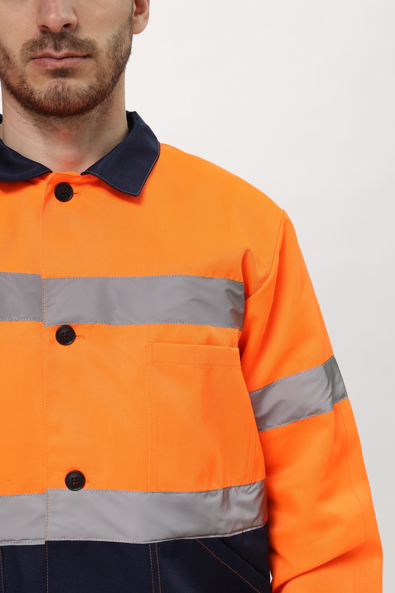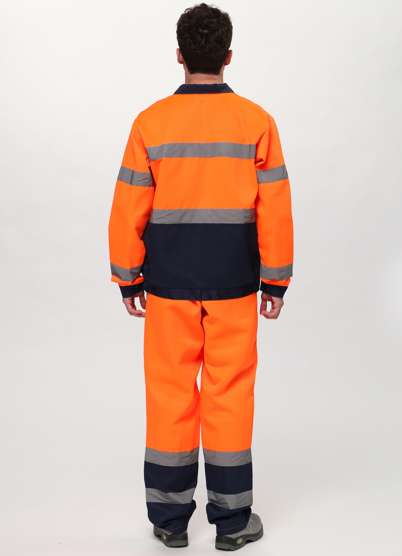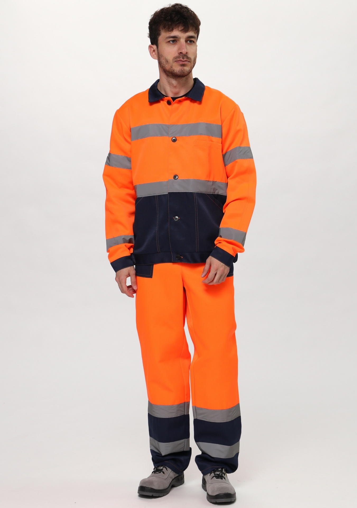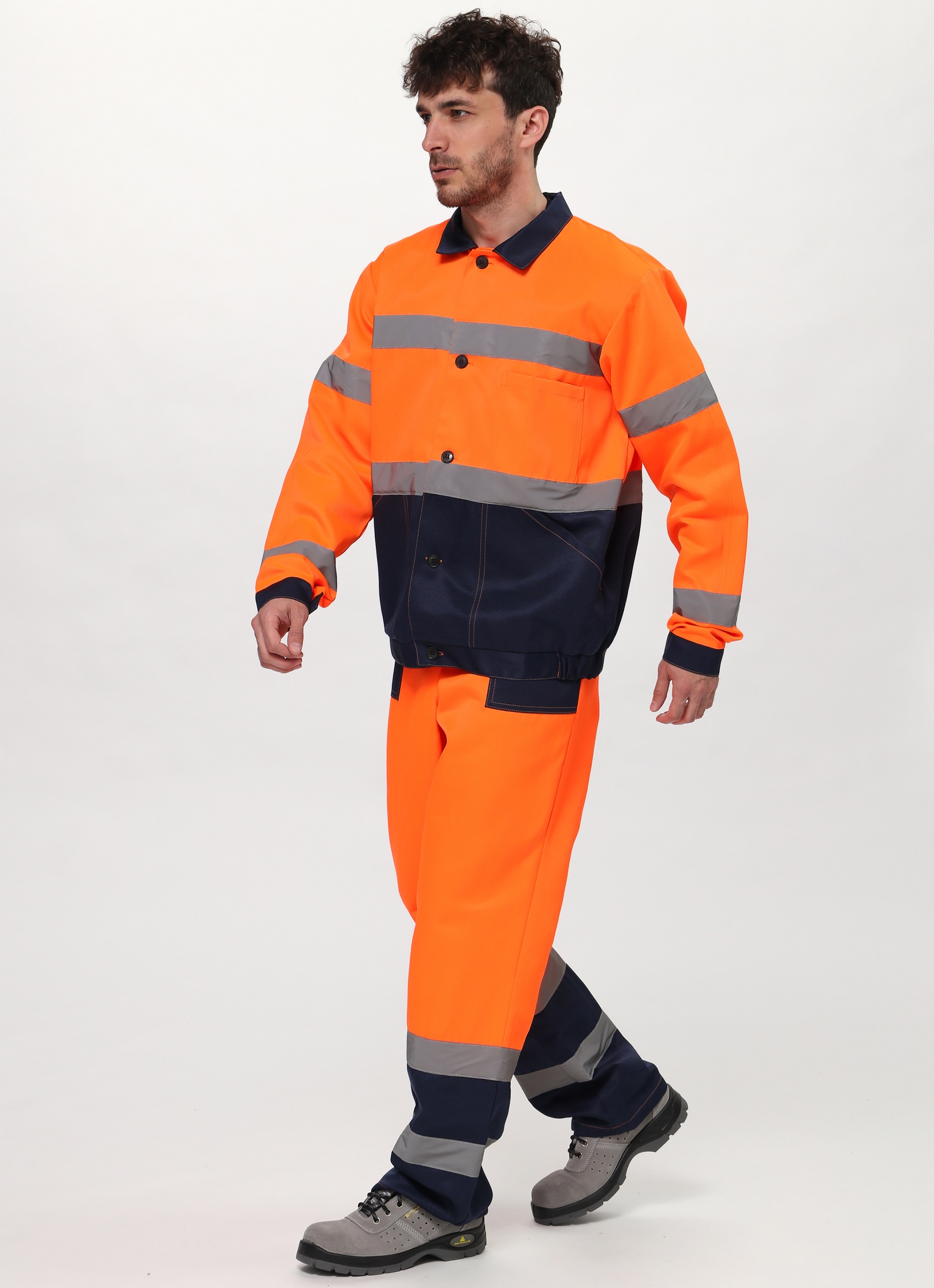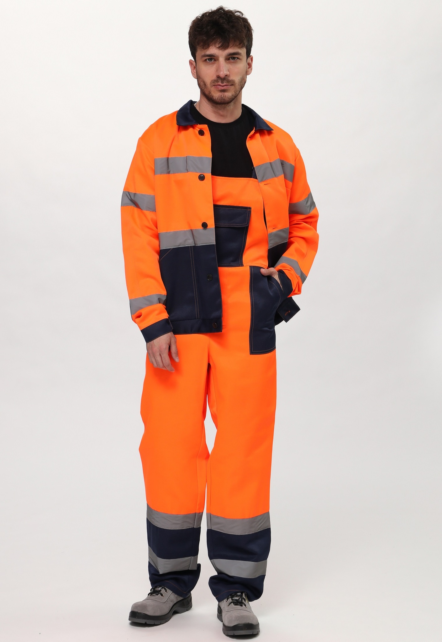 Костюм рабочий сигнальный с полукомбинезоном. Куртка прямого силуэта с супатной застежкой на пуговицы, с притачным поясом. Объём по бокам регулируется при помощи ленты велькро. Отложной воротник. На куртке имеются накладные карманы с клапанами: два нагрудных и два нижних. Манжеты рукавов застёгиваются на пуговицу. Полукомбинезон с регулируемыми бретелями с застежкой на фастексы. По талии спинки - резинка. Объём полукомбинезона регулируется при помощи пуговиц, расположенных с правой стороны. Имеется один центральный карман с клапаном и боковые карманы с косым входом. Световозвращающая лента шириной 50 мм проходит по линии кокетки на полочках и спинке, низу куртки, средней части рукавов, и двойные в нижней части полукомбинезона, что соответствует III классу защиты сигнальной одежды. Усилительные накладки в области коленей.
