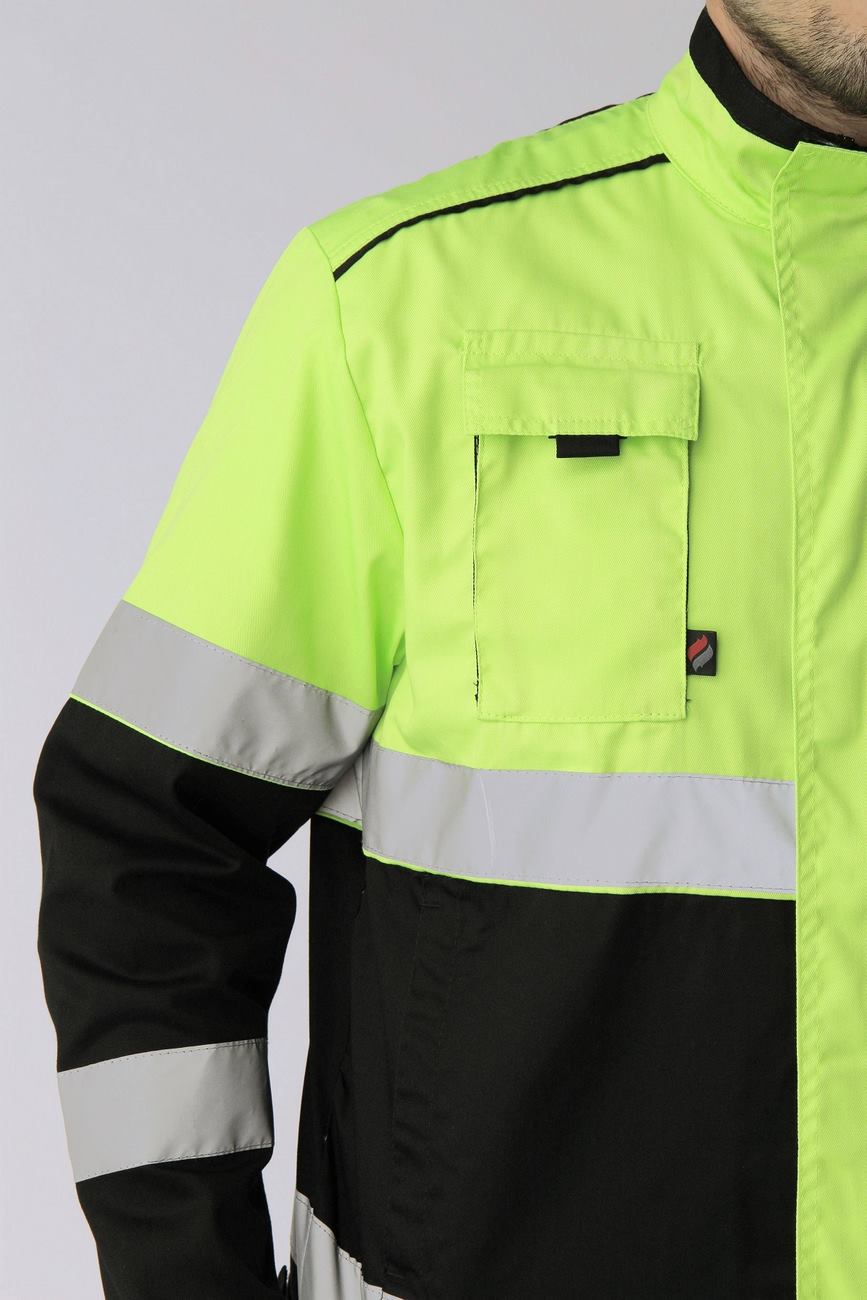 - на верхней части левой полочки прорезной карман с вертикальным входом, застегивающийся на молнию, левее настрочен карман-окошко под бейдж