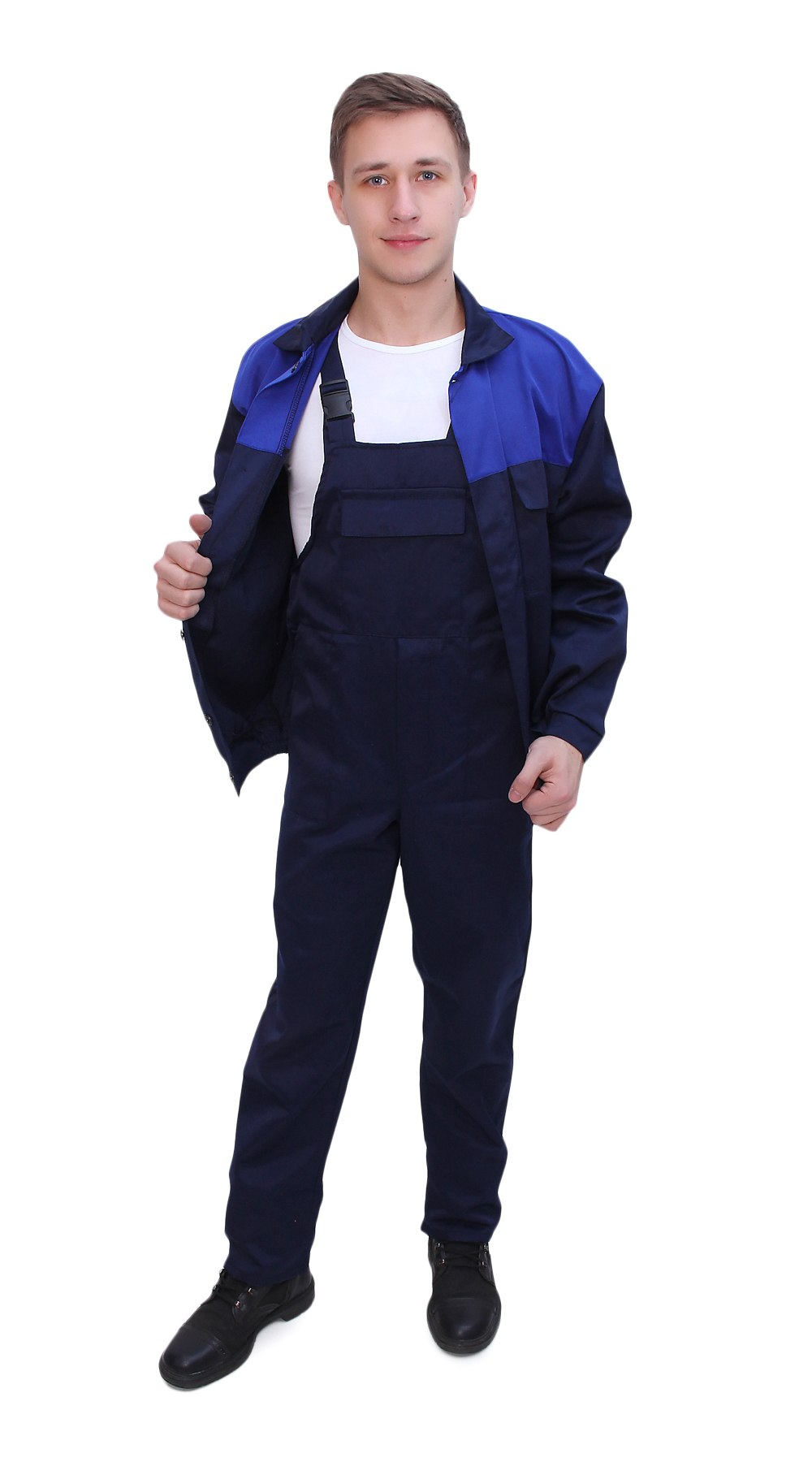 Куртка укороченная на поясе с супатной застежкой на пуговицы. Полочки и спинка на кокетках контрастного цвета. Сверху два накладных кармана на клапанах, снизу два накладных с косым входом. Полукомбинезон с боковыми накладными карманами и накладным нагрудным карманом с клапаном.