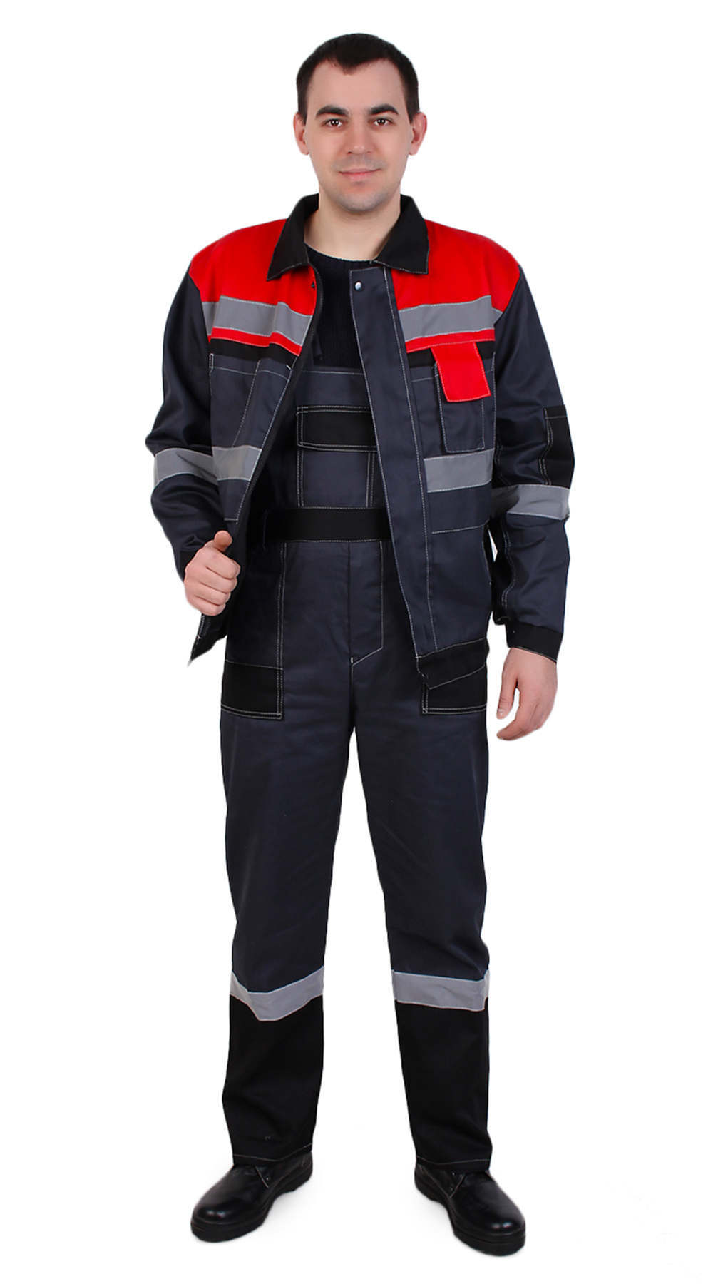 Куртка укороченная с притачным поясом на резинке, с супатной застежкой на молнию, по кокетке и на рукавах расположены световозвращающие полосы 5 см, что позволяет использовать костюм в условиях плохой видимости, на куртке множество функциональных карманов, в том числе карман для средств связи с клапаном на липучке. Полукомбинезон с боковыми накладными карманами с усилениями и карманом для инструментов, с СОП 5 см по низу брючин.