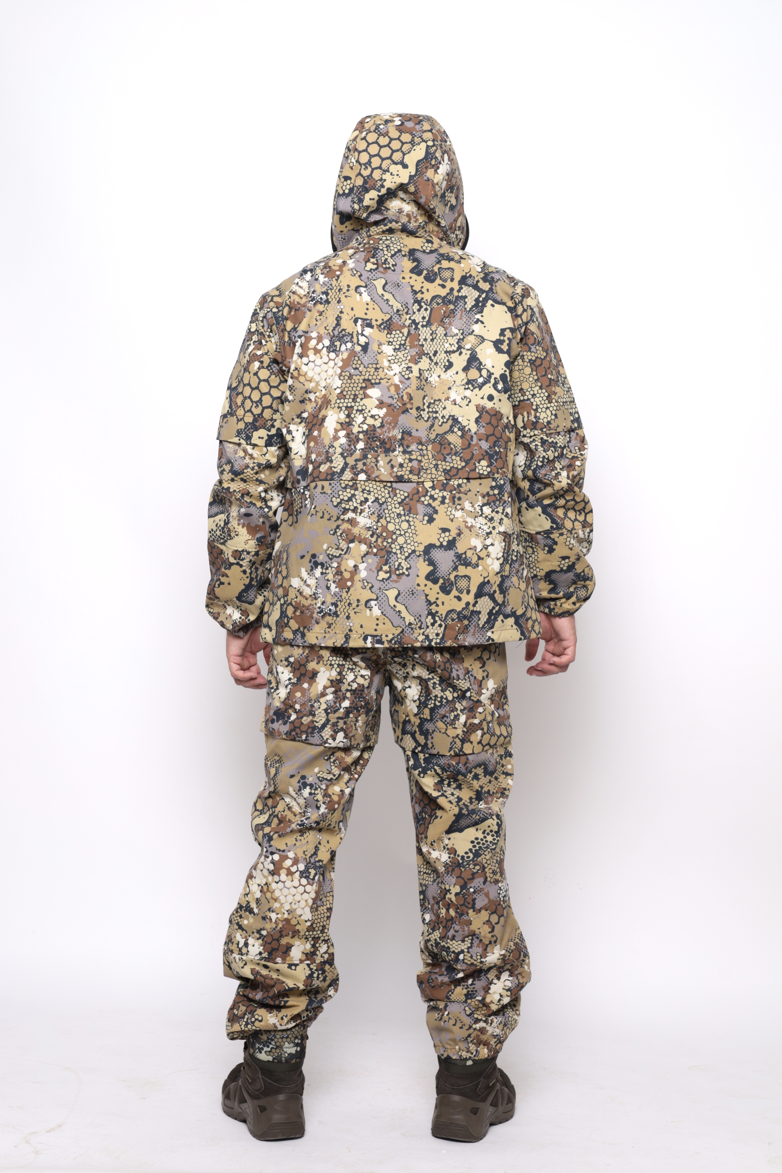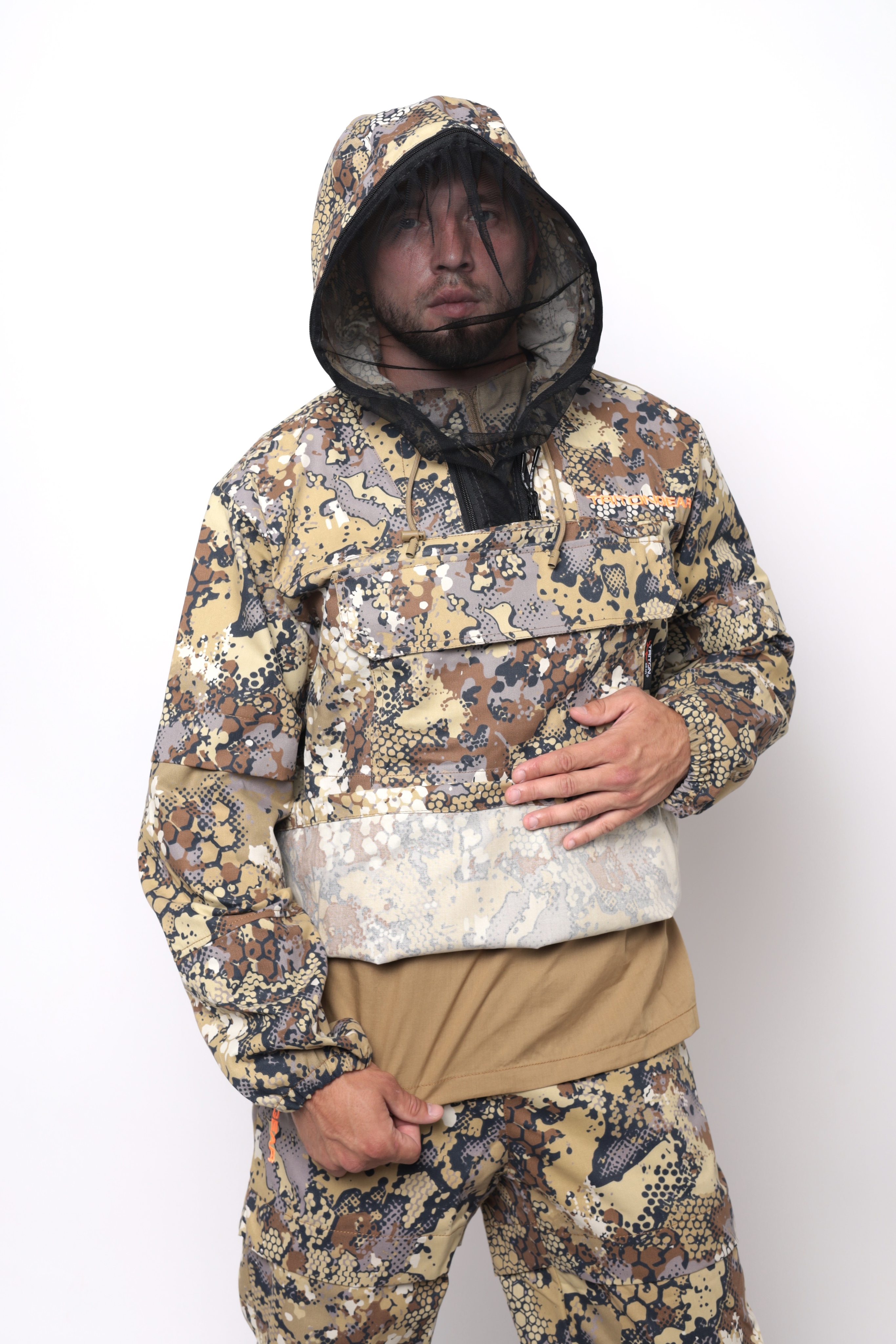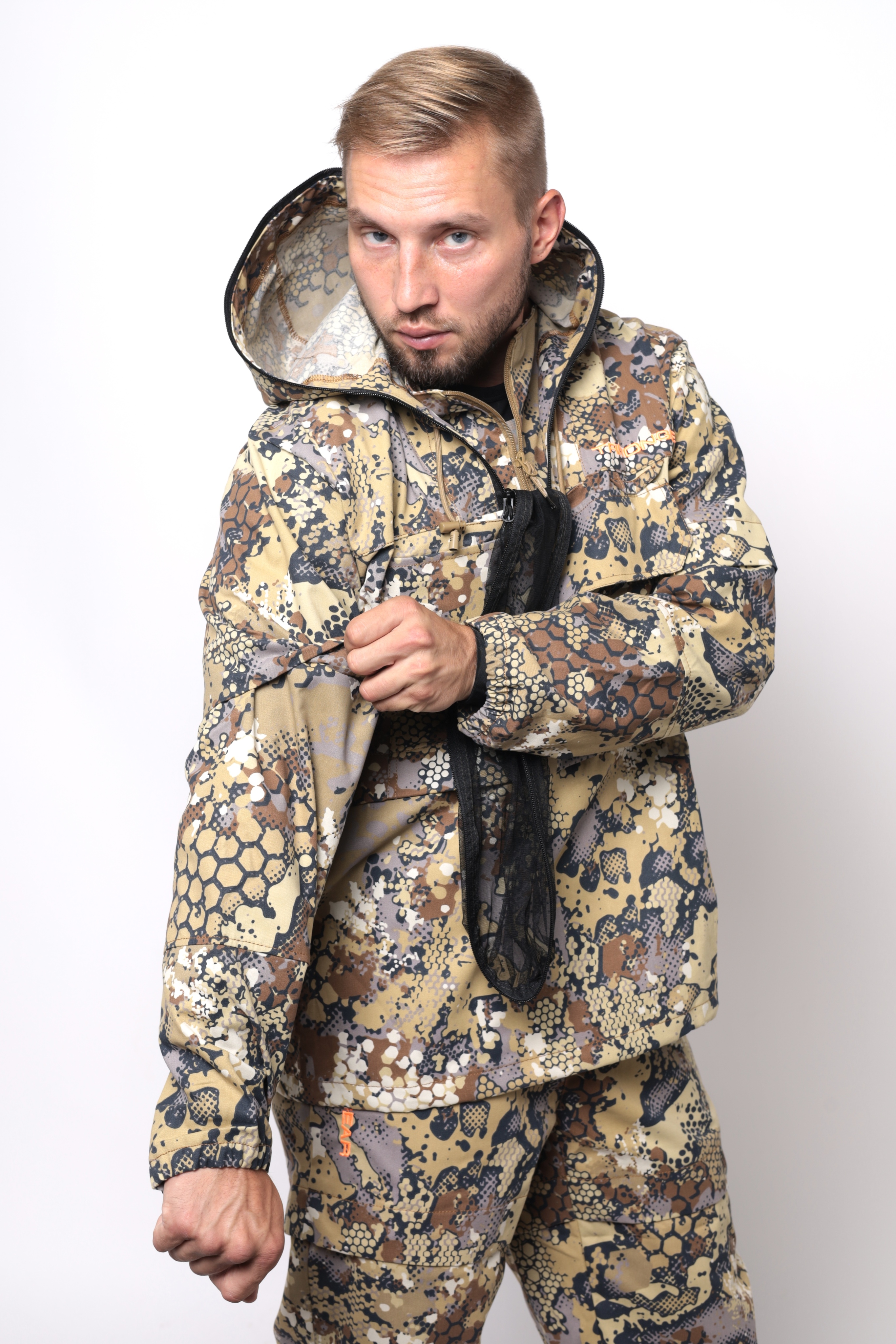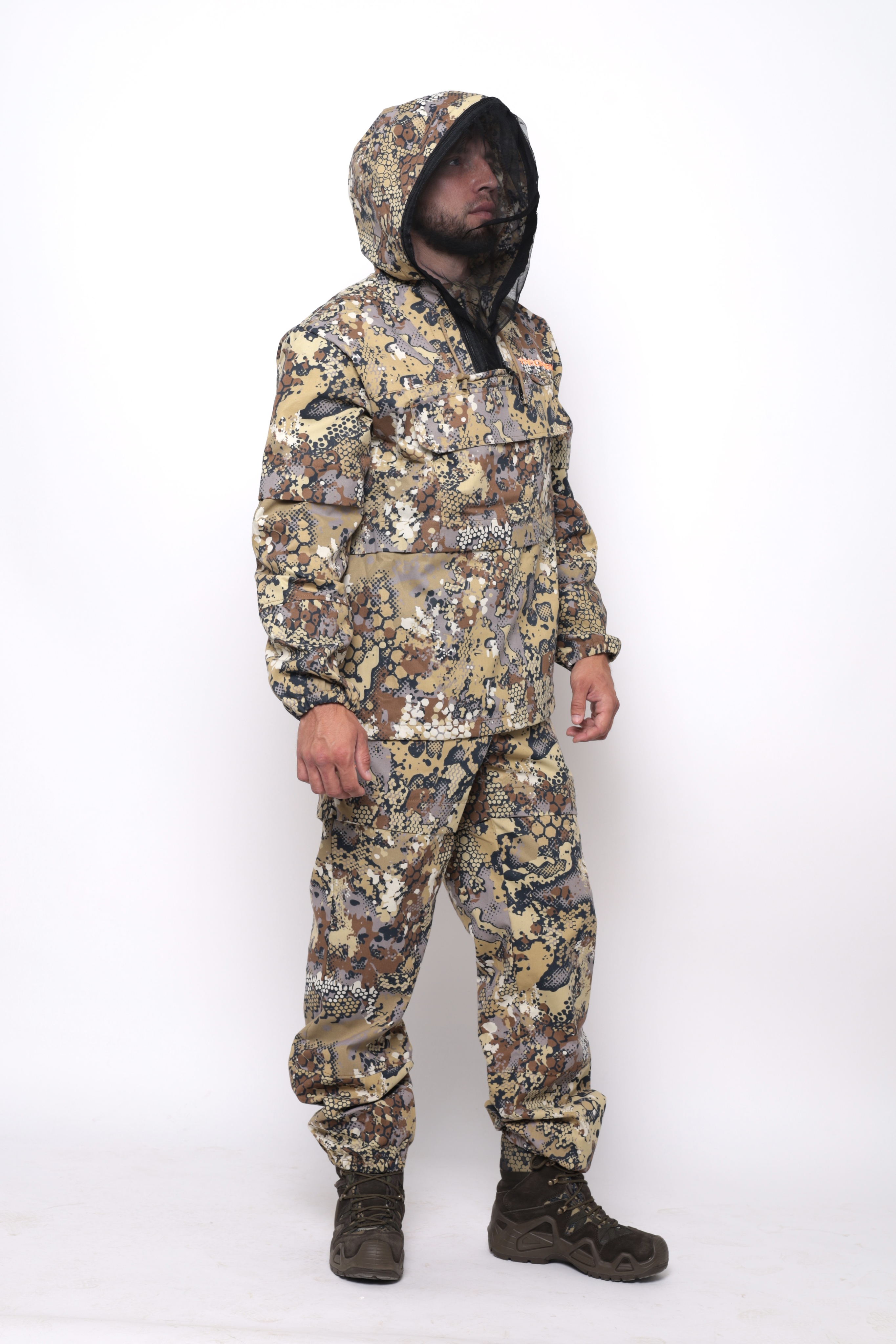 Костюм снабжен регулируемым по объёму капюшоном с фиксаторами и съёмной антимоскитной сеткой с мелкоячеистой структурой, которая прекрасно пропускает свет и не мешает обзору, хорошо защищает от мошек, комаров, гнуса и клещей.