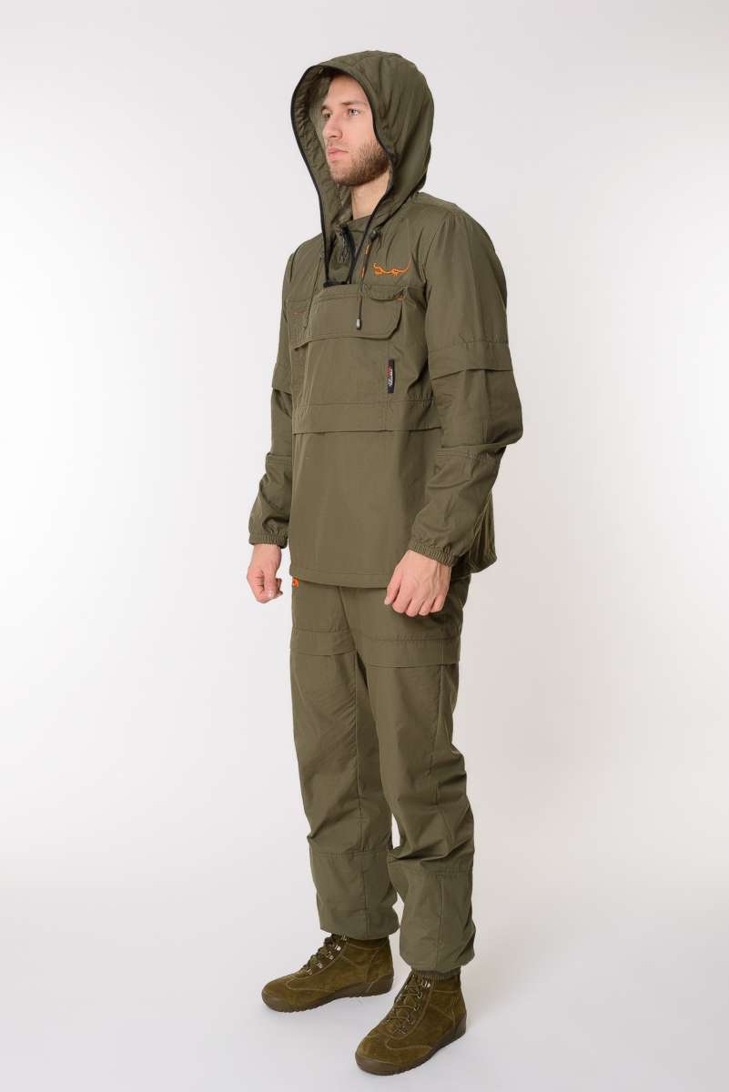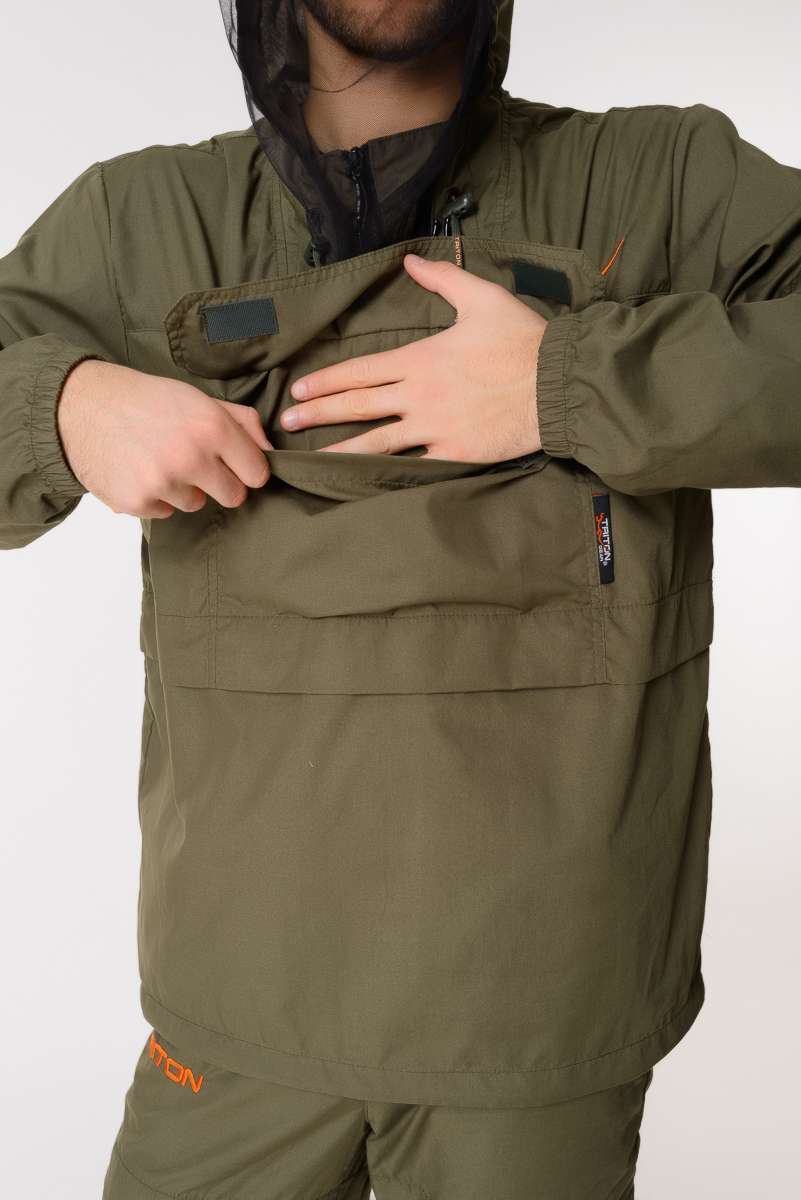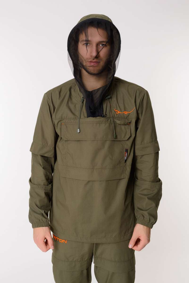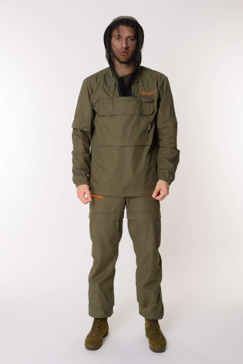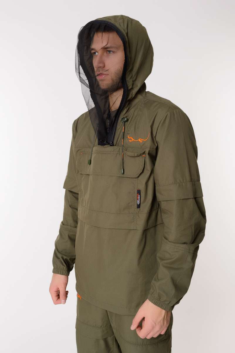 Костюм снабжен регулируемым по объёму капюшоном с фиксаторами и съёмной антимоскитной сеткой с мелкоячеистой структурой, которая прекрасно пропускает свет и не мешает обзору, хорошо защищает от мошек, комаров, гнуса и клещей.