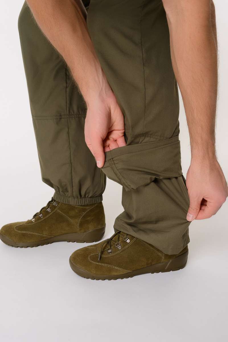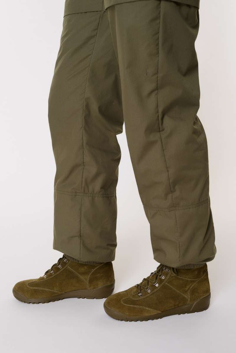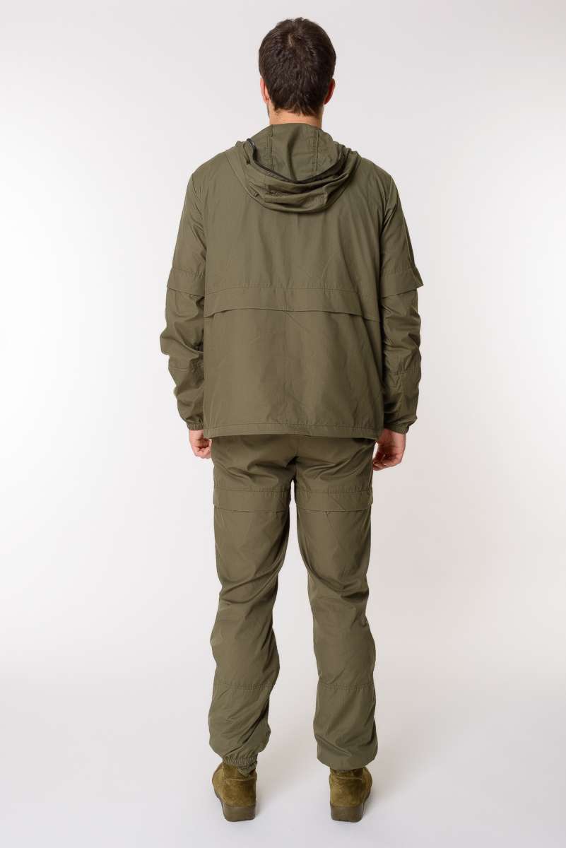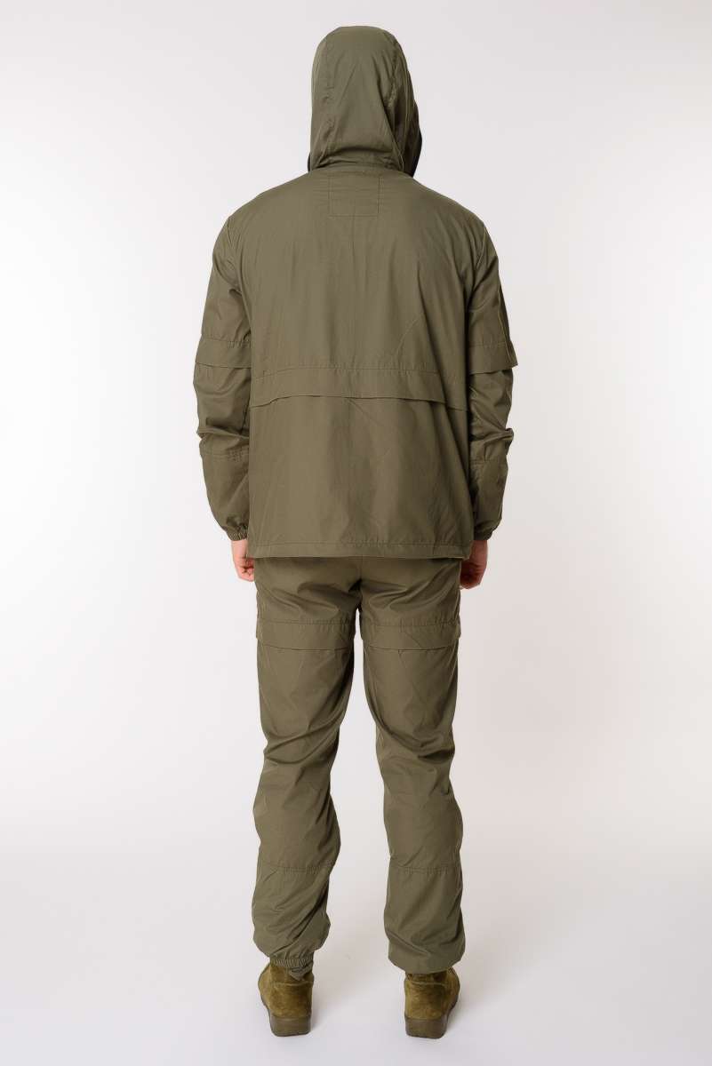 Костюм состоит из куртки и брюк. Изготовлен из ткани сорочка (65% полиэстер, 35% хлопок), благодаря чему он легкий, комфортный, но при этом прочный и надежный в использовании. Цвет зелёный.
