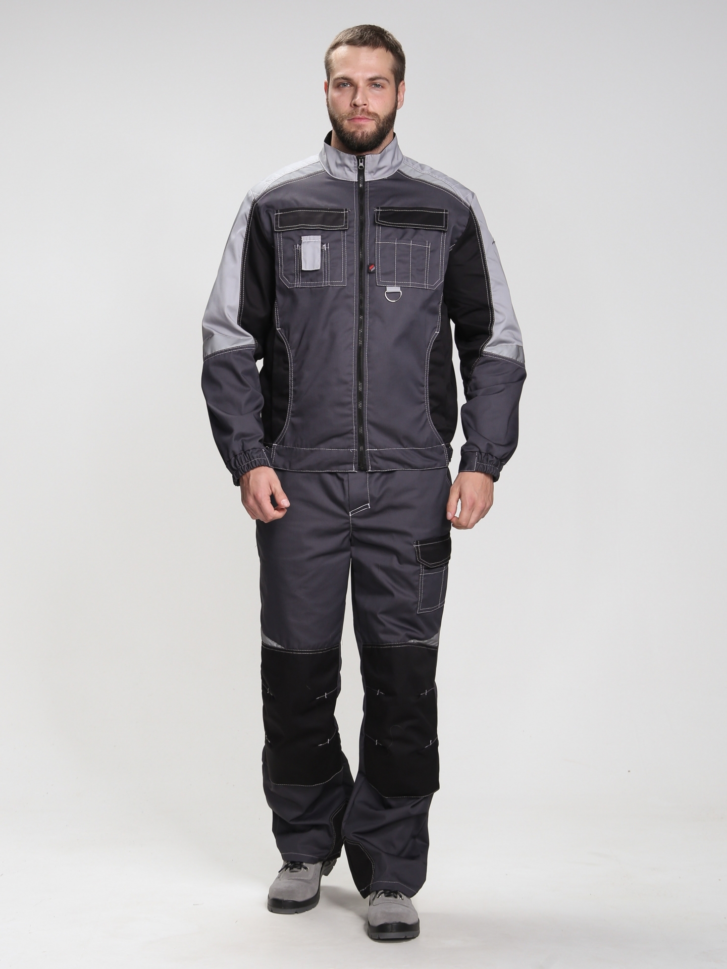Костюм мужской рабочий «Формула» изготовлен в соответствии с ГОСТ и включает в себя два предмета: рабочая куртка мужская + брюки рабочие. Укороченная куртка удобно застегивается на молнию, оснащена поясом с регулировкой по ширине. Для безопасной работы в местах с плохим освещением предусмотрены светоотражающие полосы. Благодаря яркой контрастной отделке рабочая форма заметна издалека даже днем. Боковые и нагрудные карманы с клапаном на липучке предназначены для записей и мелочей. Рабочие брюки усилены дополнительной тканью в районе коленей и шагового шва снизу. В многозональных карманах разного типа и размера удобно хранить инструменты и расходники. Комфортную работу в неудобных позах обеспечивает анатомический крой коленей и локтей, а также возможность размещения ЭВА-вкладышей в карманы-наколенники.