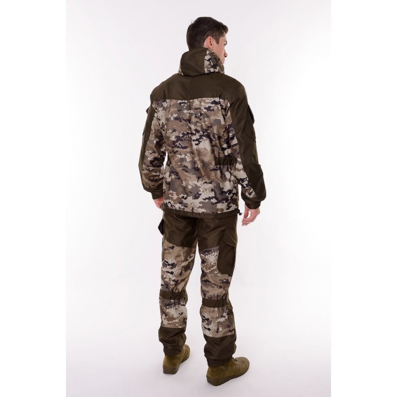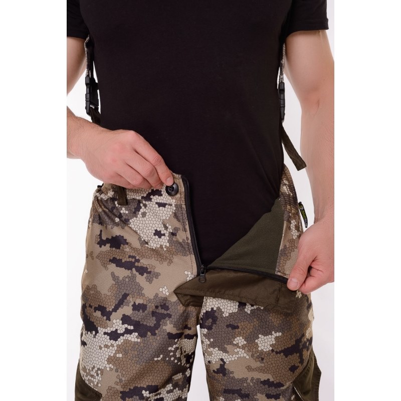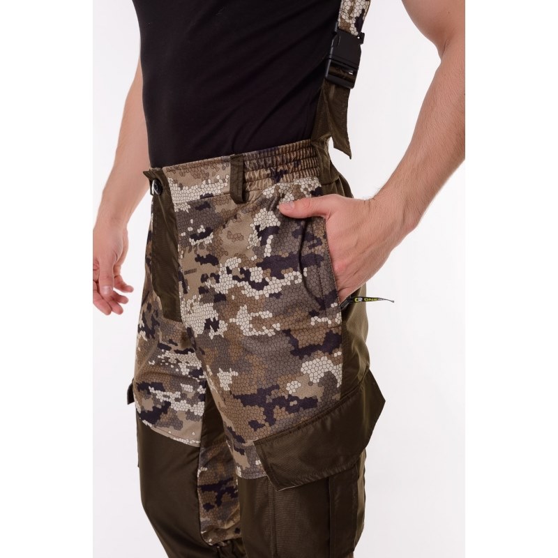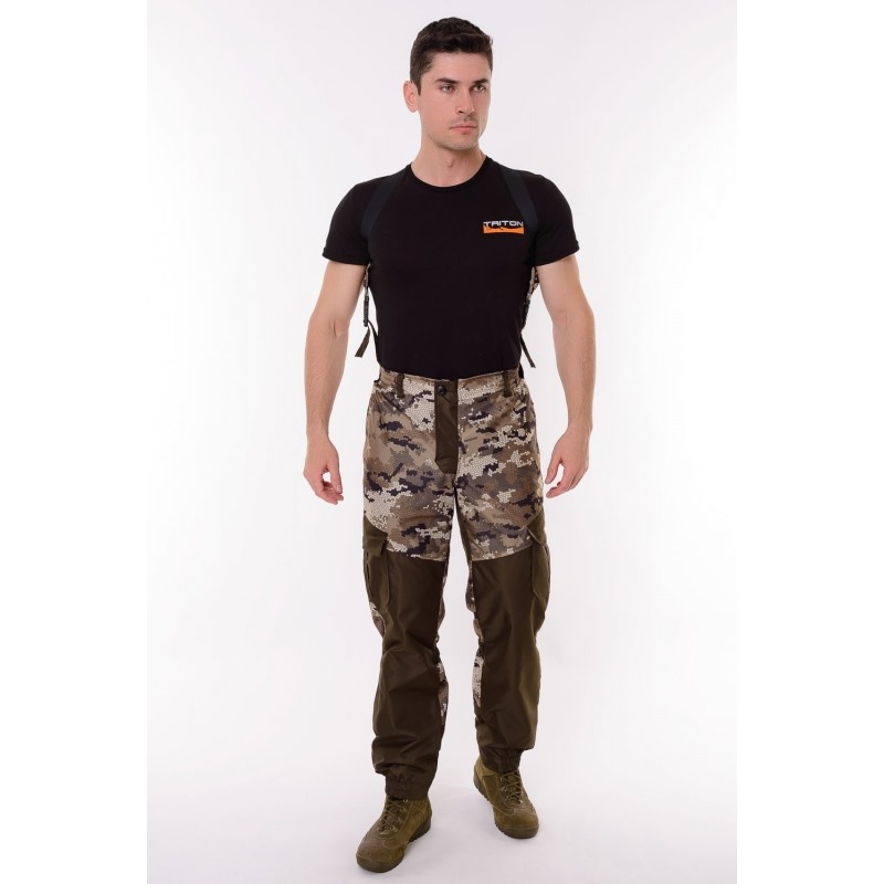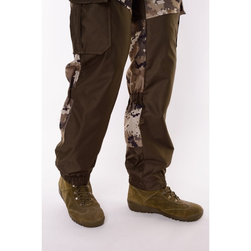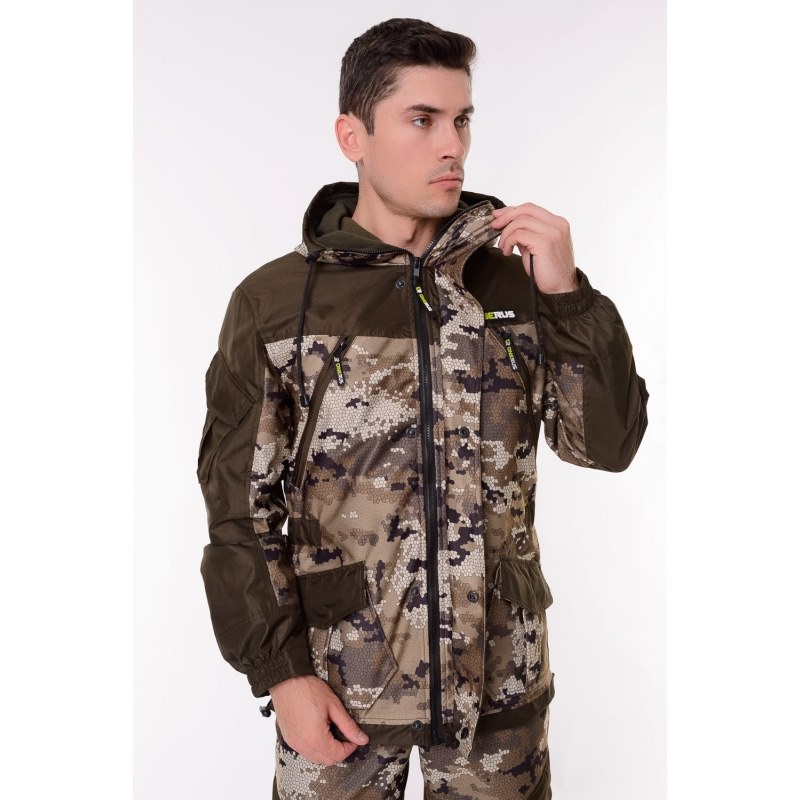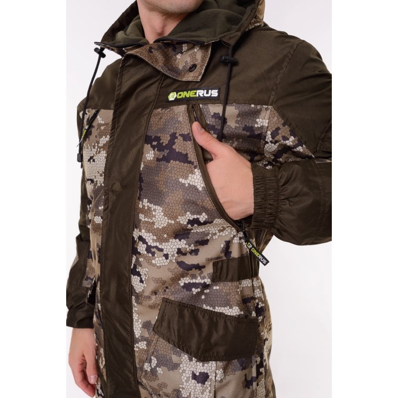 Основная ткань "Алова" (100% полиэстер) - трикотажное полотно с фирменным камуфляжным пиксельным принтом "OneRus", покрытое с изнаночной стороны влагоотталкивающей паропроницаемой мембранной пленкой, благодаря чему испарения выводятся с поверхности тела наружу, а с другой стороны создается защита от ветра и проникновения влаги, тем самым обеспечивается комфорт при носке и занятиях любимым увлечением. Цвет бежевый.