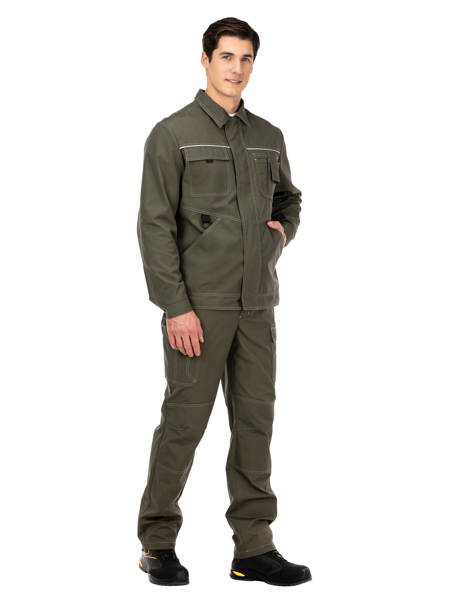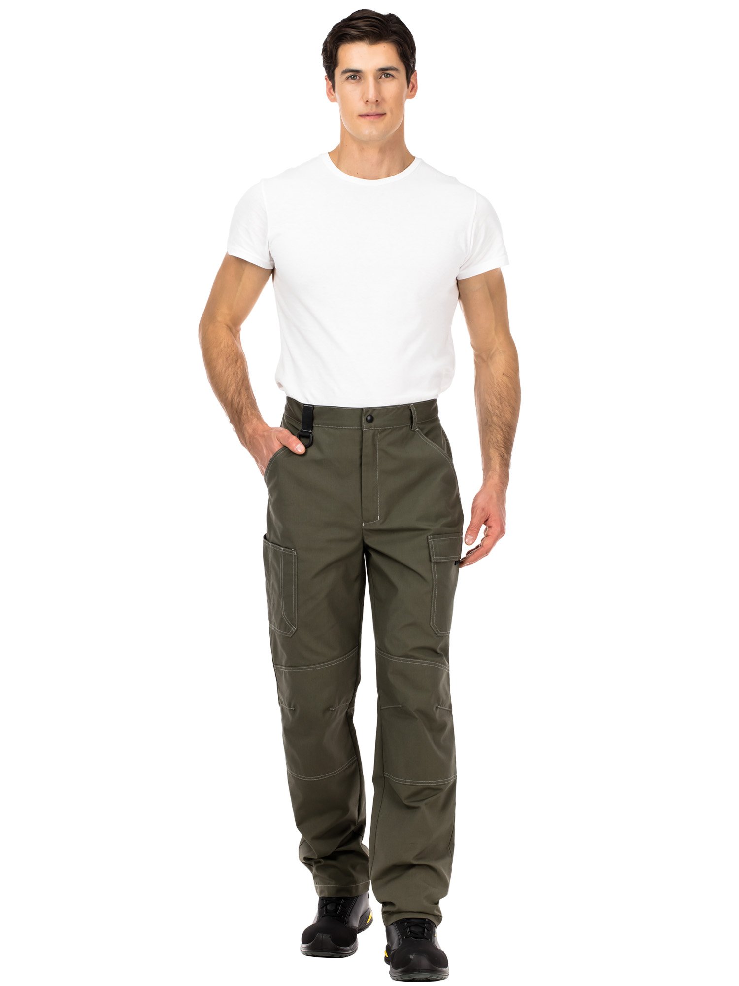 Брюки с застежкой на гульфик с молнией и кнопкой на поясе, а также внутренним хлястиком с петлей и пуговицей. Пояс со шлевками для ремня, одна из них с пластиковым полукольцом для крепления пропуска или карабина. Регулировка объема пояса брюк возможна при помощи хлястиков с кнопками. На передних половинках - верхние карманы с боковым входом. Боковые накладные карманы: карман с клапаном, а также карман с отделениями для инструментов различного размера. Усилительные накладки в области колен. На задних половинках – вместительные верхние карманы от боковых швов.