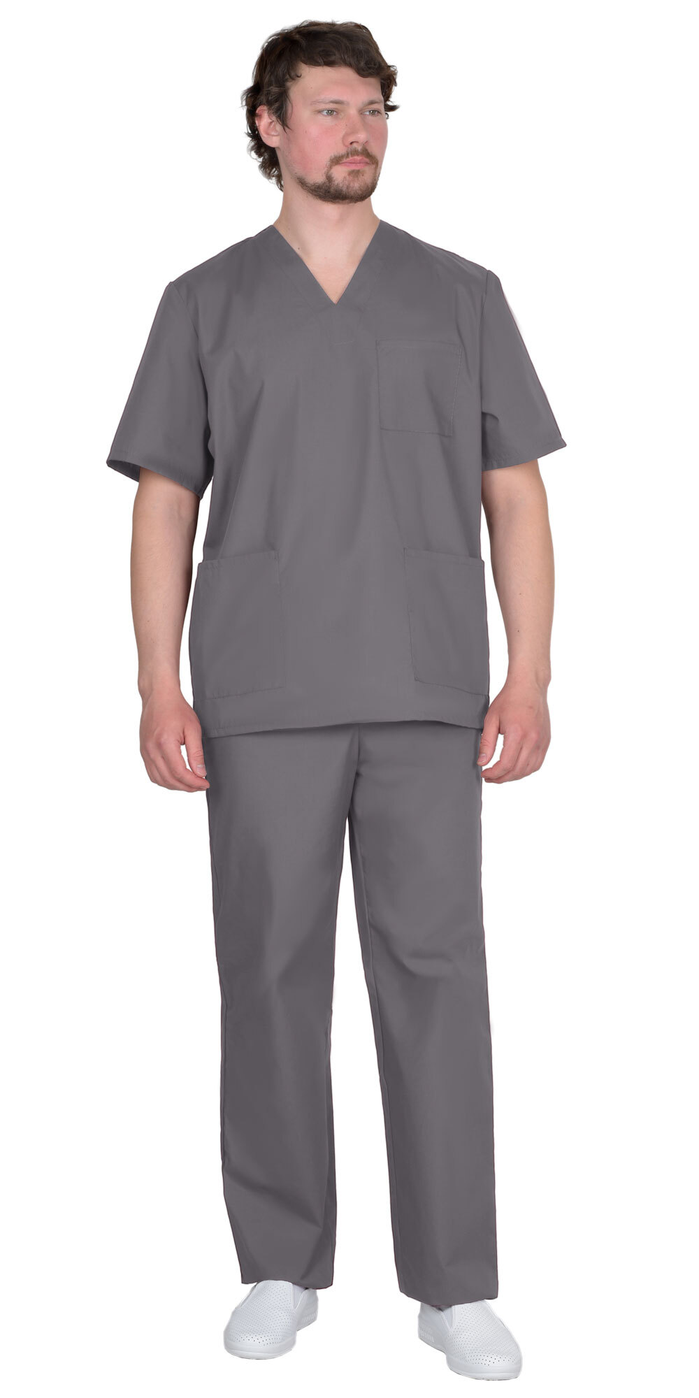 Костюм для мед-персонала состоит из куртки и брюк свободного покроя. Куртка прямого силуэта с V-образным вырезом горловины, оснащена накладными карманами в т.ч нагрудным карманом на левой стороне полочки. Втачные короткие рукава имеют свободу облегания. Брюки прямые с поясом на резинке.