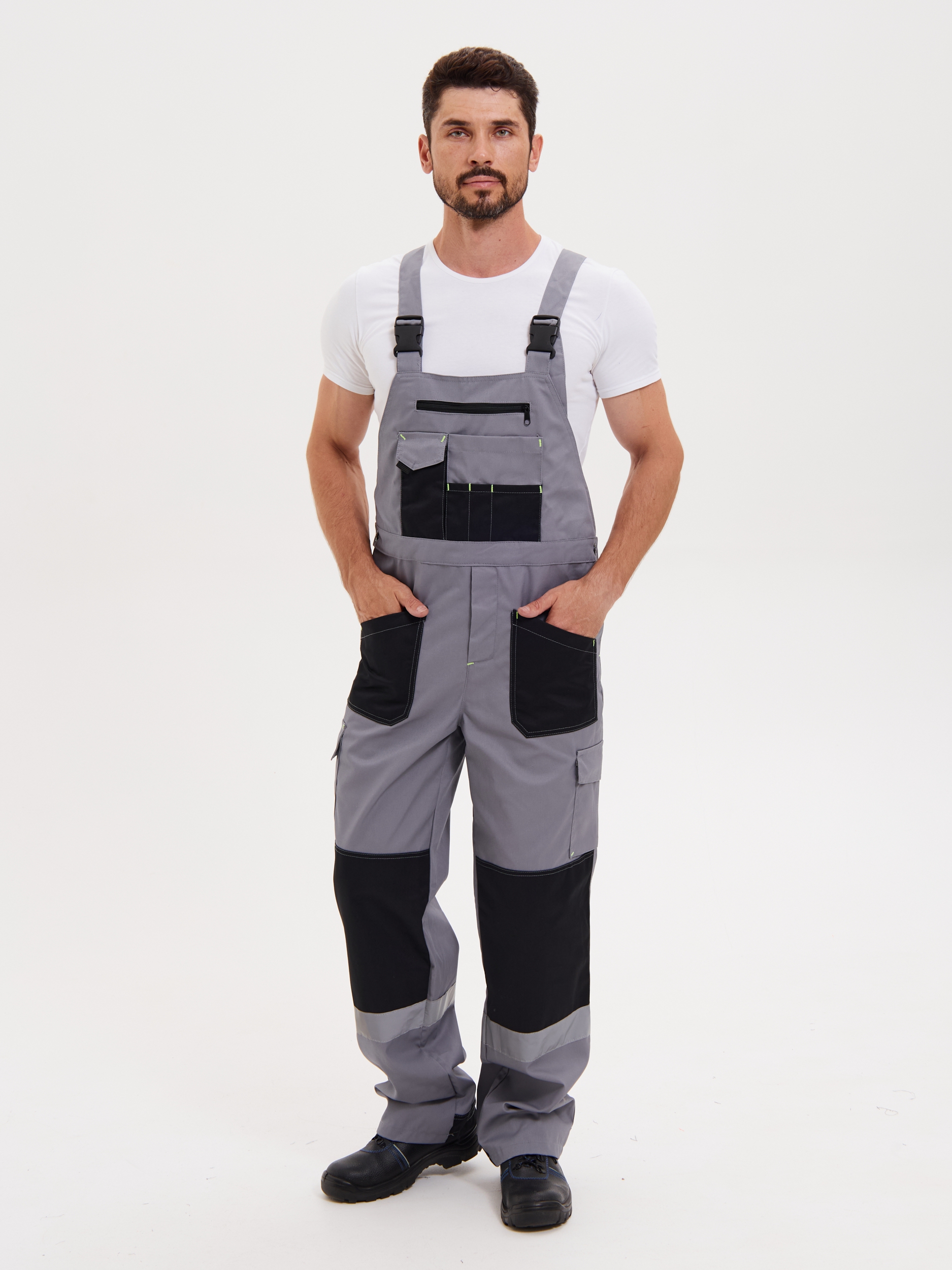Полукомбинезон со спинкой, на регулируемых лямках. Имеет центральный карман на молнии, накладной карман с дополнительным отделом для средства связи, два вместительных кармана с верхним входом на молнии. Выше колен расположены дополнительные карманы с клапанами на контактной ленте. Сзади имеется два вместительных кармана с клапанами. В области коленей и низа комбинезона имеются усиления. Комбинезон по линии талии - на резинке, объём в поясе регулируется при помощи пуговиц.